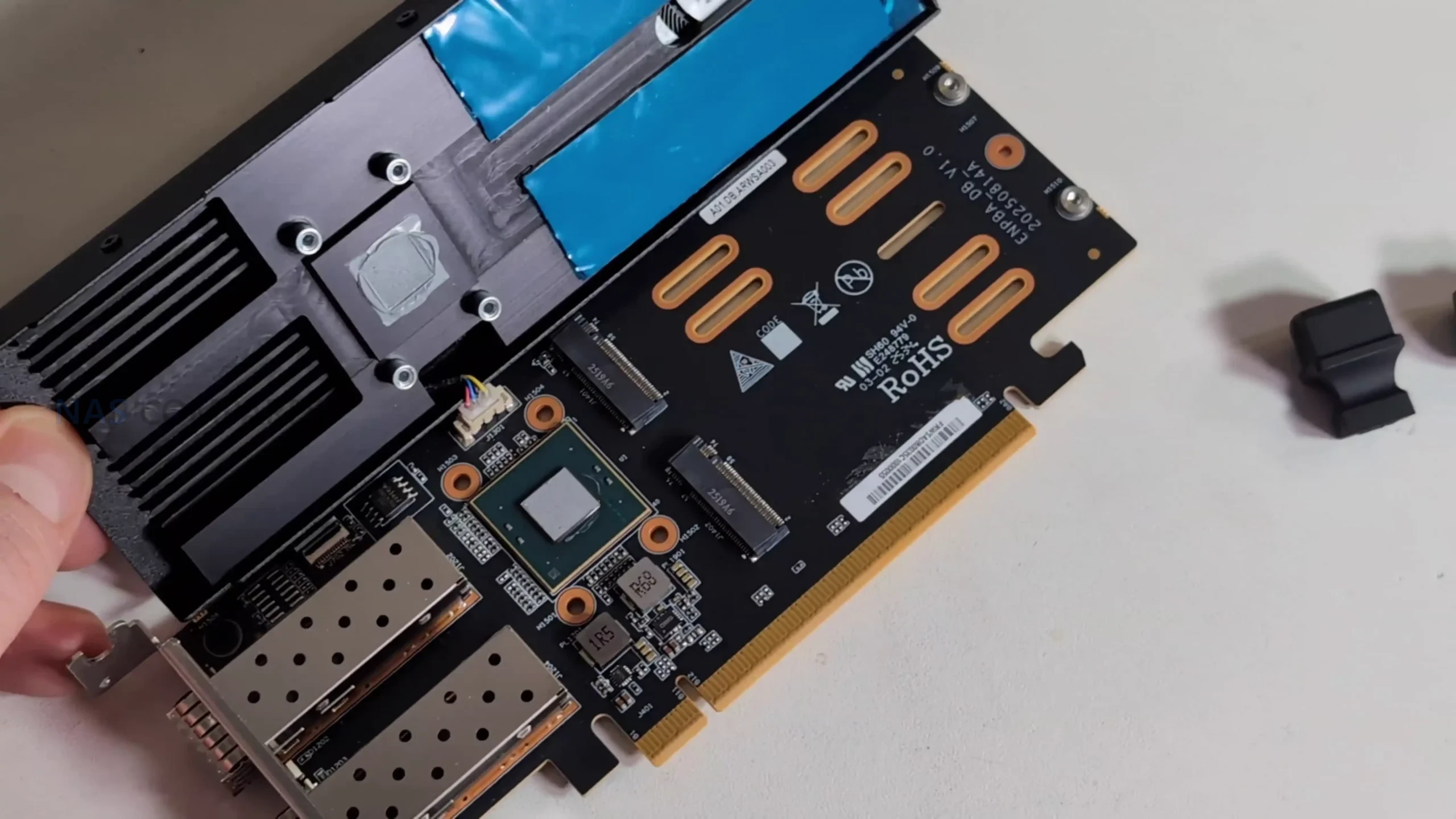 The MS-02 Ultra’s networking implementation is centered around a PCIe-based combo card that integrates dual 25GbE SFP+ ports with two additional M.2 NVMe slots. This card is installed in the PCIe 4.0 x16 position rather than the PCIe 5.0 slot, and it includes a dedicated controller with active cooling and heatsinks that cover both the networking and storage components.