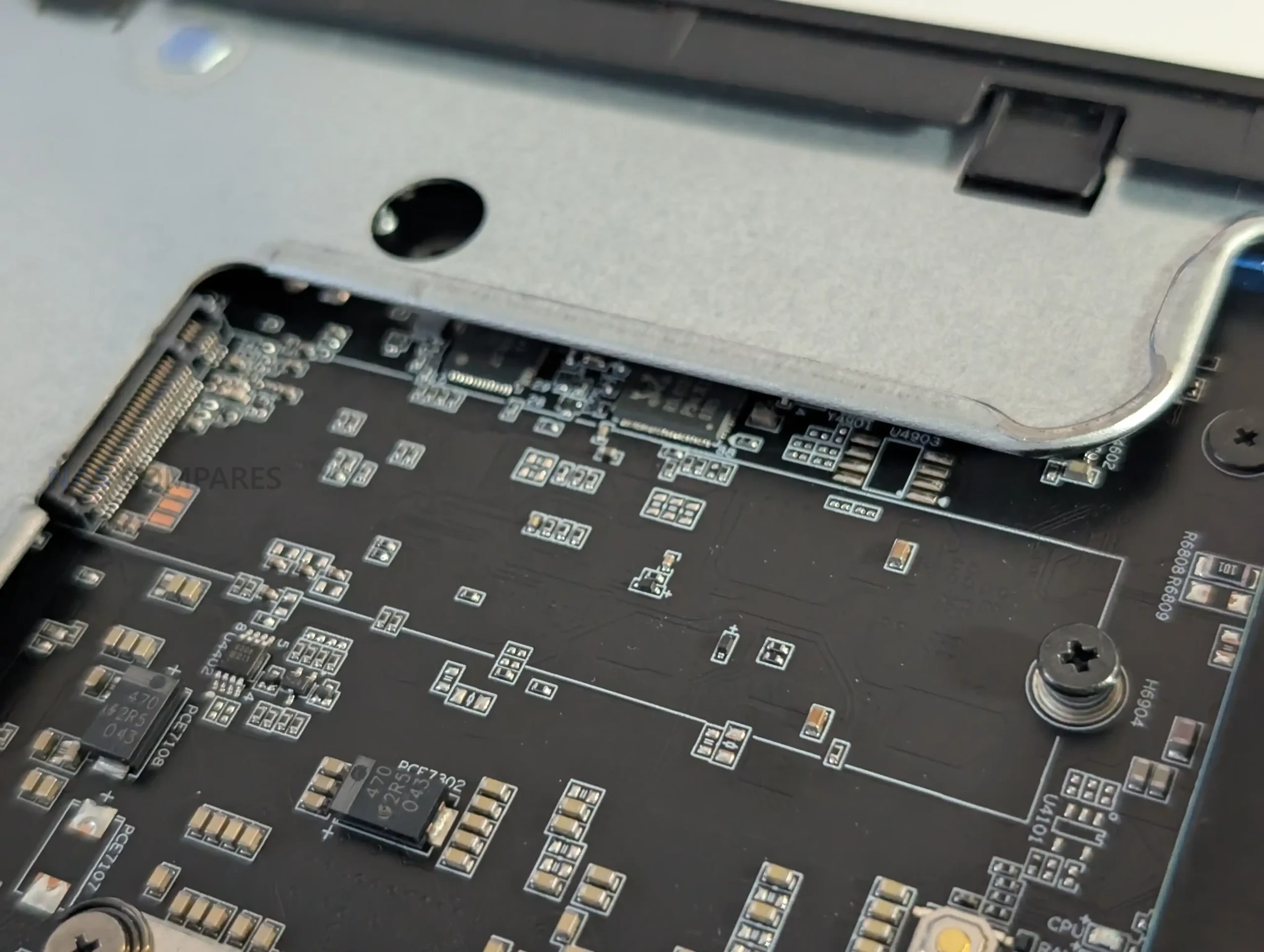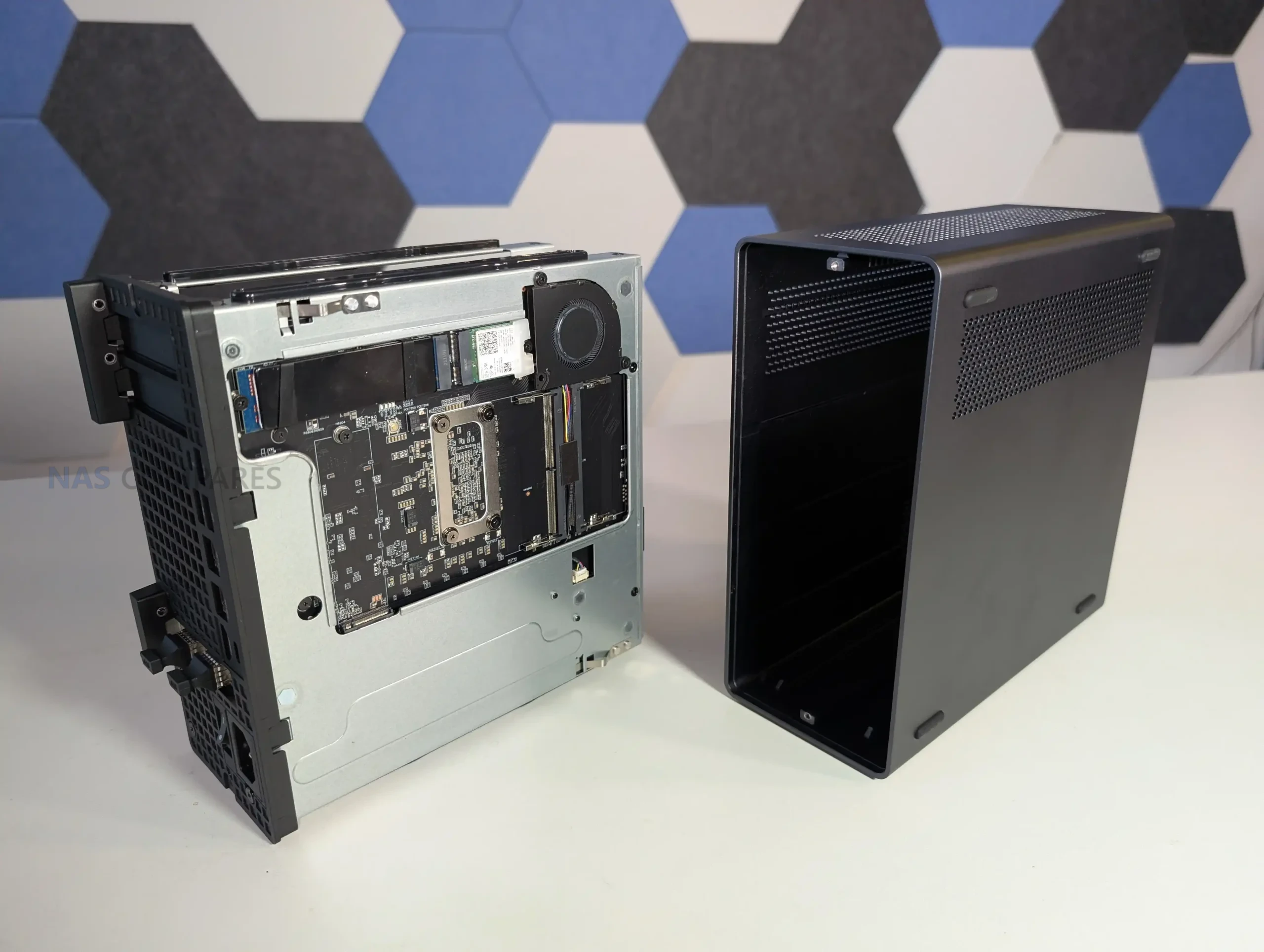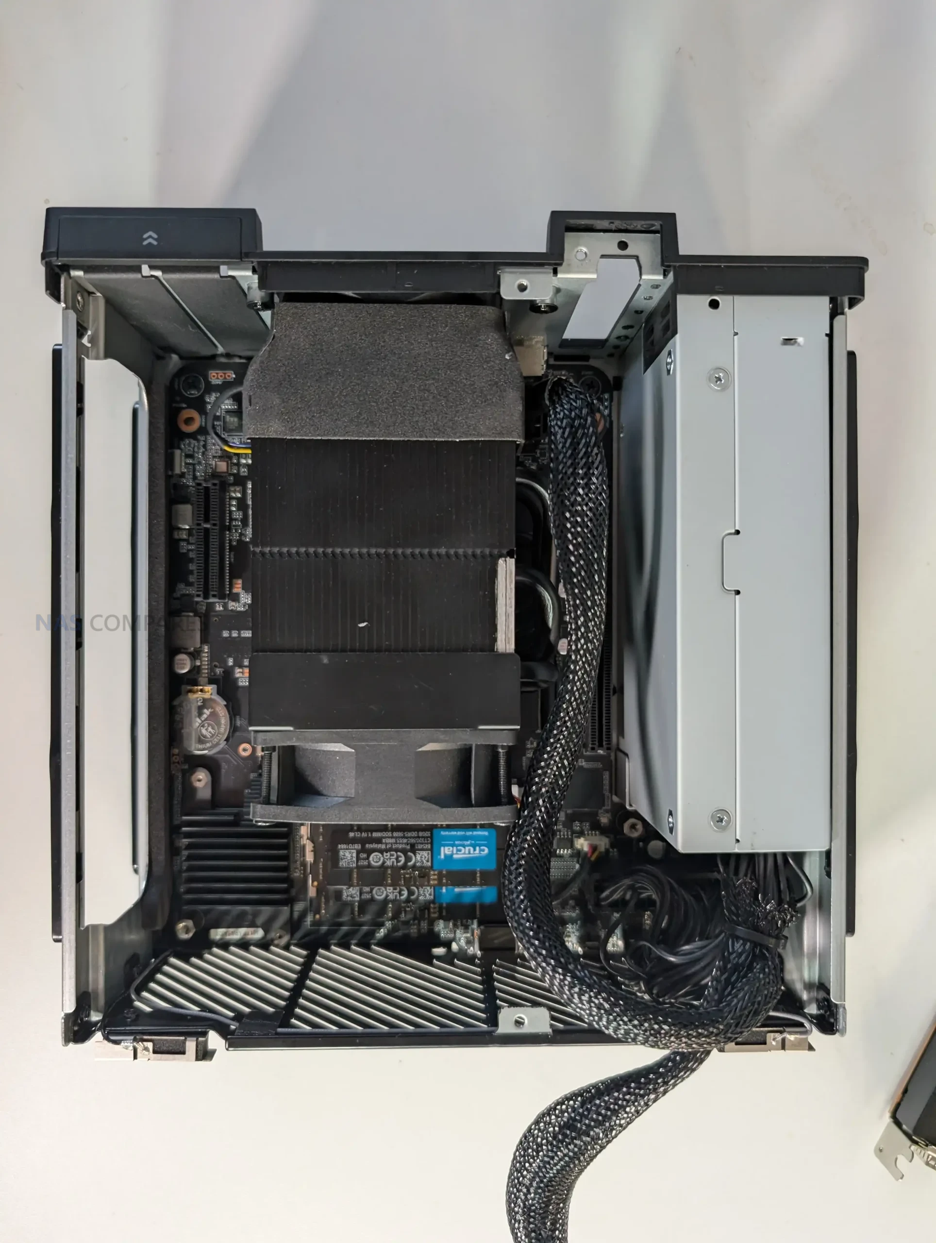 The placement of internal components reflects the limited spatial tolerance of the 4.8-liter enclosure. The internal 350 W PSU occupies a significant section of the lower frame and includes additional power leads intended for low-profile GPU or accelerator cards, something rarely present in machines of this size. The motherboard runs across most of the horizontal section and positions the CPU vapor-chamber cooler toward the middle, while memory slots, NVMe connectors, and the PCIe riser for the combo NIC occupy the remaining pockets of available space.