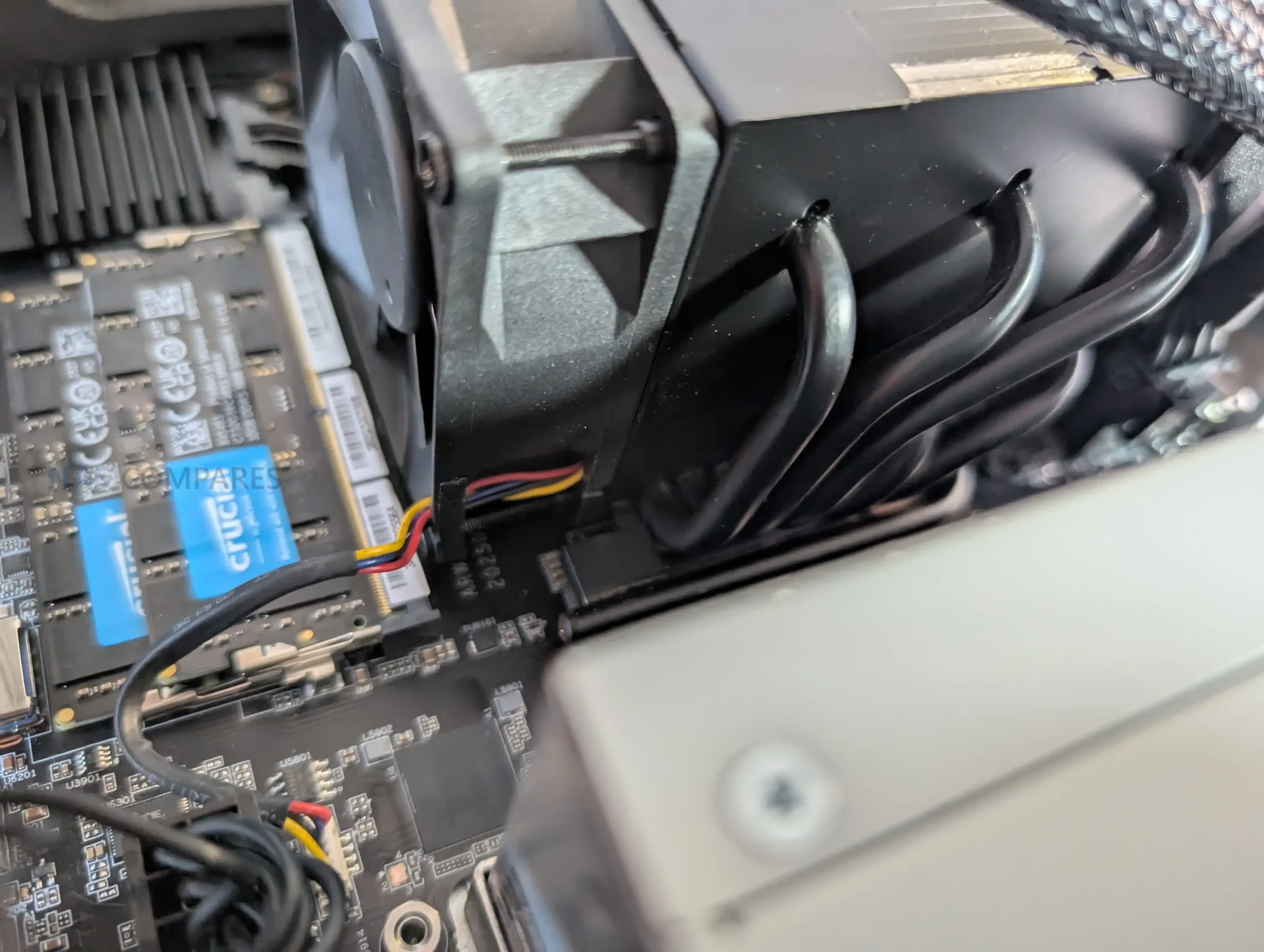 Because cooling pipes and the ventilation housing sit directly above the CPU-side memory slots, Minisforum added a custom angled heatsink to ensure airflow reaches these modules. This results in a serviceable layout but one that requires more deliberate disassembly, as the compact structure prioritizes component density and thermal guidance over ease of access or open internal spacing.