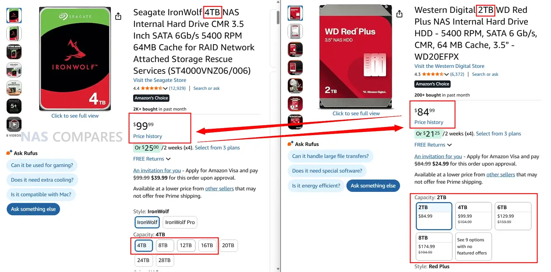 Where WD changes the picture is through its own direct store. WD sells Red, Red Plus and Red Pro drives through its retail site and often undercuts third party resellers by a noticeable margin, especially during promotions. That means in some regions the cheapest way to buy WD is directly from WD, while Seagate relies entirely on partner channels and keeps relatively steady discounting through Amazon and similar outlets. As a result it is common to see Seagate come out cheaper in most general marketplaces while WD can be the lowest price only on its own store, which is not available in every country.