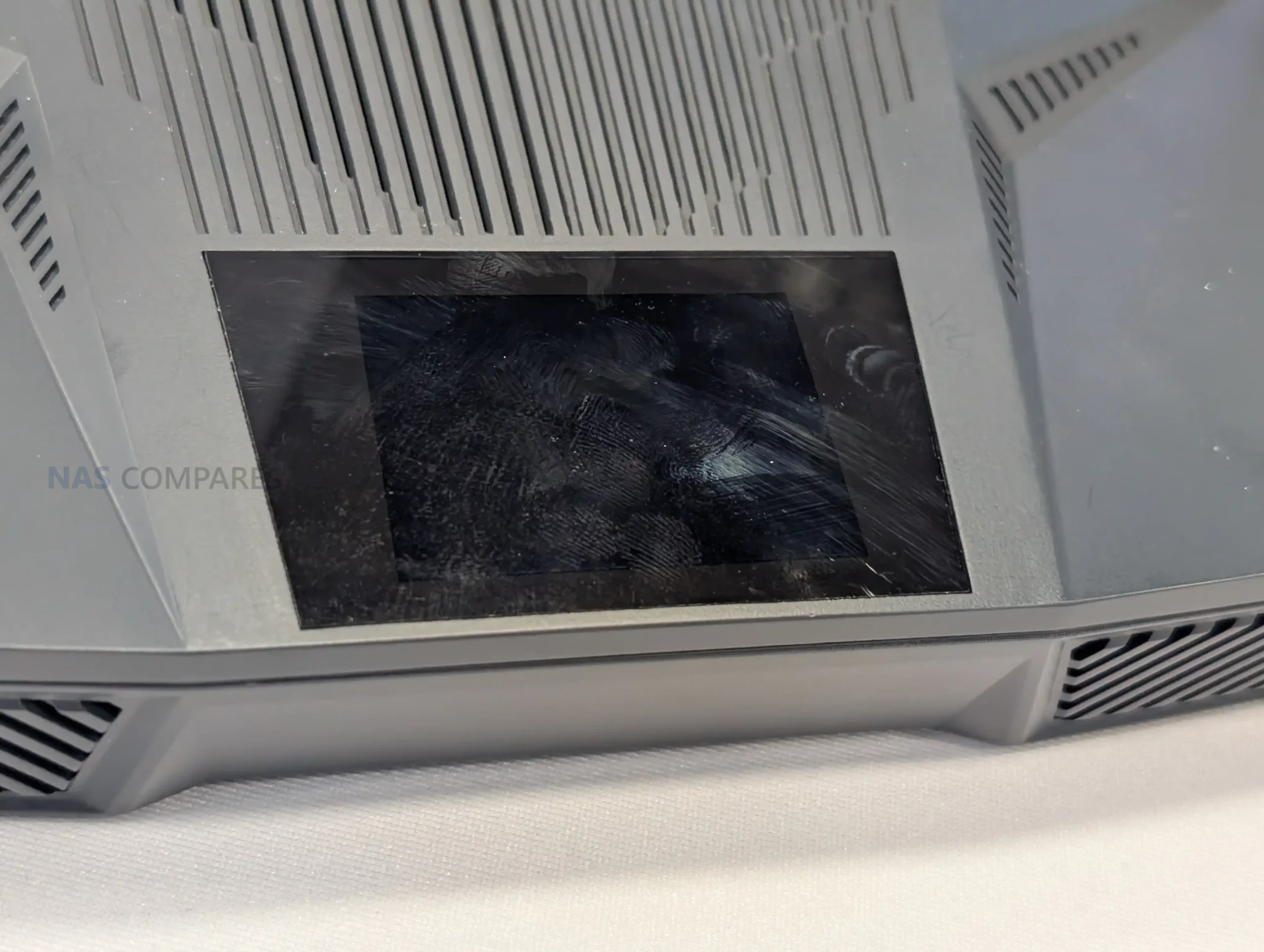 A top-mounted touchscreen display is built into the design, which is a change from the typical Flint-style front-panel indicators. GL.iNet has not stated what the interface will expose in retail firmware, but the inclusion suggests on-device visibility for status and basic controls rather than relying solely on a browser or app for routine checks.