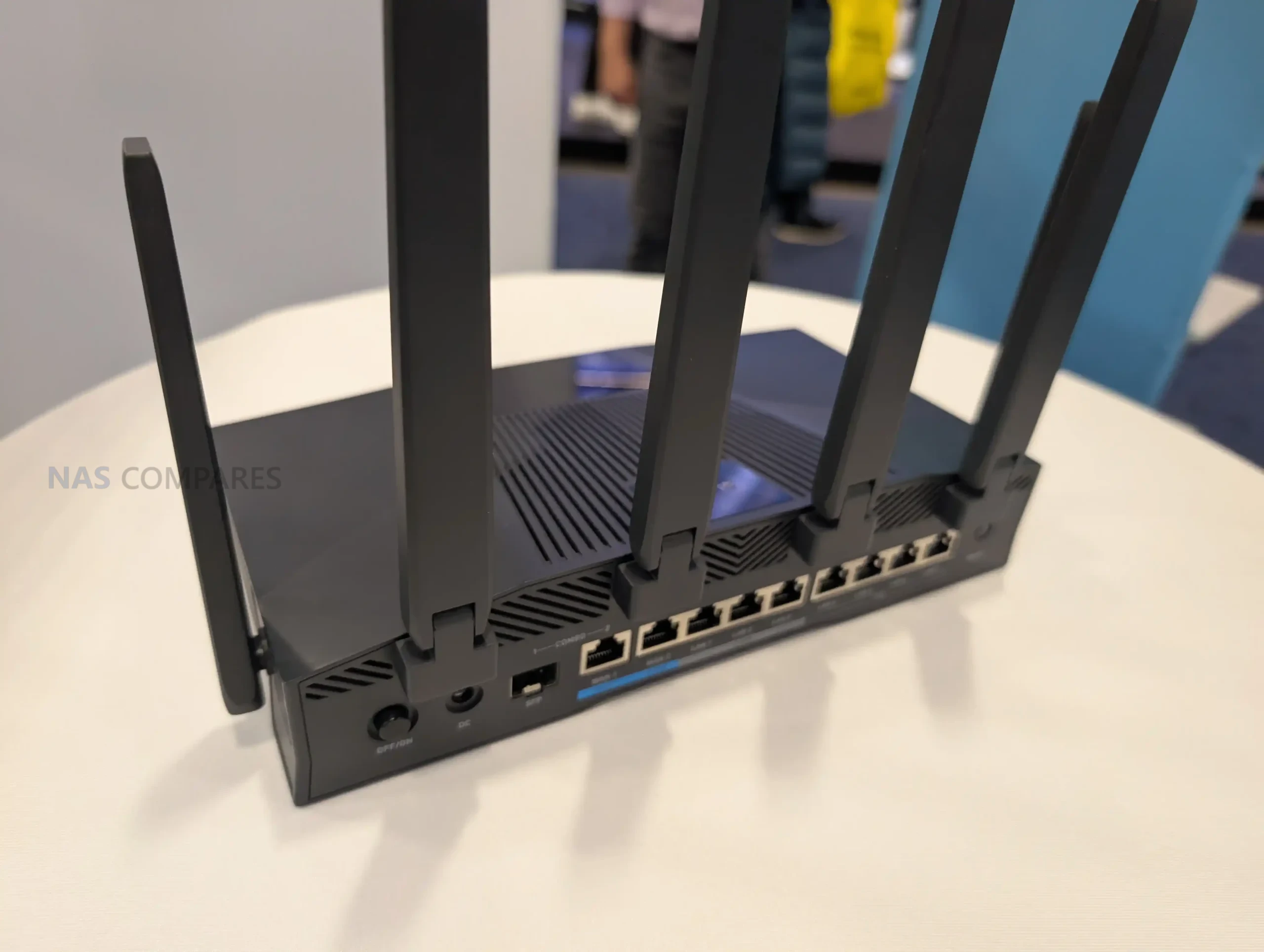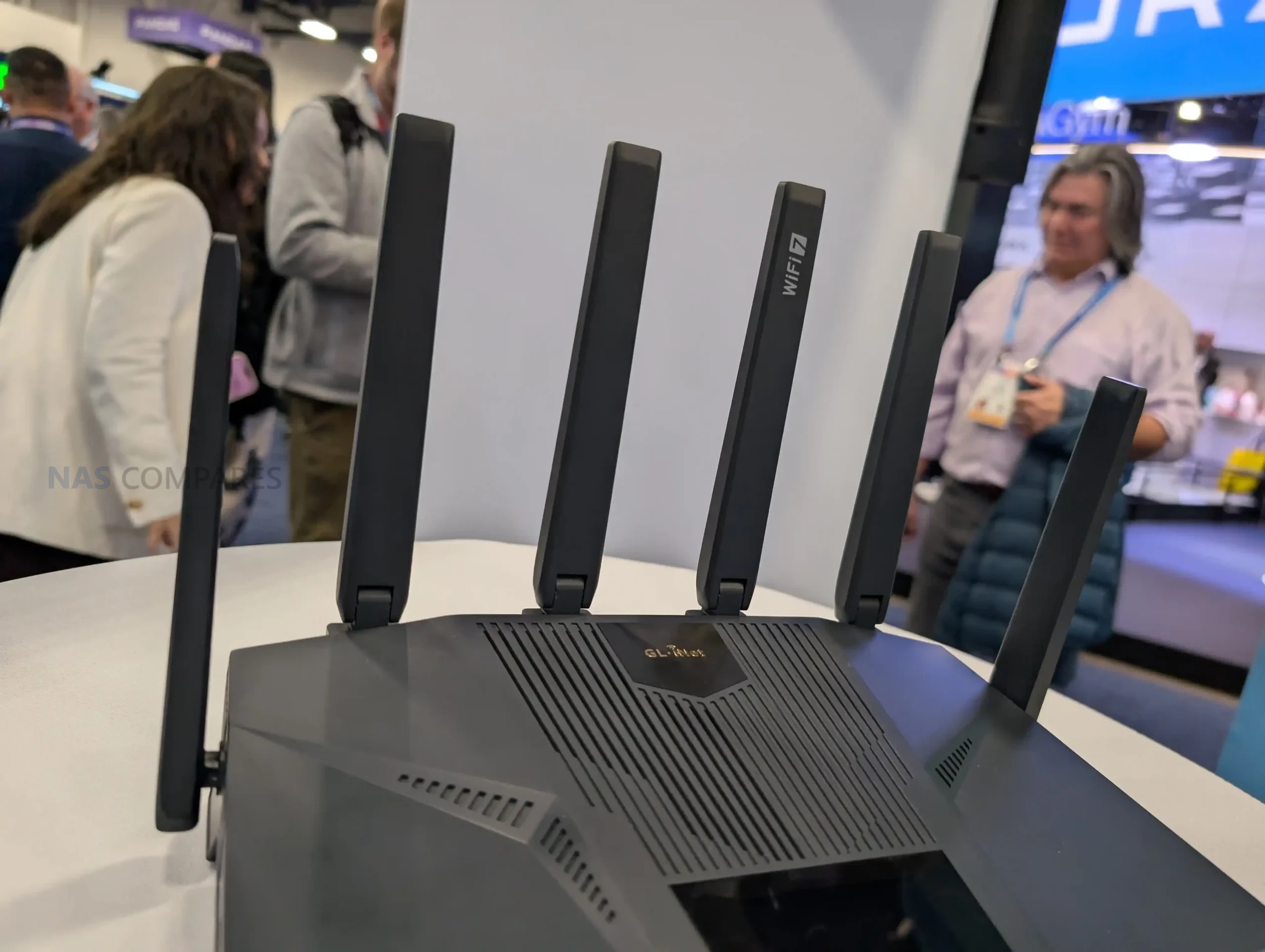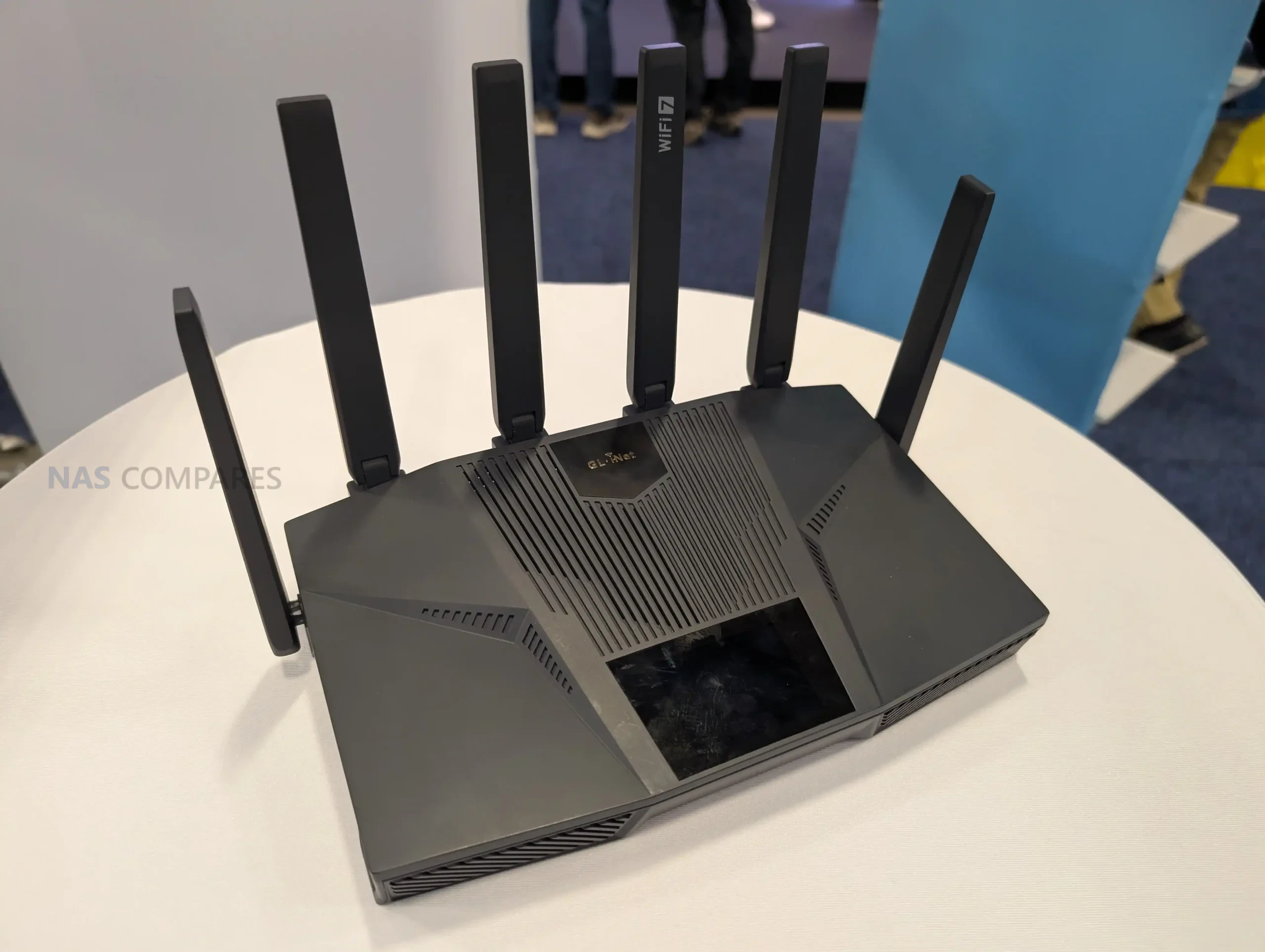 GL.iNet used CES 2026 to preview the Flint 4 as an in-development desktop router, and the prototype shown on the stand reads like a higher-tier extension of what the Flint line has been building toward. The unit on display pairs a more “feature-forward” exterior, including a top-mounted touchscreen, with a port layout aimed at users who want multiple wired speeds in a single device: a 10GbE option via a shared SFP or copper connection, several 2.5GbE ports, and additional 1GbE LAN ports. On the wireless side, it is presented as a Wi-Fi 7 platform expected to cover 2.4 GHz, 5 GHz, and 6 GHz, with 6 external movable antennas, but GL.iNet has not yet locked down details such as whether it stays strictly tri-band or adds a second 5 GHz radio. With RAM and storage still unconfirmed, the safest way to view Flint 4 at this stage is as a prototype focused on connectivity and interface direction rather than a finalized retail spec sheet.