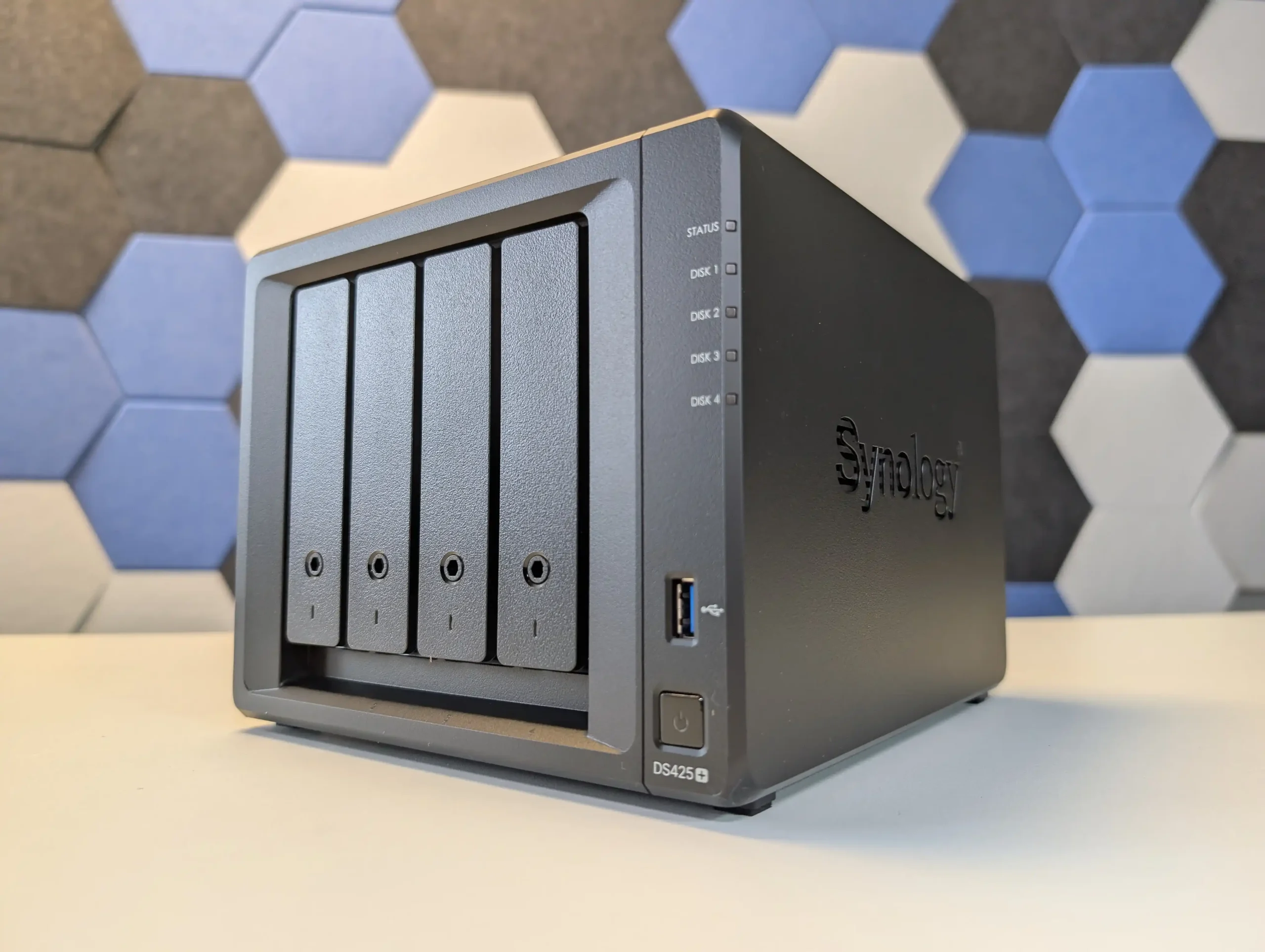 The Synology DS425+ takes a more conservative hardware route, using the Intel Celeron J4125 with four cores running at 2.0 GHz base and 2.7 GHz burst. It includes 2 GB of DDR4 memory, expandable to 6 GB, and offers one 2.5 GbE port alongside a 1 GbE port. Two M.2 NVMe slots are available but only for cache acceleration, not full storage pools. Sequential throughput typically reaches about 280 MB/s for reads and writes. Against the F4-425 PLUS, Synology’s system trails in memory, raw processing speed, and throughput potential, but maintains an advantage in software polish and long-term reliability through DSM integration.