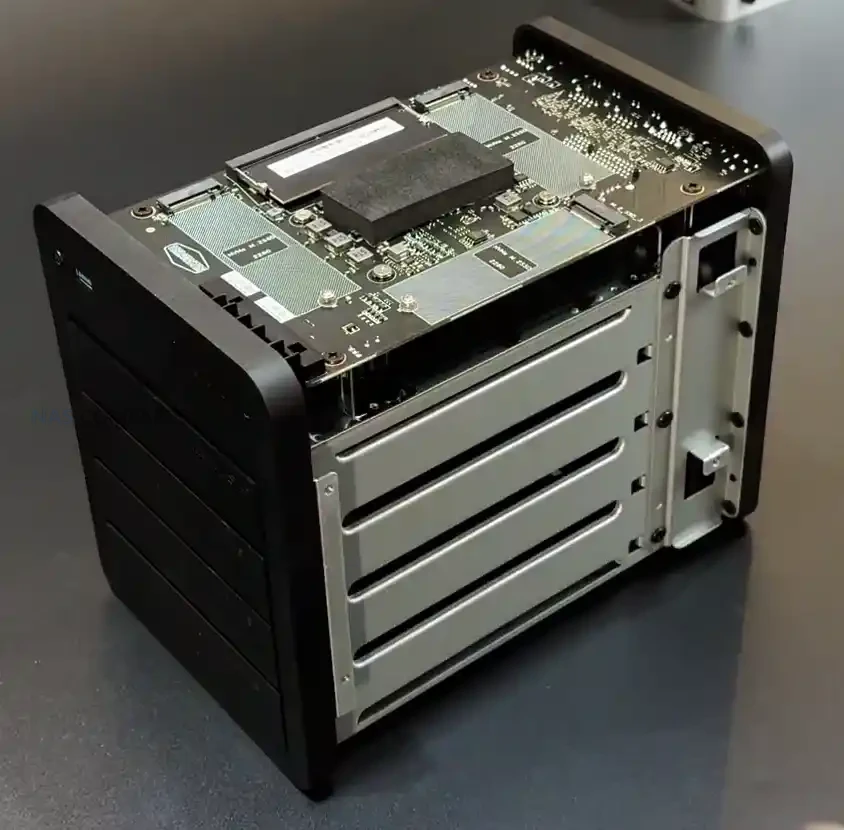 Cooling and chassis design remain consistent with Terramaster’s recent metal-based enclosures, using active fan ventilation with independent drive bay access. The F4-425 PLUS features dual rear fans to maintain airflow across four bays, while the F2-425 PLUS employs a single high-efficiency unit. The new layout provides improved front-to-rear ventilation and easier access to drive trays. Internally, the systems do not include a PCIe expansion slot, which limits the potential for GPU or high-speed NIC upgrades but simplifies internal lane allocation for the CPU’s nine available PCIe lanes. Terramaster appears to have distributed these lanes between the three M.2 interfaces and dual network controllers to maintain balanced throughput across all functions.