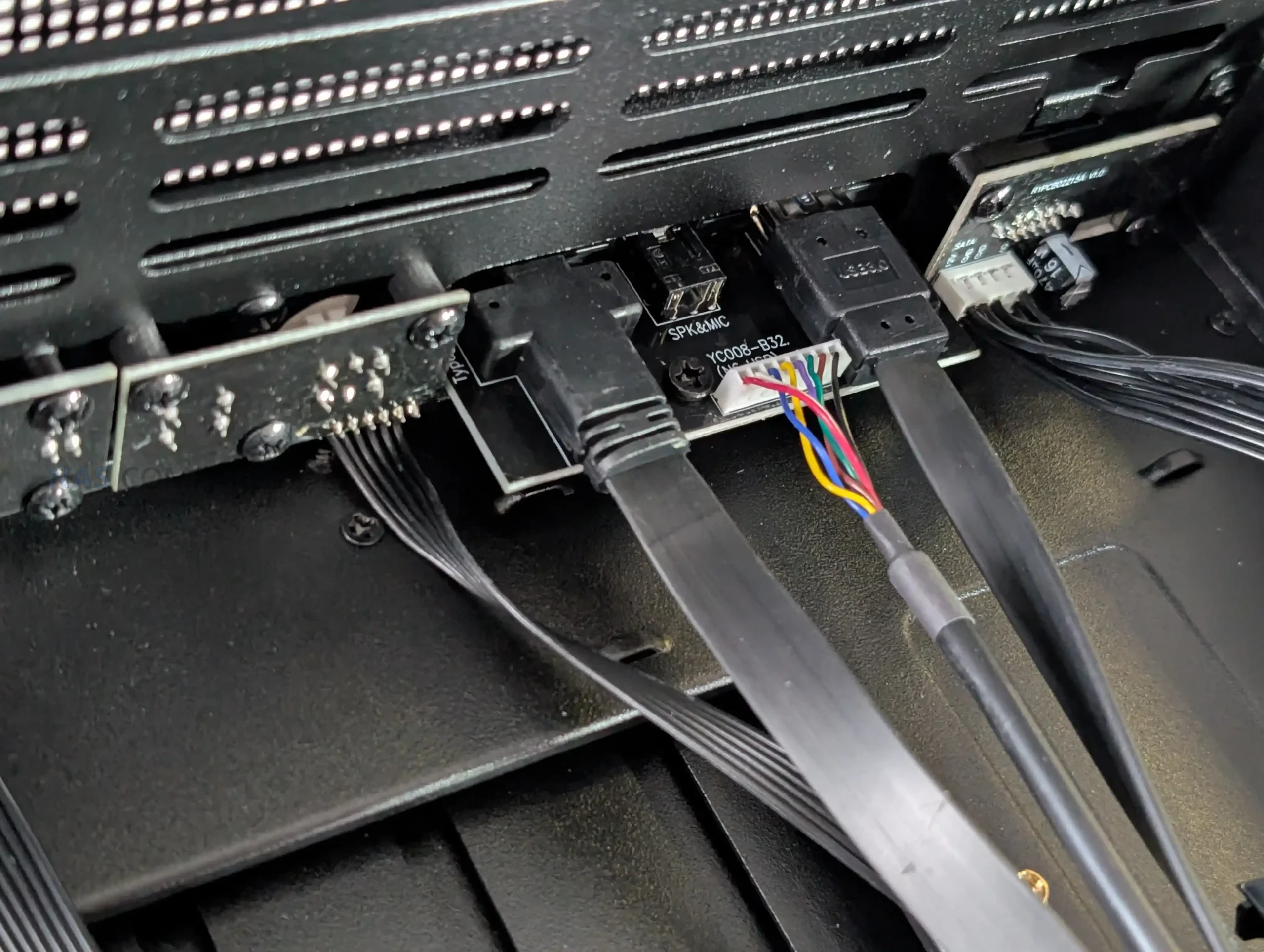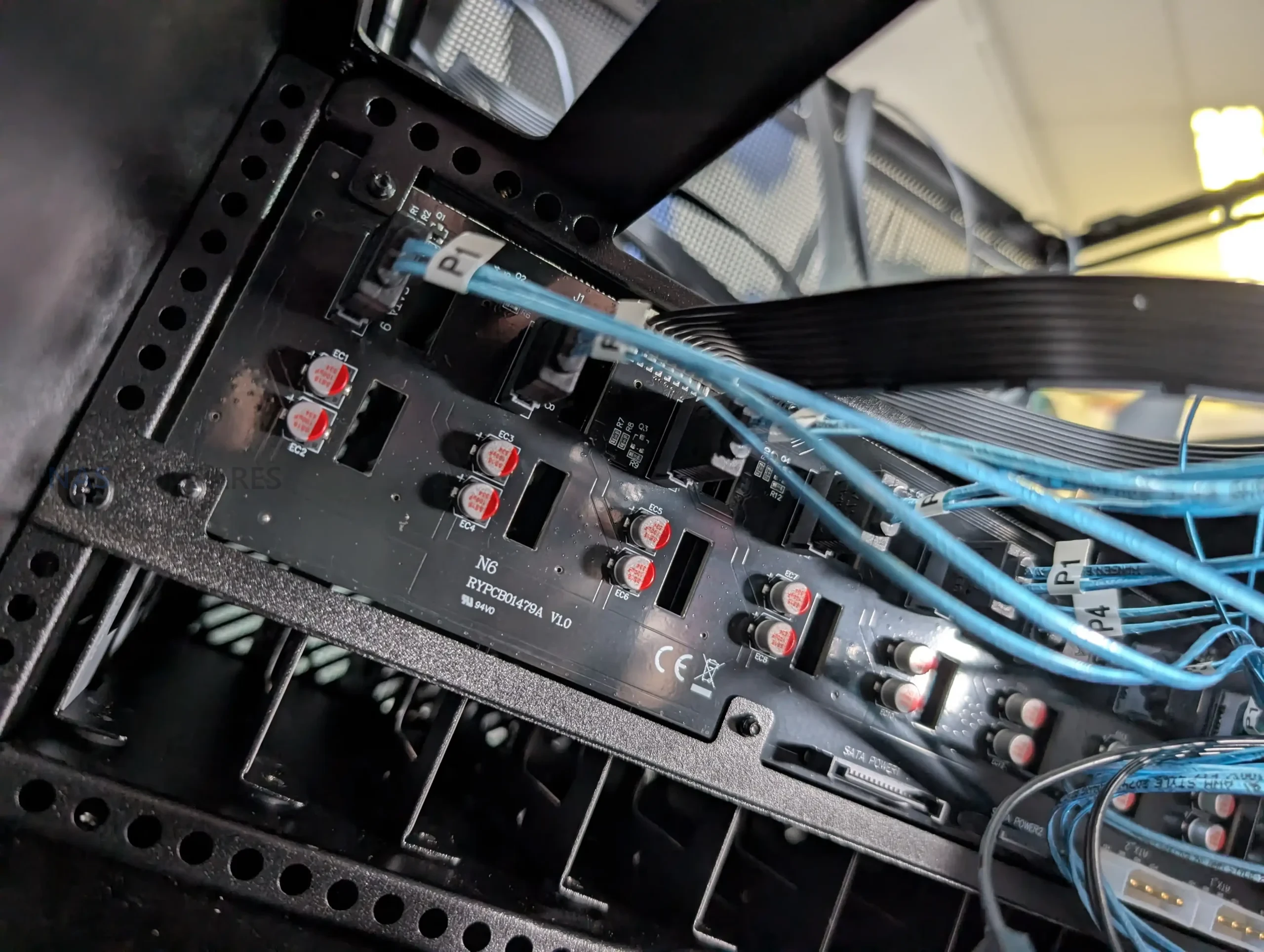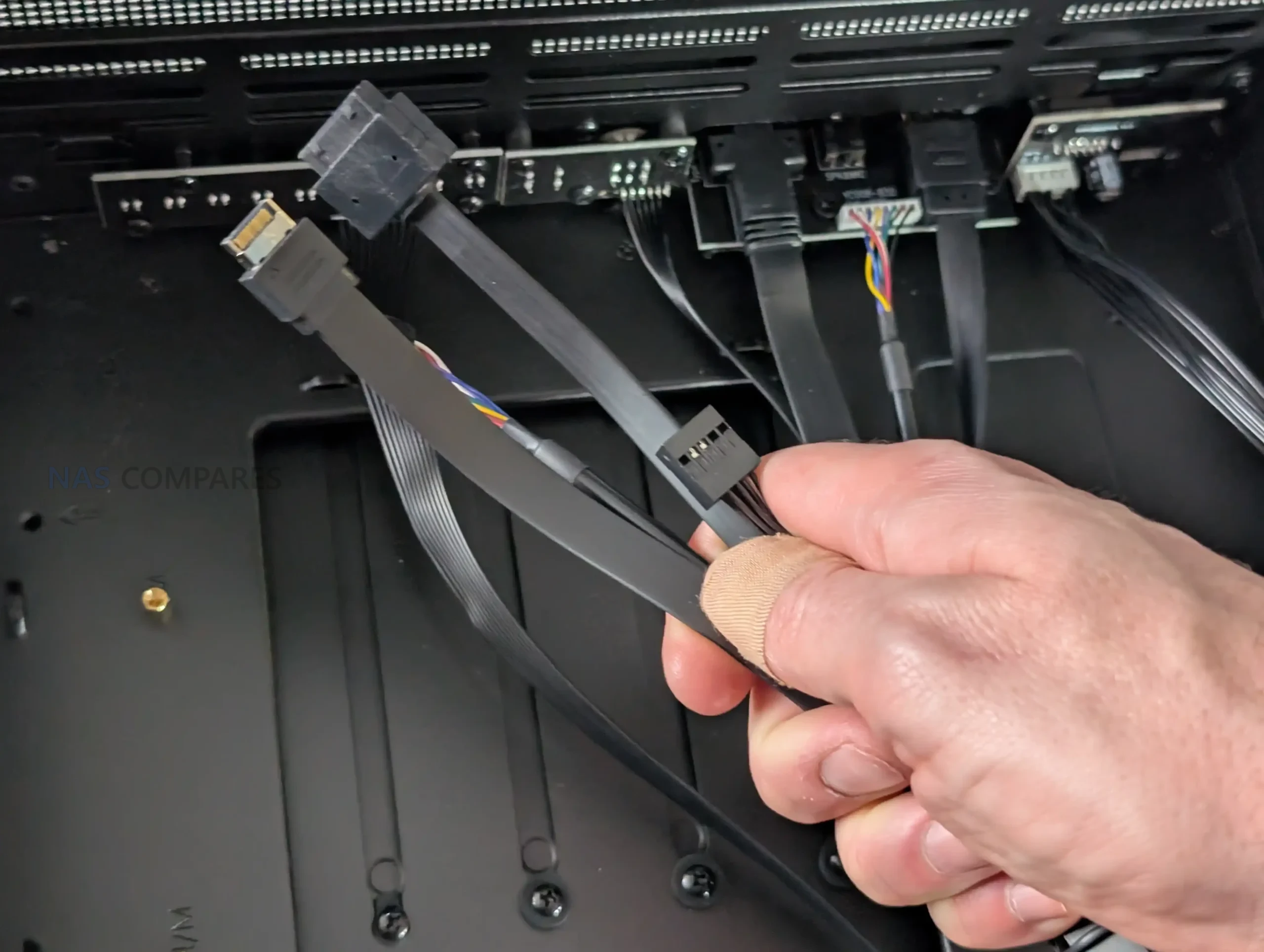 Internally, connectivity is more complex and is closely tied to the integrated drive backplane. All 9 drive bays connect through the rear mounted PCB, which uses individual SATA data connectors rather than Mini SAS or SAS HD outputs. Power delivery is handled through a mix of SATA power and Molex connectors, which provides flexibility but may increase cable management complexity depending on the power supply used.