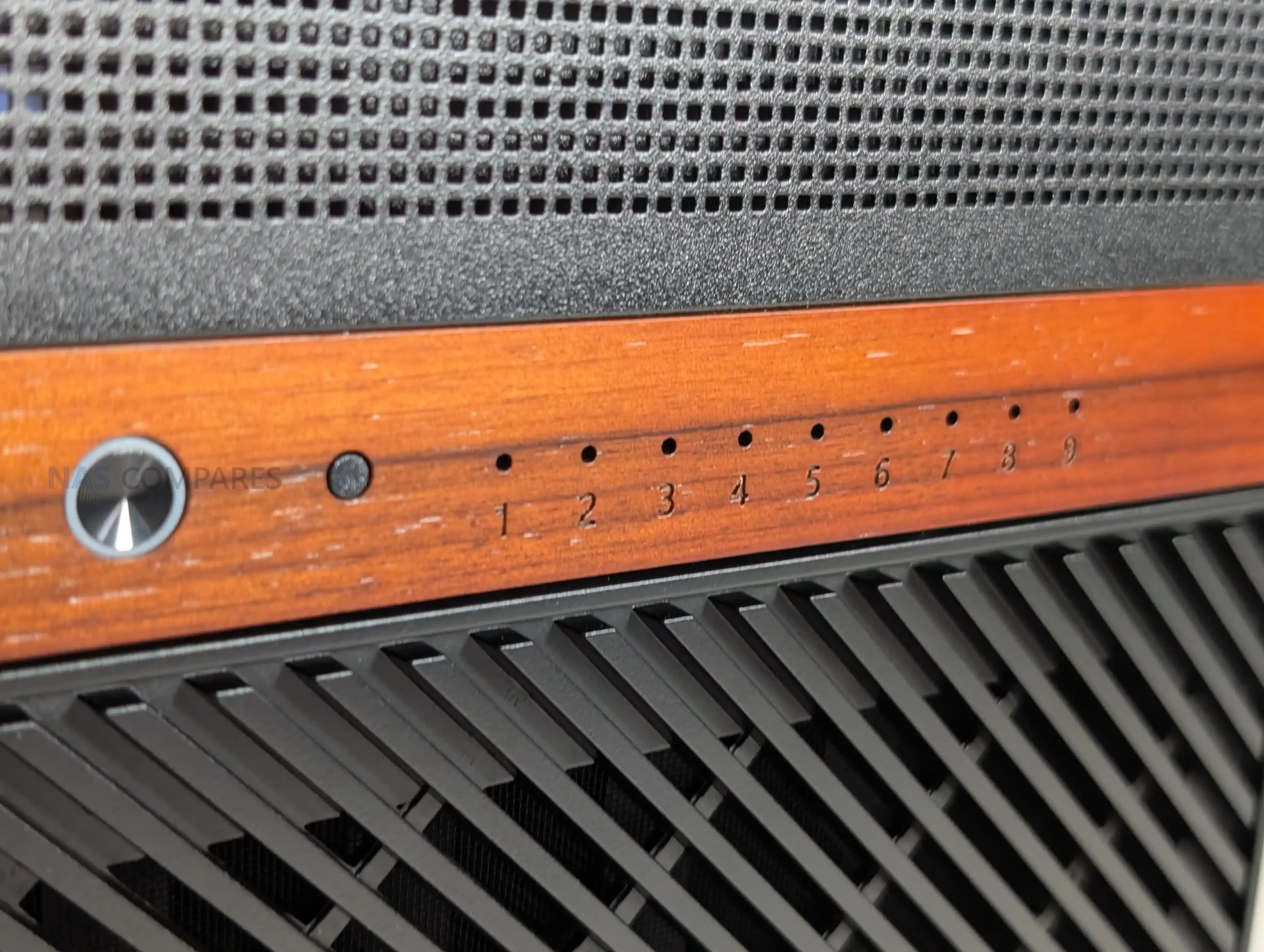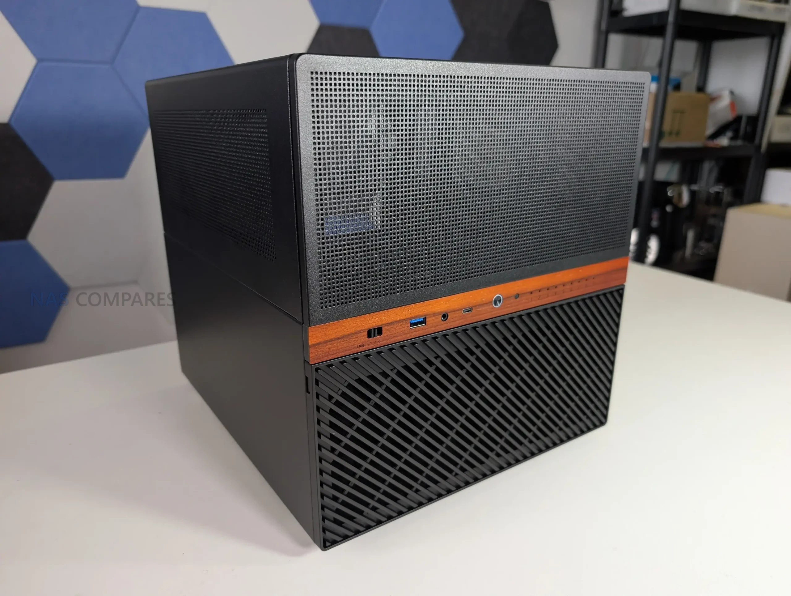 The Jonsbo N6 continues the brand’s established NAS focused design language, combining a compact tower format with a restrained, industrial appearance. The chassis uses a steel construction with aluminum accents and a wooden front trim, which has become a recognizable feature across several recent Jonsbo NAS cases. While the wood insert will not appeal to everyone, it is purely cosmetic and does not interfere with airflow or structural rigidity. Overall dimensions place the N6 clearly below the larger N5, though it is still substantial compared to many ITX cases due to its storage capacity.