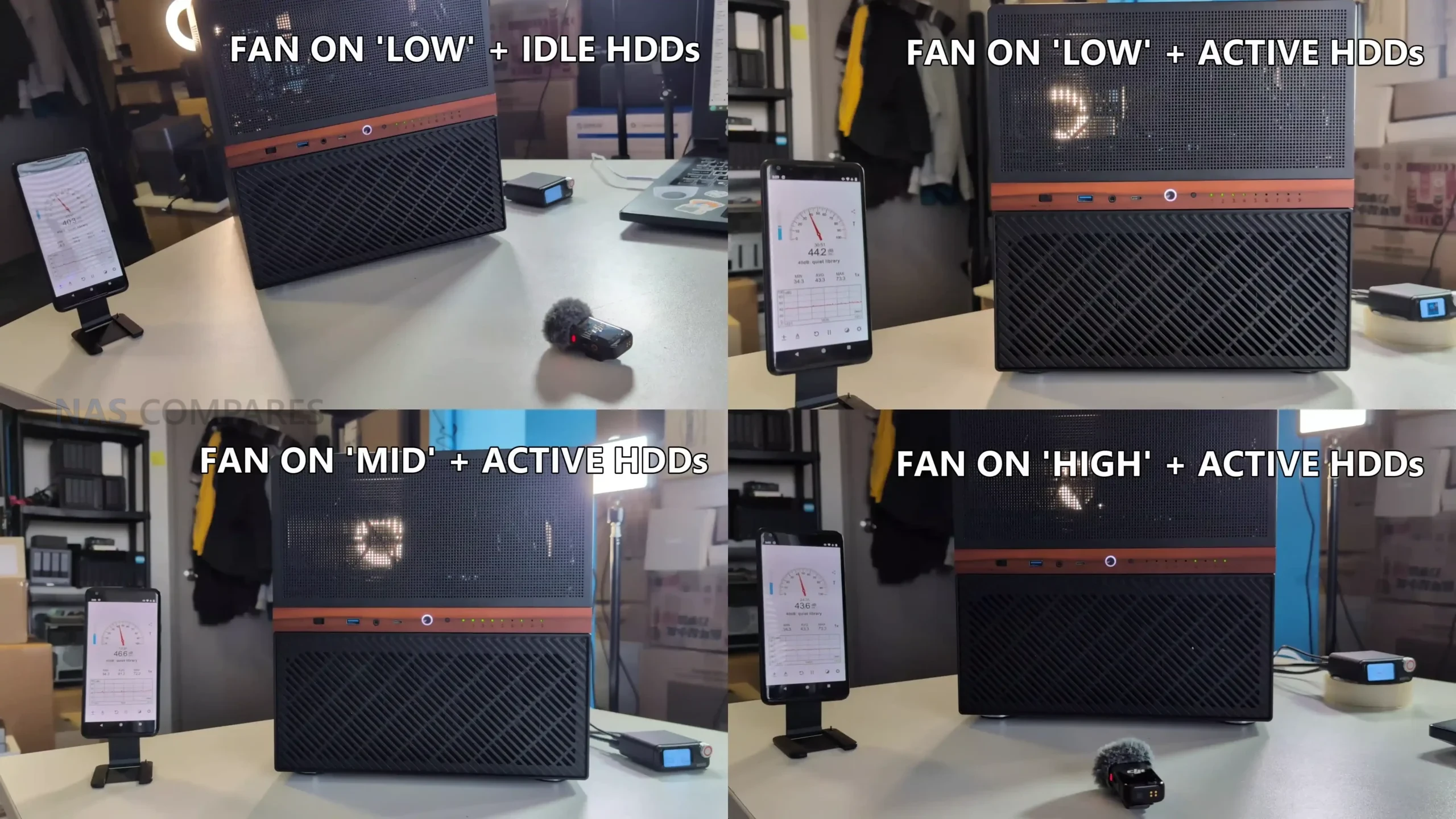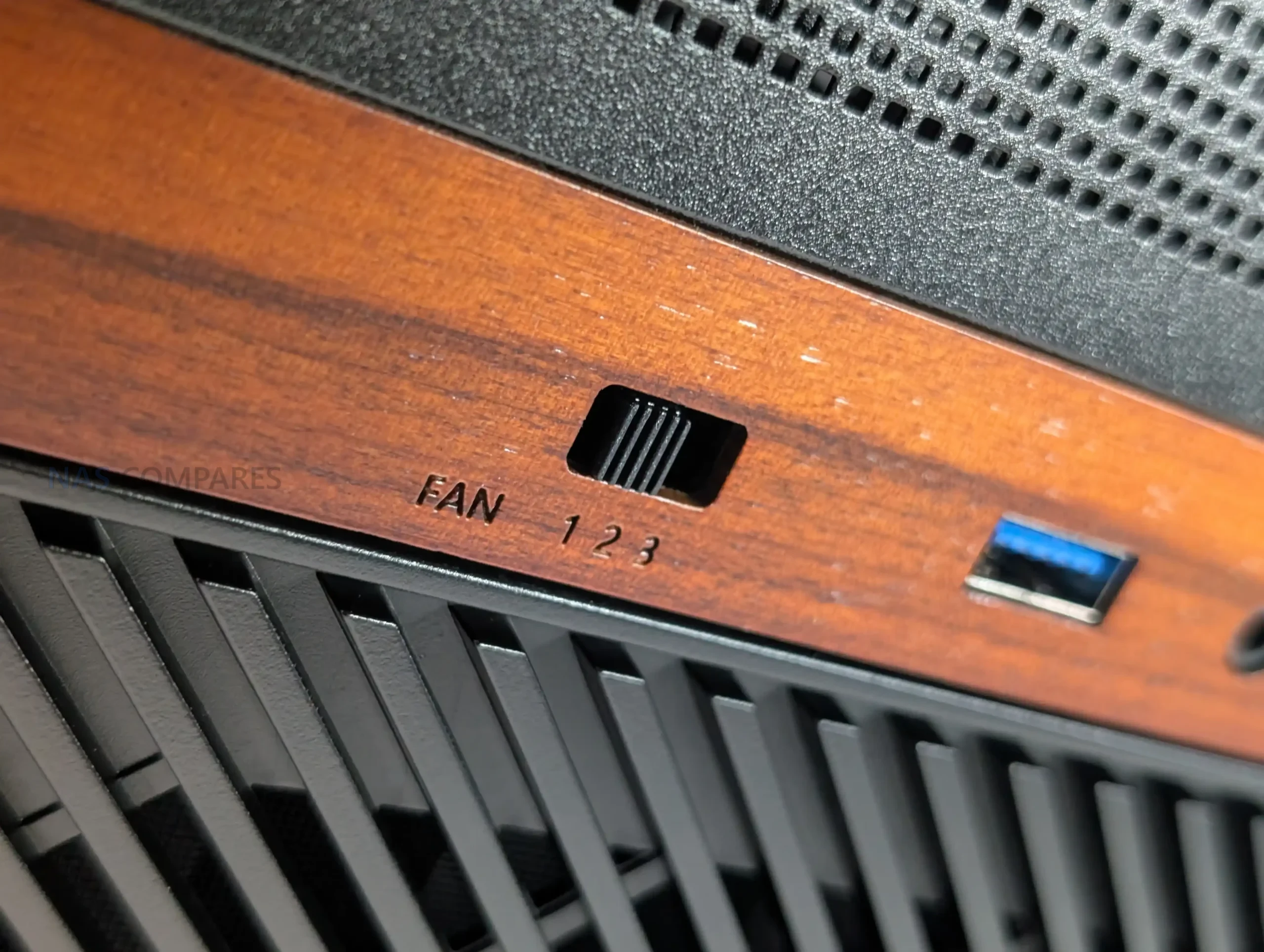 Noise testing was conducted under multiple operating conditions to evaluate how the N6 behaves in real environments rather than synthetic silence. At idle with fans set to the lowest manual setting and drives spun down, measured noise levels hovered around 37 to 39 dBA. Under active disk access with the same fan profile, noise increased modestly to around 41 to 44 dBA, with most audible output coming from the rear exhaust area. Increasing the fan controller to mid and high settings resulted in only marginal increases, topping out around 43 to 44 dBA, suggesting diminishing returns in airflow relative to acoustic output.