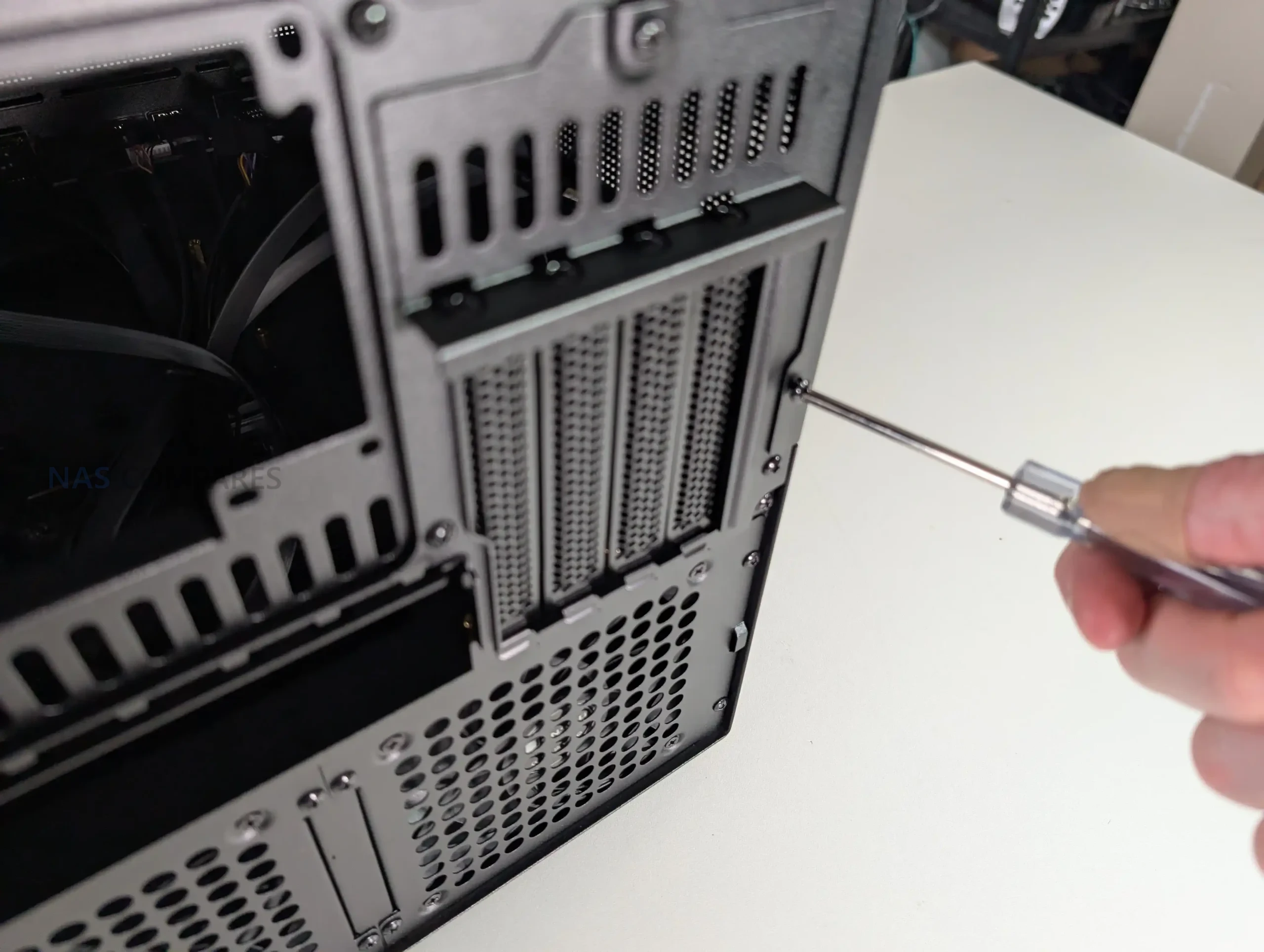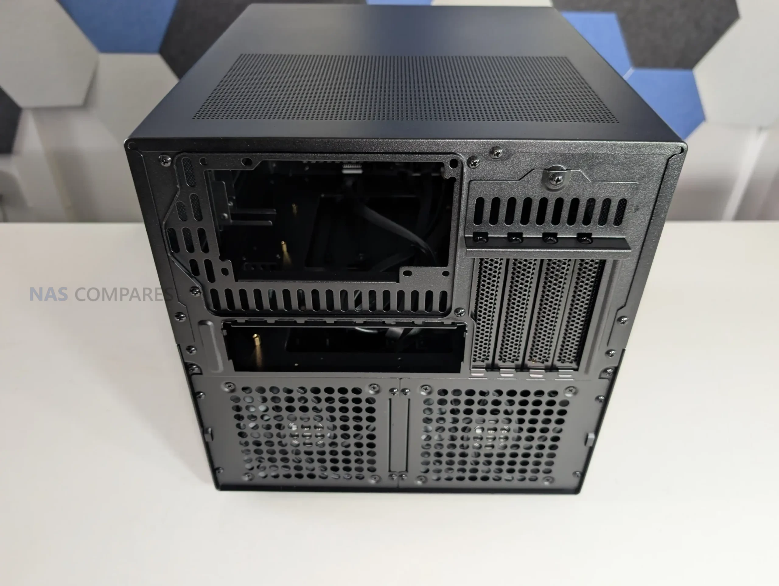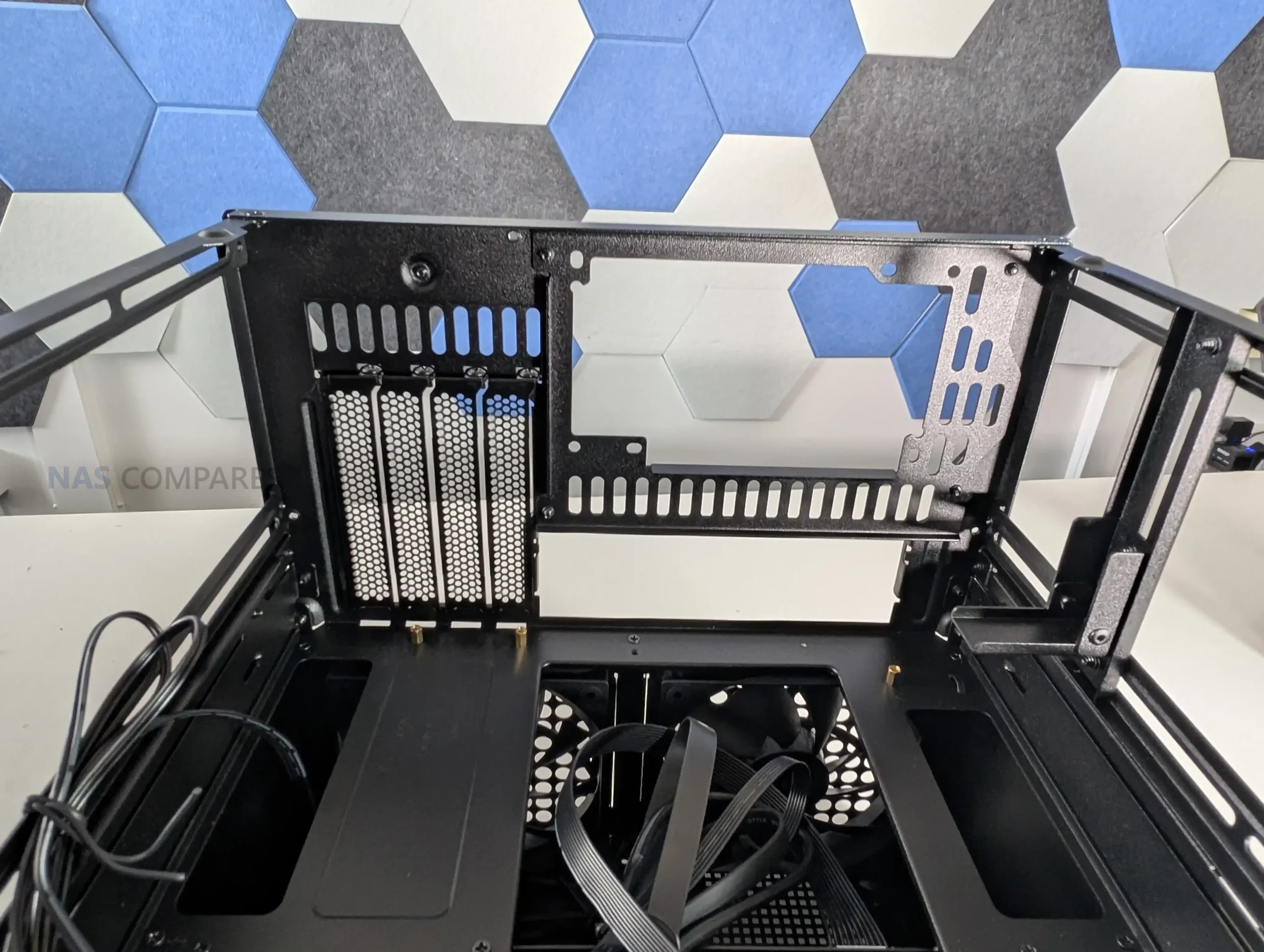PCIe expansion is relatively strong for a case in this category, with support for up to 4 full height expansion slots. This allows for the use of HBAs, network cards, or even a discrete GPU, provided length and thickness limits are respected. Clearance becomes tight when multiple expansion cards are installed alongside side mounted fans, especially on the lowest slot. Cable routing is generally straightforward, with clear channels and anchor points, but routing SATA or Mini SAS fan out cables is easier if completed before final motherboard installation, particularly in Micro ATX configurations.