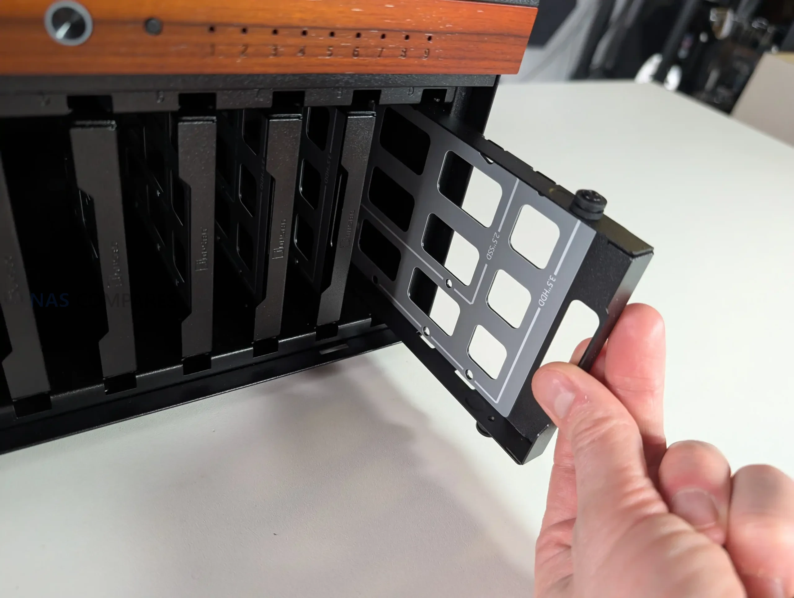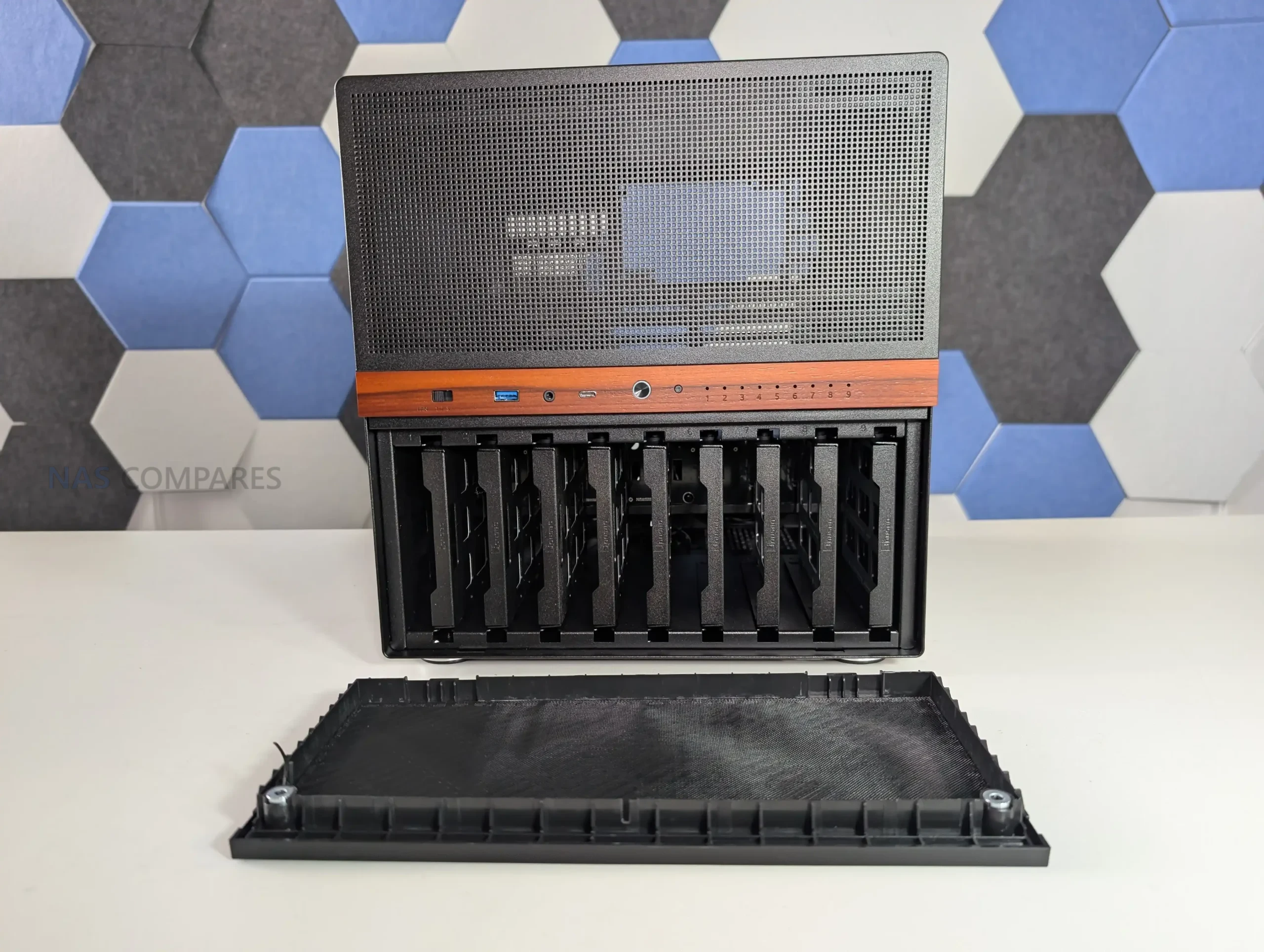 Storage is the defining feature of the N6, with support for up to 9 drives in either 3.5 inch HDD or 2.5 inch SSD formats. All drives are housed in a dedicated lower compartment, separated from the motherboard area. This layout helps with cable management and keeps storage thermals isolated from CPU and expansion hardware. The capacity places the N6 in a relatively uncommon position, offering more drive bays than most compact NAS cases without stepping into full tower territory.