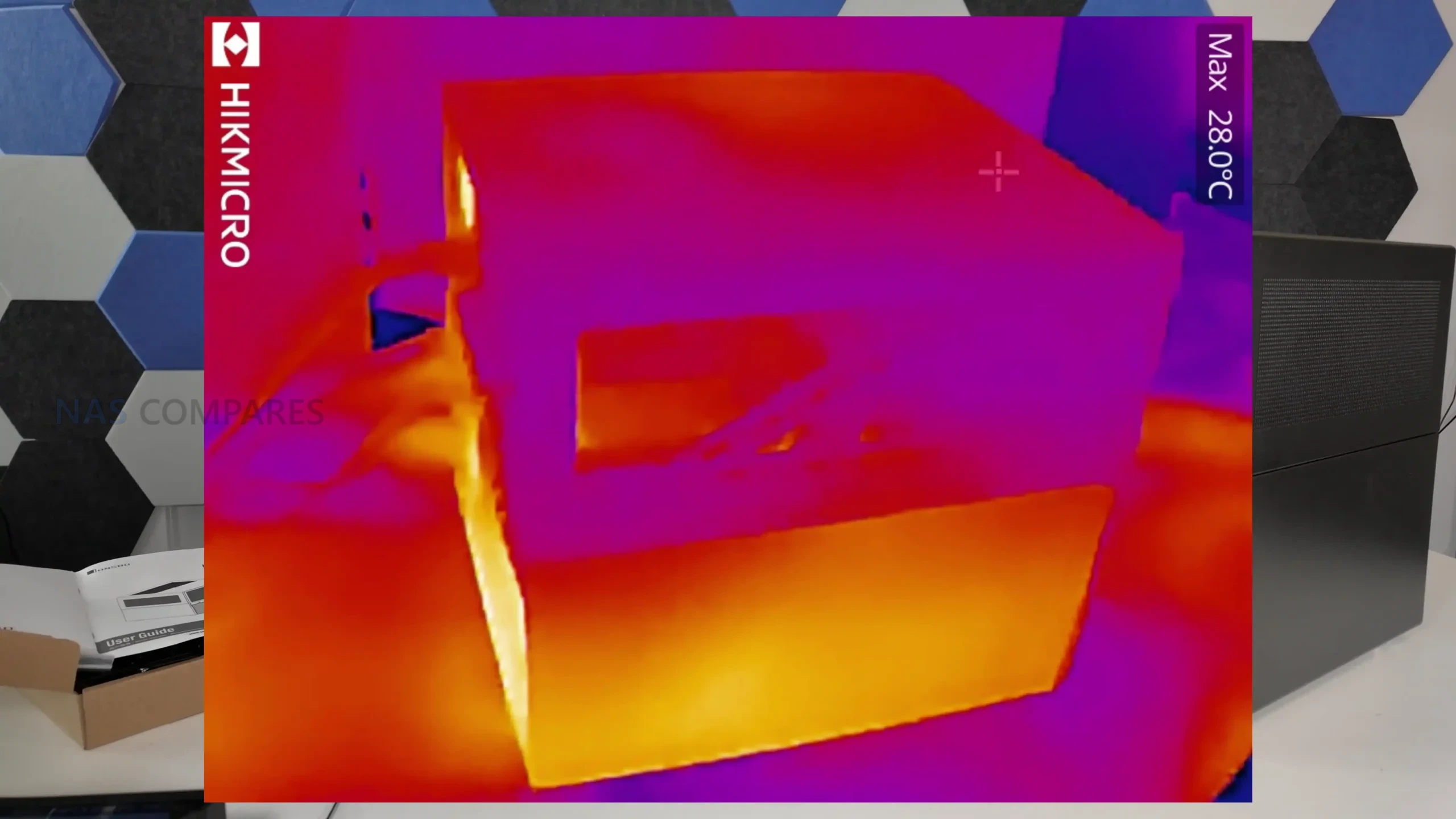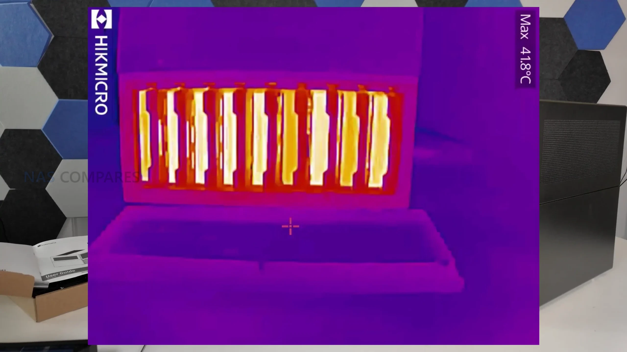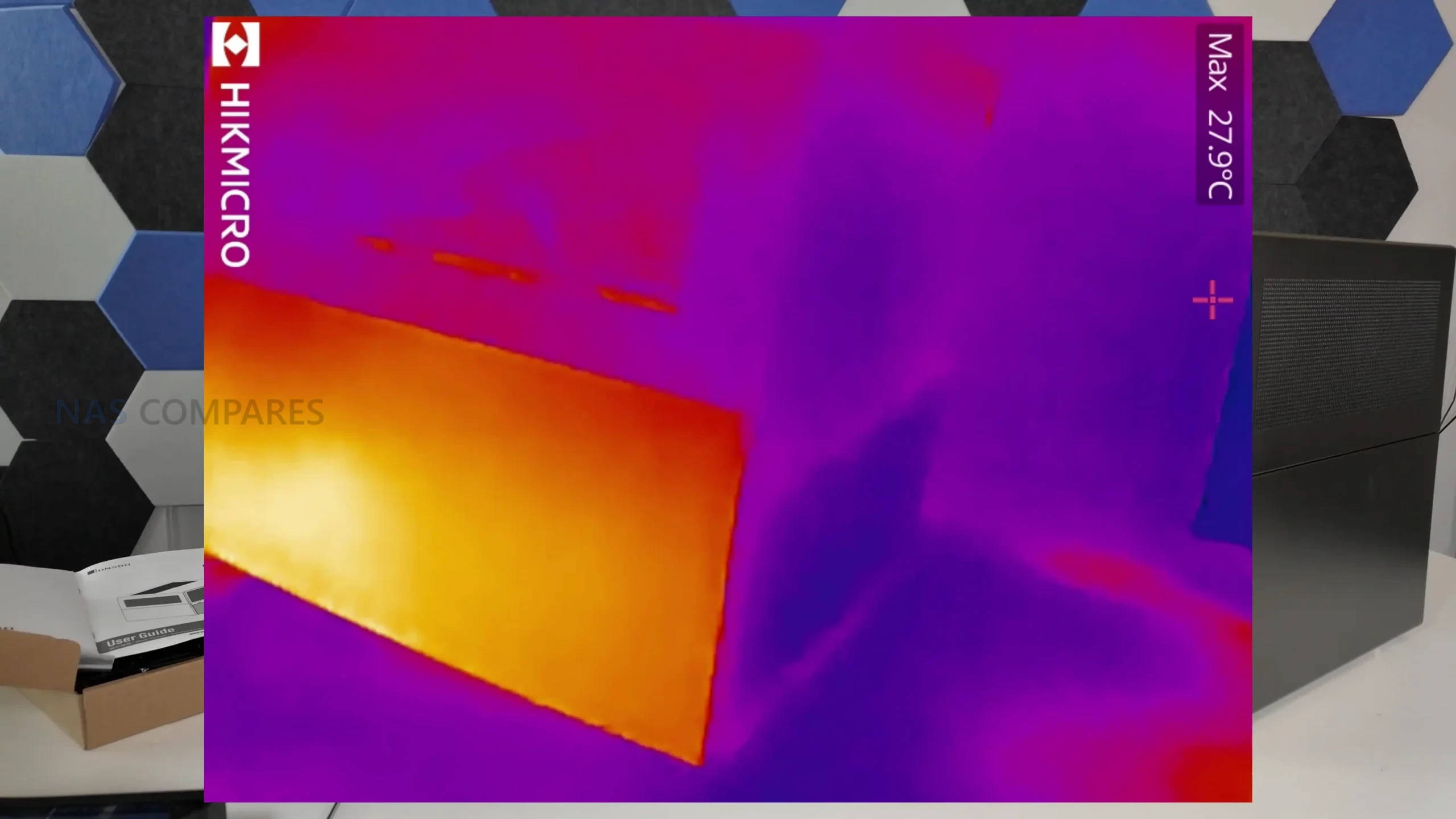 Thermal measurements were taken after the system had been operating continuously for roughly 2.5 days, followed by active load and cooldown observation. Drive temperatures during idle periods generally sat between 25°C and 28°C, with active access pushing internal drive area temperatures to around 42°C. Surface readings across the chassis showed consistent heat distribution, with the rear PCB area and PSU zone measuring close to 42°C, while the top and side panels remained closer to ambient at roughly 26°C to 27°C. These results indicate that while airflow around the drive backplane is not optimal, overall thermal behavior remains within acceptable limits for a 9 bay enclosure.