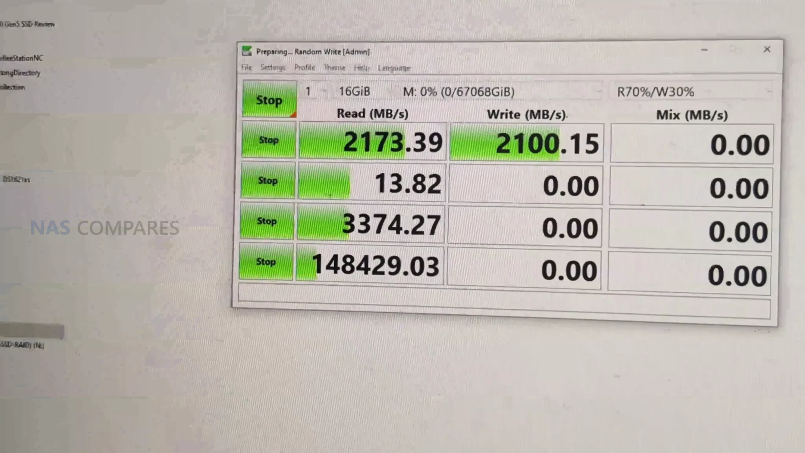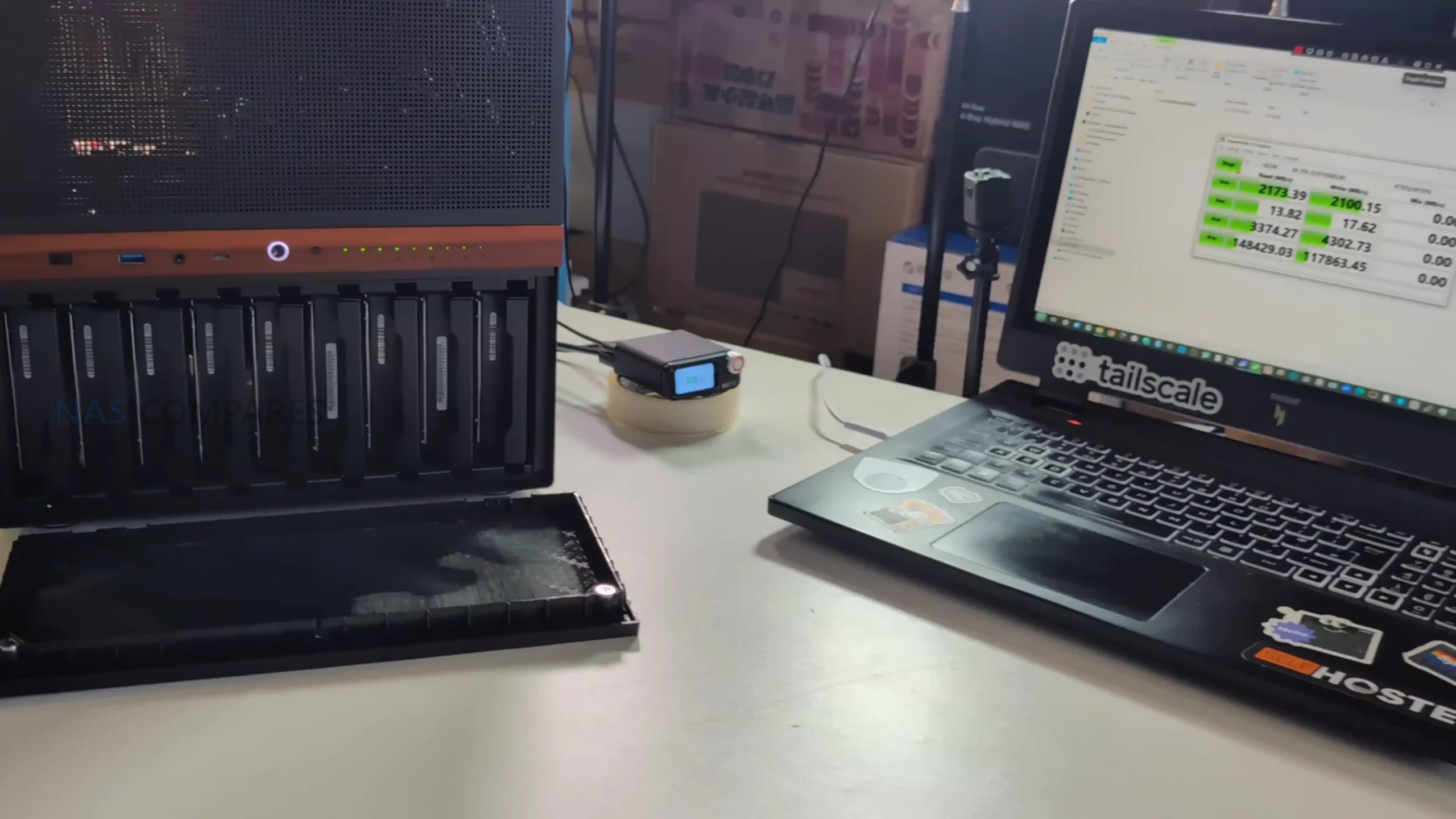 Storage performance testing was carried out using a RAID 0 array across 9 mechanical drives, paired with a workstation class MATX motherboard and a dedicated SATA controller. Sequential read and write speeds reached approximately 2.0 to 2.1 GB/s in CrystalDiskMark, indicating that the enclosure itself does not constrain throughput. These figures are primarily governed by controller bandwidth, PCIe lane allocation, and drive characteristics, rather than the internal backplane. Random access behavior remained typical for high capacity HDD arrays, with no anomalies linked to vibration or drive seating within the metal trays.