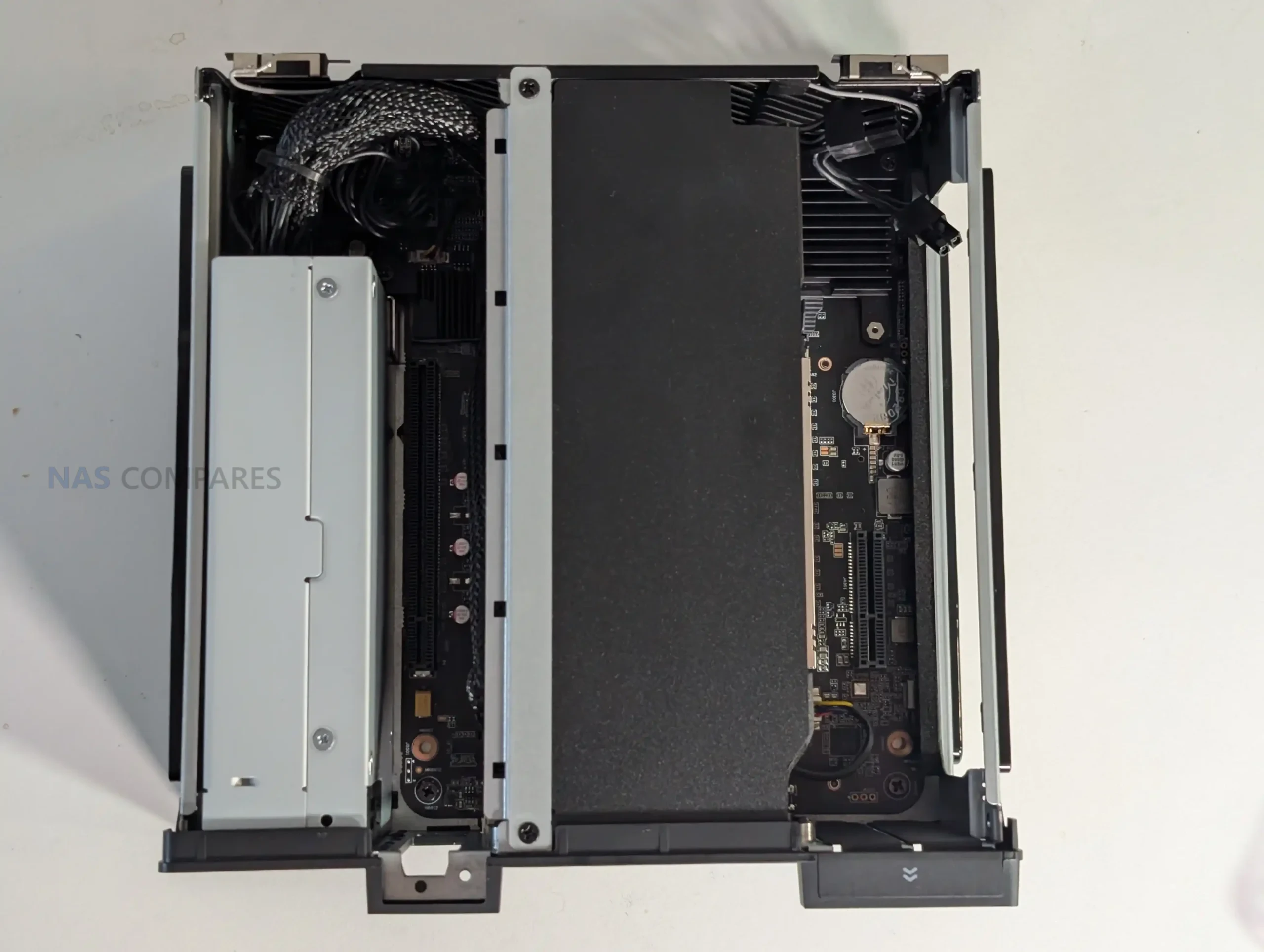 The MS-02 Ultra immediately distinguishes itself from earlier Minisforum workstation designs by abandoning the lighter, more modular internal layout used in systems like the MS-01 and MS-S1 Max. Instead, the chassis adopts a far denser internal structure that resembles a compressed micro-tower, with components stacked tightly around a central airflow channel. While the system still uses a slide-out internal frame, the motion is more deliberate and less fluid than previous designs due to the weight and density of the installed hardware. This approach prioritizes structural rigidity and thermal containment over ease of access, signaling that the MS-02 Ultra is designed to be configured carefully rather than frequently opened.