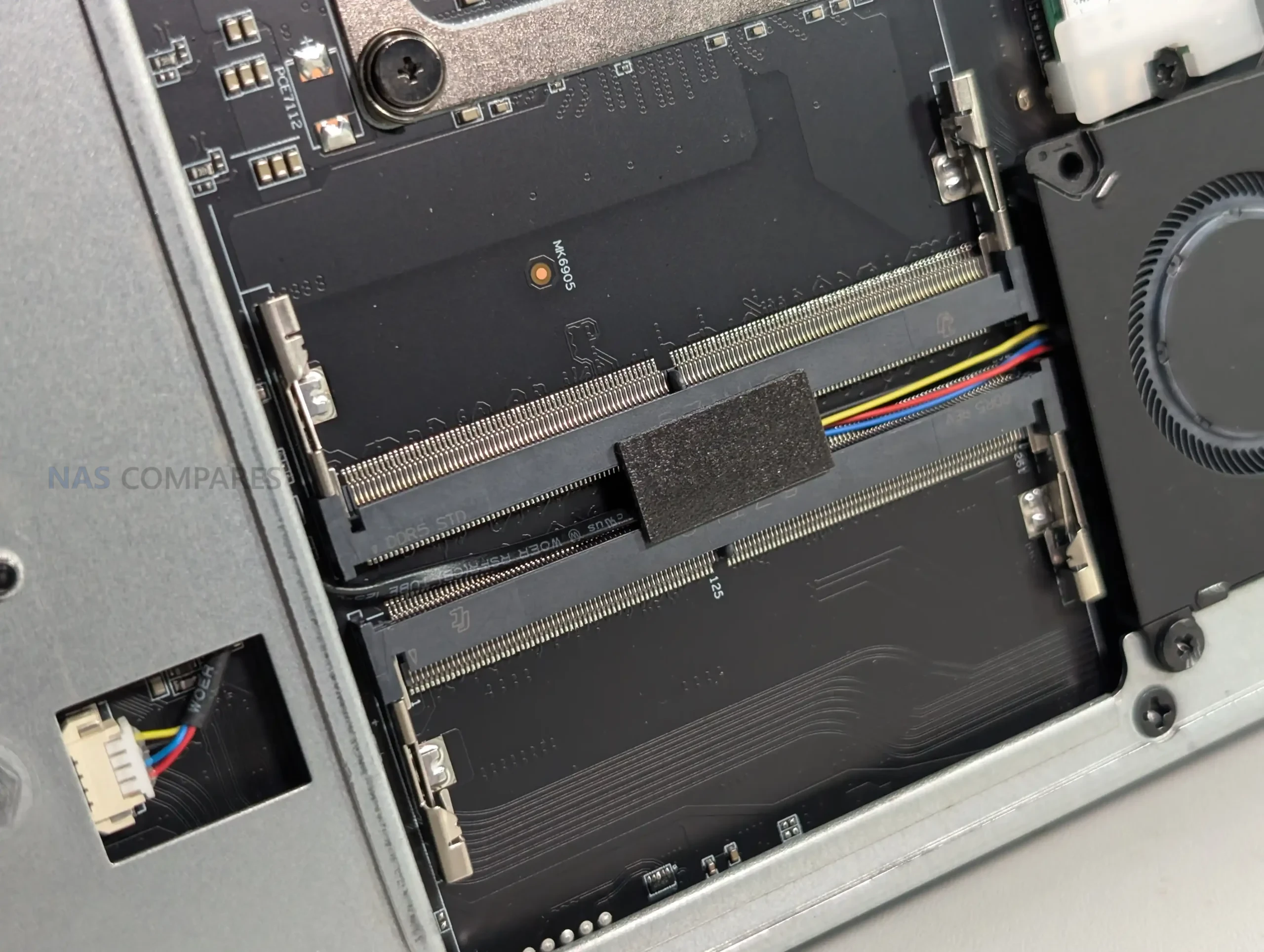 Memory support further reinforces that distinction. The system includes 4 DDR5 SODIMM slots, but only the Ultra 9 285HX variant enables ECC functionality. During testing, ECC was supported at 4800 MT/s, and while that frequency is lower than some non-ECC DDR5 kits, the stability benefits are clearly aligned with the system’s server-adjacent ambitions. The physical layout of the memory slots is unconventional, with 2 slots positioned close to the CPU cooling path and the remaining 2 mounted on the opposite side of the board.