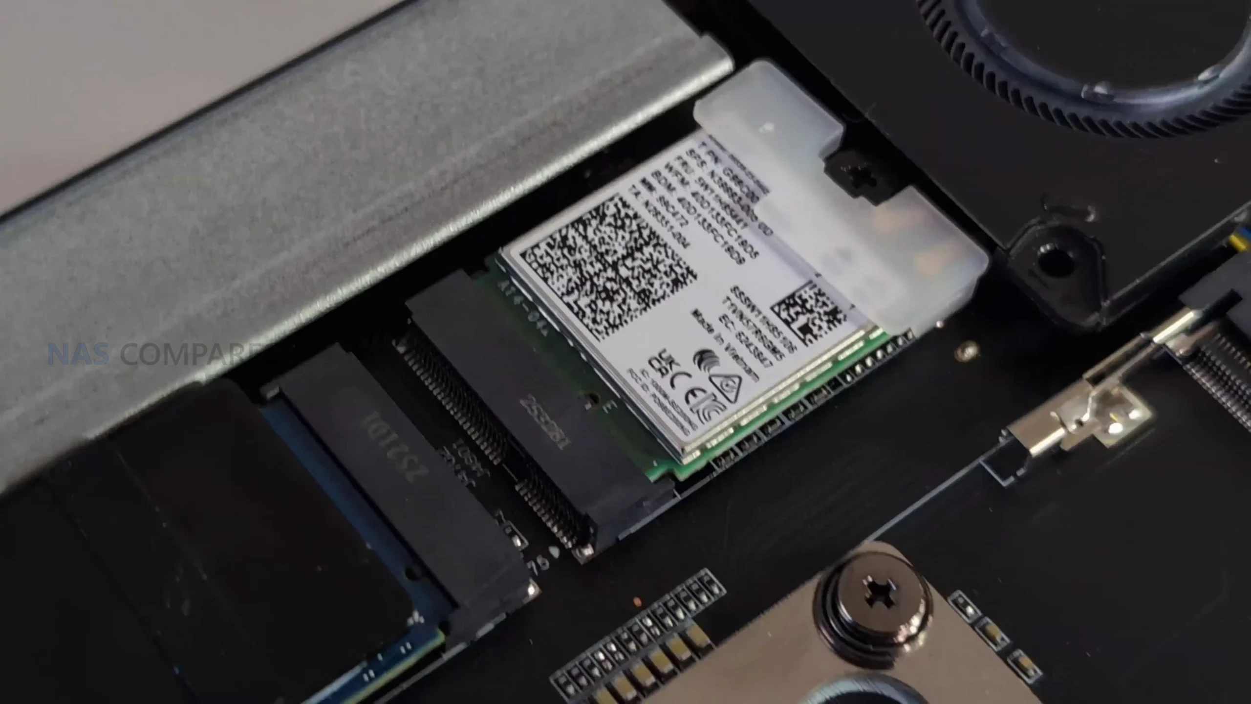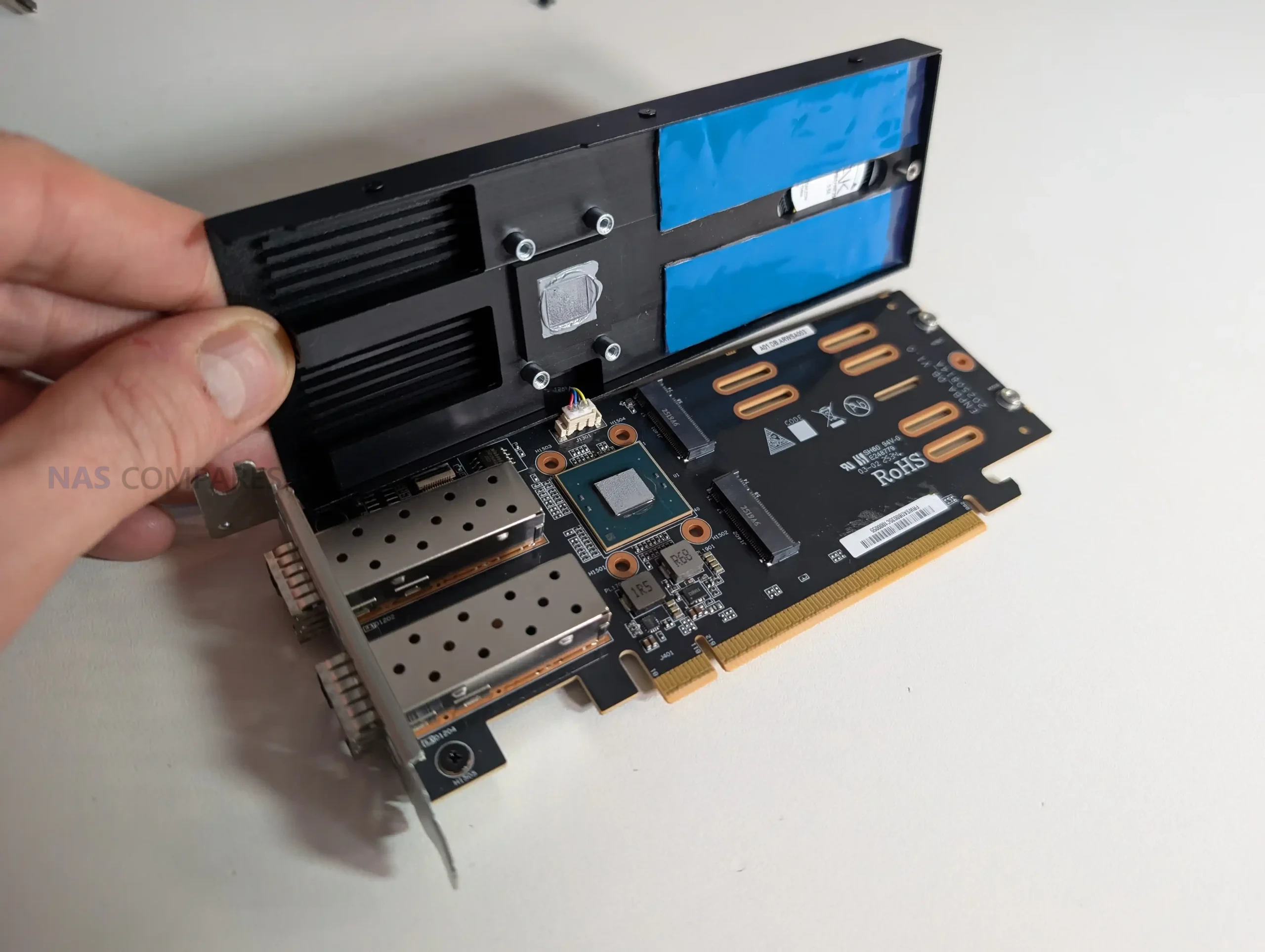 The additional two M.2 slots are integrated into the PCIe card that also houses the dual 25GbE controllers. This card is exclusive to the Ultra 9 285HX version and is responsible for expanding total NVMe capacity from 2 drives to 4. Unlike typical expansion cards, this unit combines networking and storage on a single PCB and includes its own active cooling solution. In use, the card introduces noticeable power draw even when the network interfaces are idle, but it also centralizes high-speed I/O in a way that simplifies cabling and internal layout. This design choice is unusual, but it aligns with the system’s goal of maximizing capability within a small enclosure.
