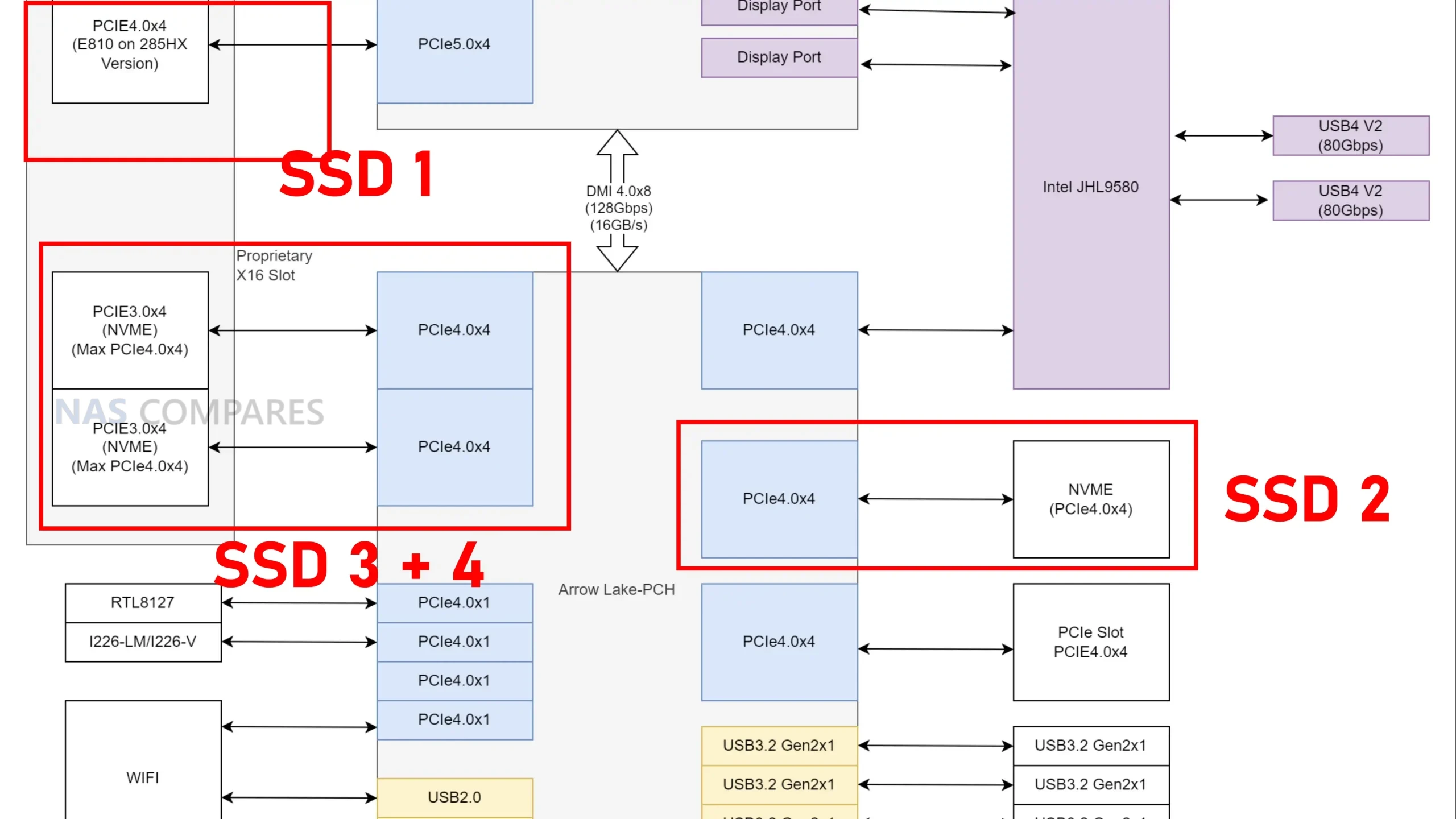 There are also important performance considerations tied to how storage bandwidth is allocated. The motherboard-mounted M.2 slots are specified as PCIe 4.0 x4, but during testing, lane sharing and PCIe crossover behavior resulted in scenarios where one slot operated at PCIe 5.0 x4 while others were reduced to PCIe 3.0 x4. This was not immediately obvious from the documentation and required closer inspection of the PCIe lane map and BIOS configuration to fully understand. While overall throughput remained strong across all drives, the behavior highlights that the MS-02 Ultra expects users to pay attention to lane allocation if they intend to fully populate all storage bays.