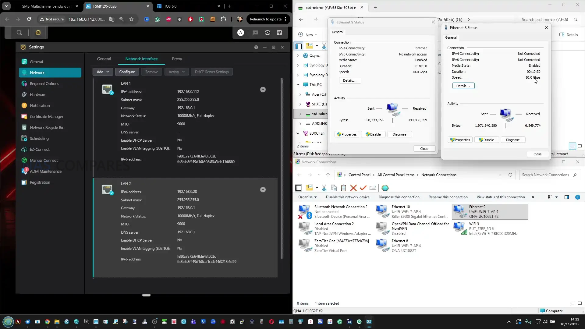 The adapter also showed strong results during SMB based file transfers, which typically stress both network performance and host storage. Using high speed NVMe backed devices such as the Minisforum MSS1 Max and the Asustor Flashstor Gen 2, throughput regularly approached the upper limits of a single 10GbE link and in some cases exceeded 13 to 14 Gbps combined when SMB Multi Channel was enabled. This reflected not only raw link speed but the ability of the device to maintain a stable, predictable data path without drops or thermal throttling. The performance was also consistent during repeated transfers, confirming sustained operation rather than peak only figures.