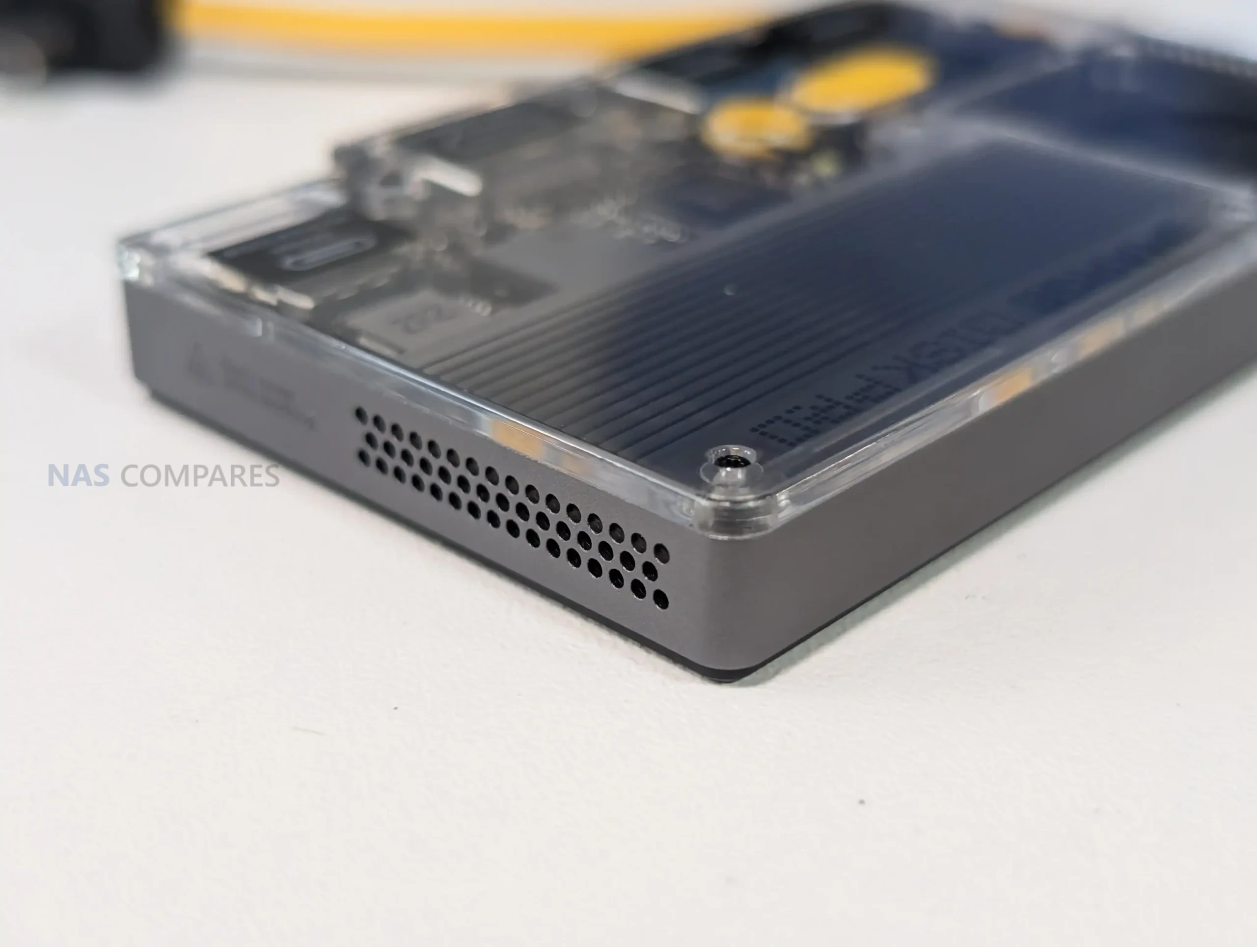 Externally, the unit uses an aluminium frame combined with a transparent plastic shell that reveals parts of its internal structure. The materials provide both aesthetic appeal and heat dissipation, with the aluminium core helping to channel heat away from the NAND and controller components. The integrated USB-C cable is short and reinforced, designed for use with laptops, tablets, and mobile phones without introducing unnecessary slack. Although the compactness is one of the Disk Pro’s strongest traits, it does come at the cost of expandability and limited repair potential due to the permanently sealed housing.
