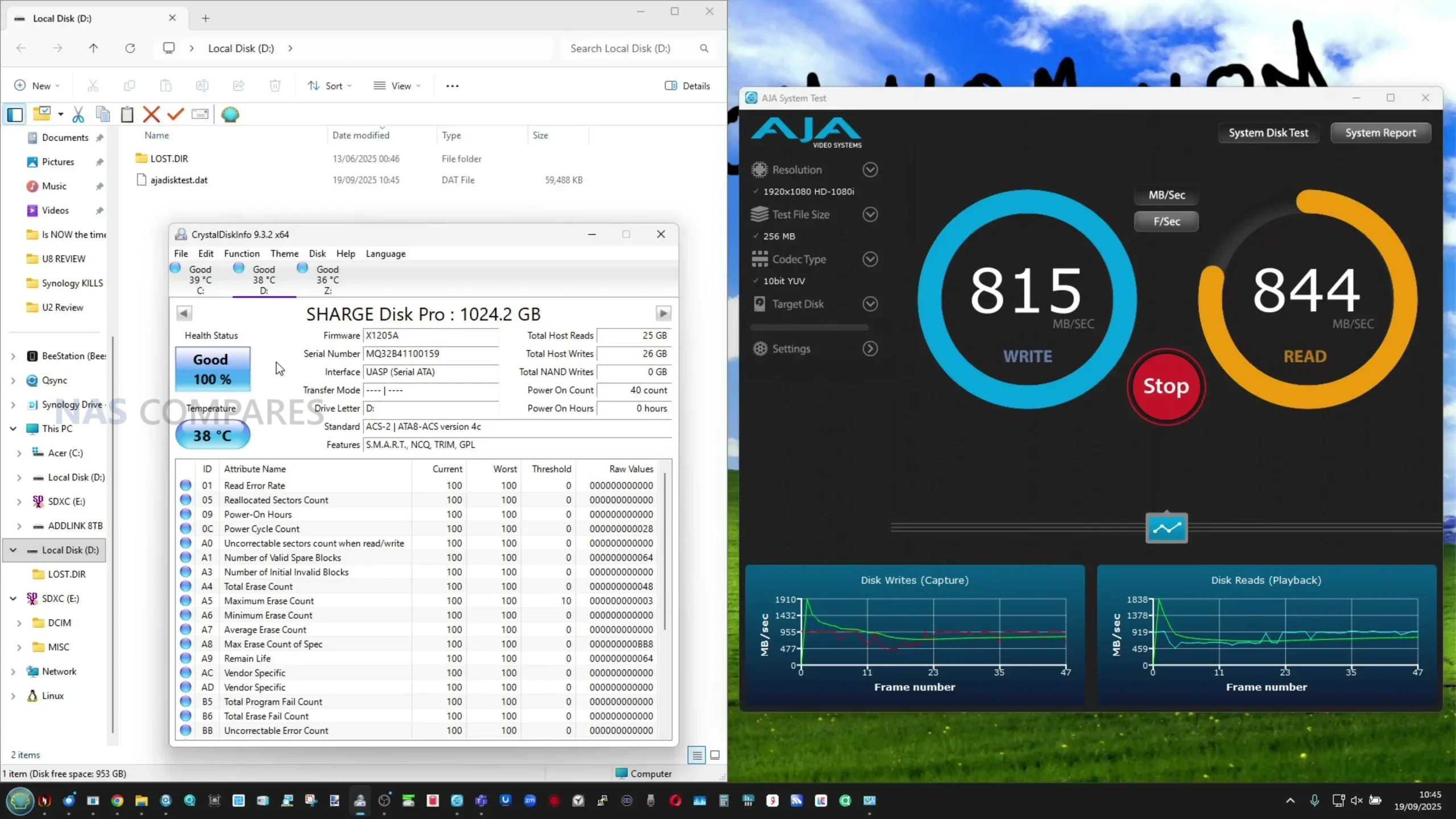 In practical testing, the Sharge Disk Pro delivered performance that closely aligned with its stated specifications. Using AJA System Test on a Windows 11 PC, sustained read speeds averaged between 800 and 900 MB/s, while write speeds remained consistent at around 700 to 800 MB/s across multiple test cycles. These results are in line with expectations for a USB 3.2 Gen 2 (10Gbps) interface, which typically caps out at 1,000 MB/s due to bus limitations. During repeated five-minute transfer tests using 256MB file blocks, there was no noticeable performance degradation or thermal throttling, confirming that the integrated fan and heatsink design effectively maintained stable throughput even under extended workloads. Sequential transfers performed best, while random 4K operations showed typical limitations of USB-based external drives, making it more suited for large media file transfers rather than small transactional data.