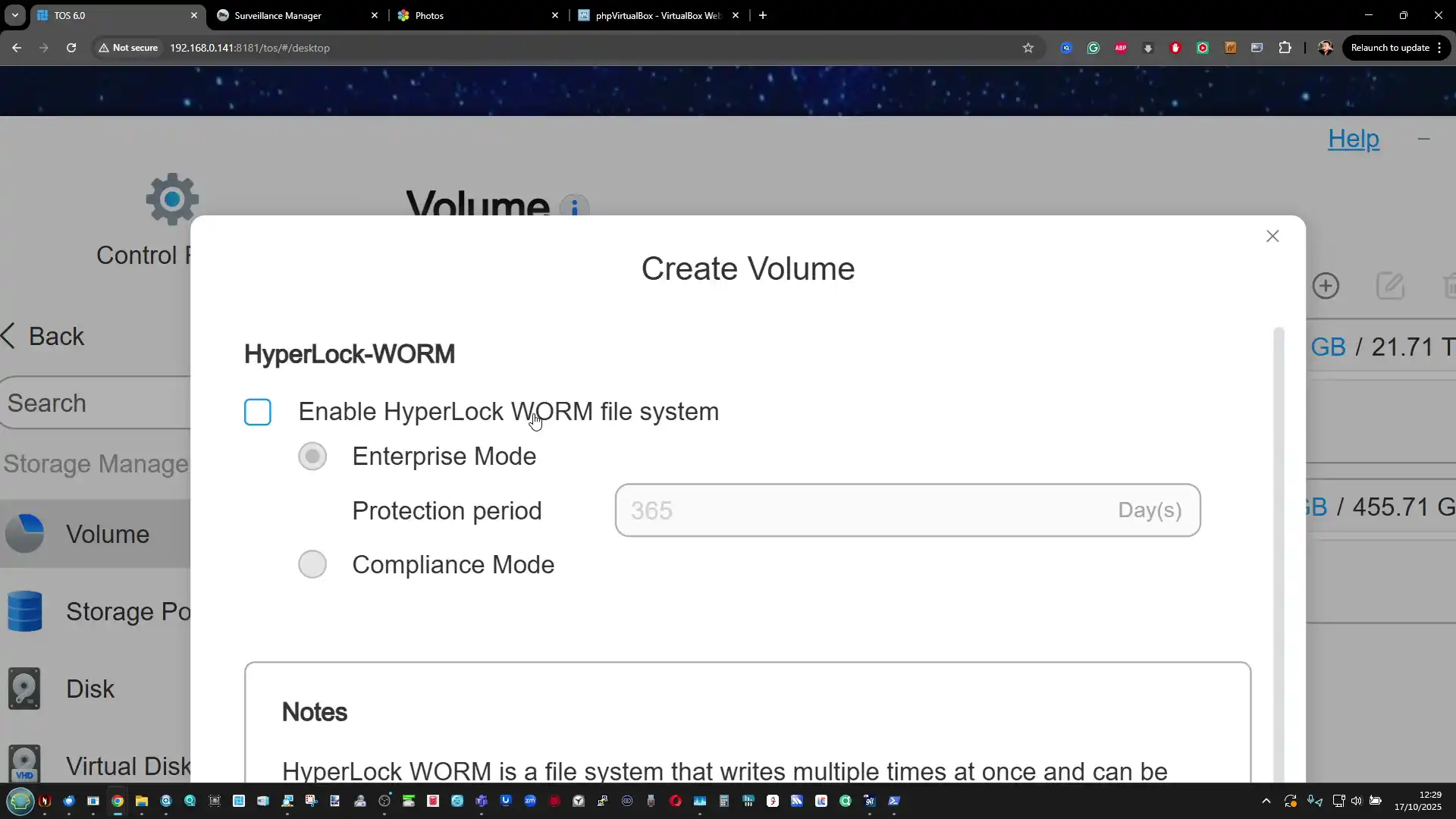 The volume creation process is more flexible than in previous iterations, supporting both Btrfs and EXT4 file systems alongside iSCSI targets for raw block-level storage. Btrfs, in particular, benefits from the Linux 6.1 kernel’s improved memory handling and snapshot reliability. The inclusion of Hyper-Lock WORM (Write Once, Read Many) in both Compliance and Enterprise modes offers organizations the ability to lock data for specific periods or indefinitely, preventing modification or deletion to meet audit or regulatory requirements.