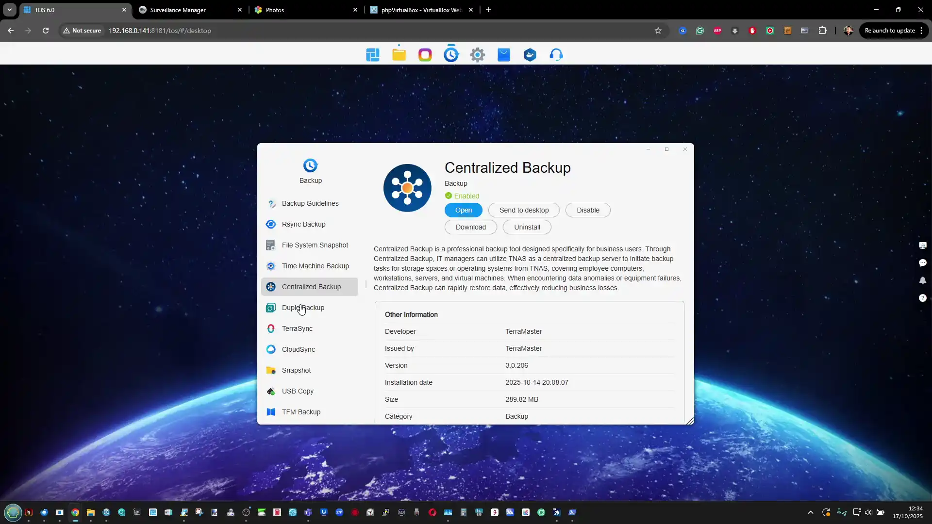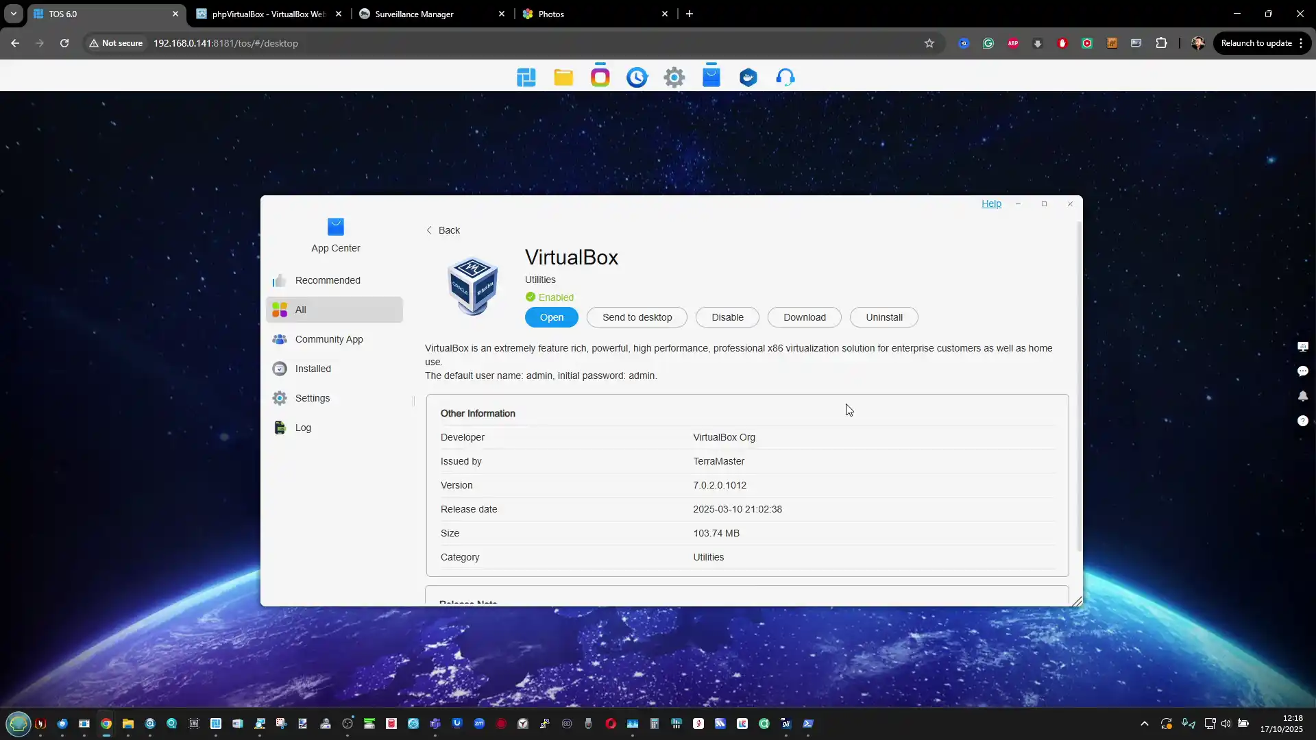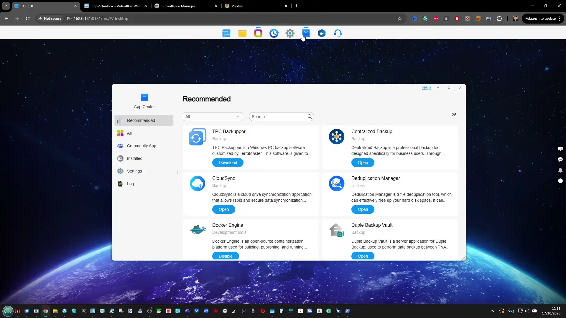 The application ecosystem in TOS 6 has expanded both in variety and integration depth, blending TerraMaster’s own utilities with third-party and open-source solutions. The App Center serves as the central hub for installing, updating, and managing applications, ranging from productivity tools and cloud clients to virtualization and multimedia services. Many of these applications are developed in-house, such as the Centralized Backup, File Manager, and Photo Gallery utilities, while others leverage established third-party frameworks like VirtualBox for virtualization and Portainer for container management. Users can deploy Docker containers directly from the interface or access the full registry for advanced workloads, making it possible to host additional media servers, AI indexing tools, or web applications. Although the ecosystem remains smaller than Synology’s Package Center or QNAP’s App Center, the available selection covers nearly all core NAS functions that general users and small business environments would require.