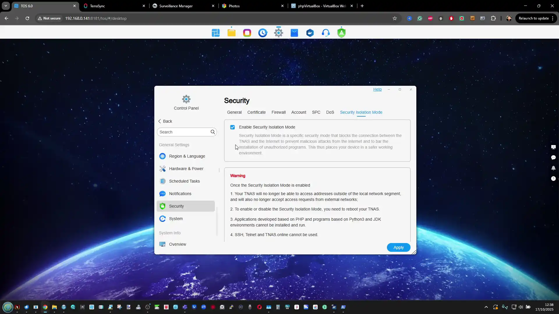 System maintenance and troubleshooting services have also received attention in TOS 6. The platform’s security advisor can perform automated vulnerability checks, flagging weak passwords, exposed ports, or outdated configurations. Isolation Mode remains one of its more practical safety features, instantly disconnecting all non-administrative users and disabling PHP-based third-party apps to prevent intrusion. When users encounter system errors, they can utilize the integrated issue reporting tool, which generates diagnostic logs and can enable temporary remote support for TerraMaster engineers through an authentication key.