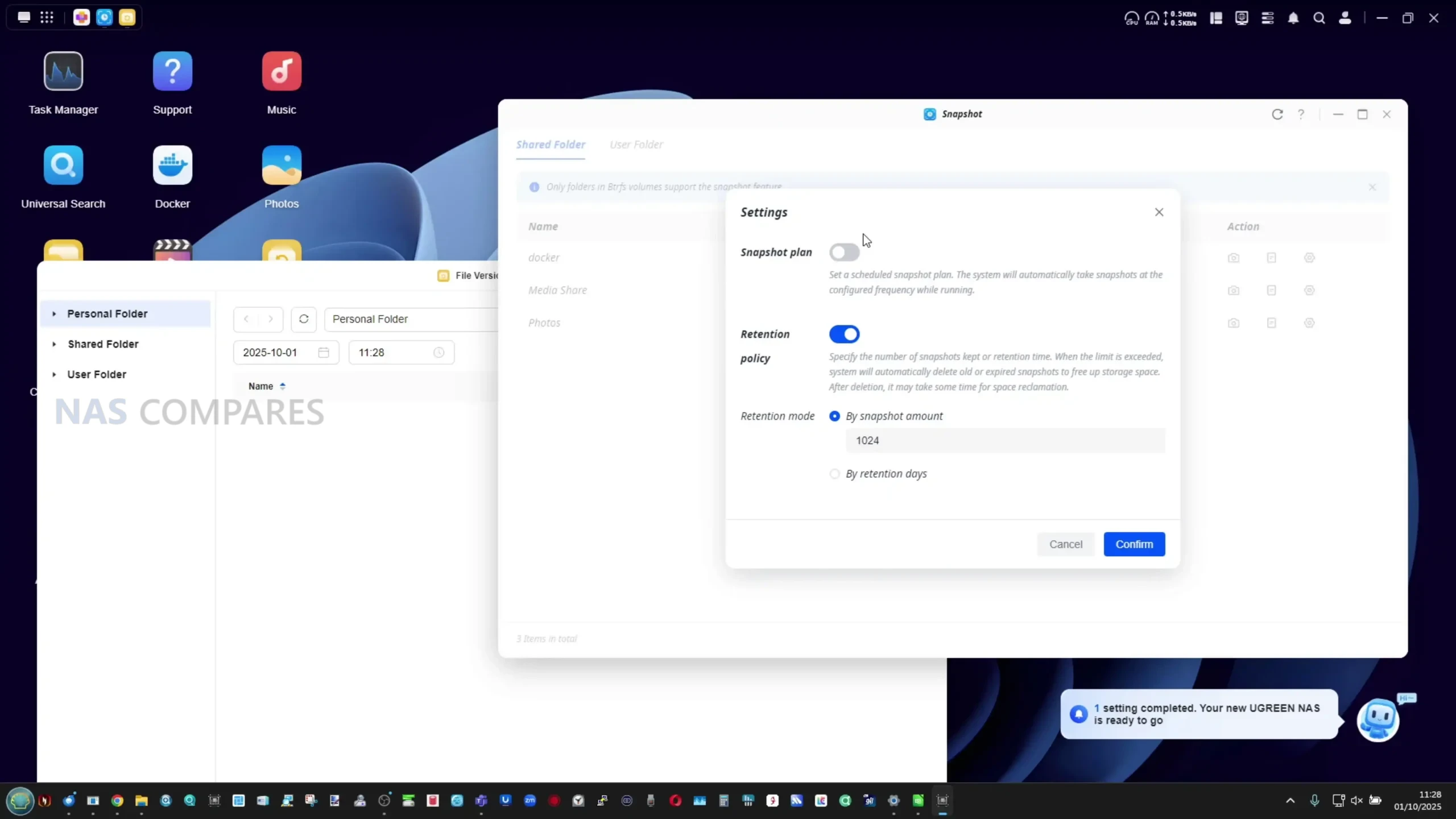 Storage management is one of UGOS Pro’s more mature components. Users can create storage pools and volumes in JBOD, RAID 0, or RAID 1, with scheduled drive tests, SMART diagnostics, and Seagate IronWolf Health integration for supported drives. The storage manager also includes rebuild and repair settings that allow users to prioritise either RAID reconstruction speed or system performance during rebuilds. Snapshot protection is integrated at the folder level, with both versioned and scheduled snapshots available for data recovery. Although the system does not offer full OS-level backups, users can schedule NAS-to-NAS, NAS-to-USB, and NAS-to-Cloud synchronisation tasks using Rsync or proprietary tools. These backups can include filters for file type, size, and modification date, making them adaptable to both personal and small office usage. In practice, the storage controls are intuitive and well-implemented for a first-generation NAS platform, with sufficient safeguards for casual users who might otherwise rely on third-party cloud apps.