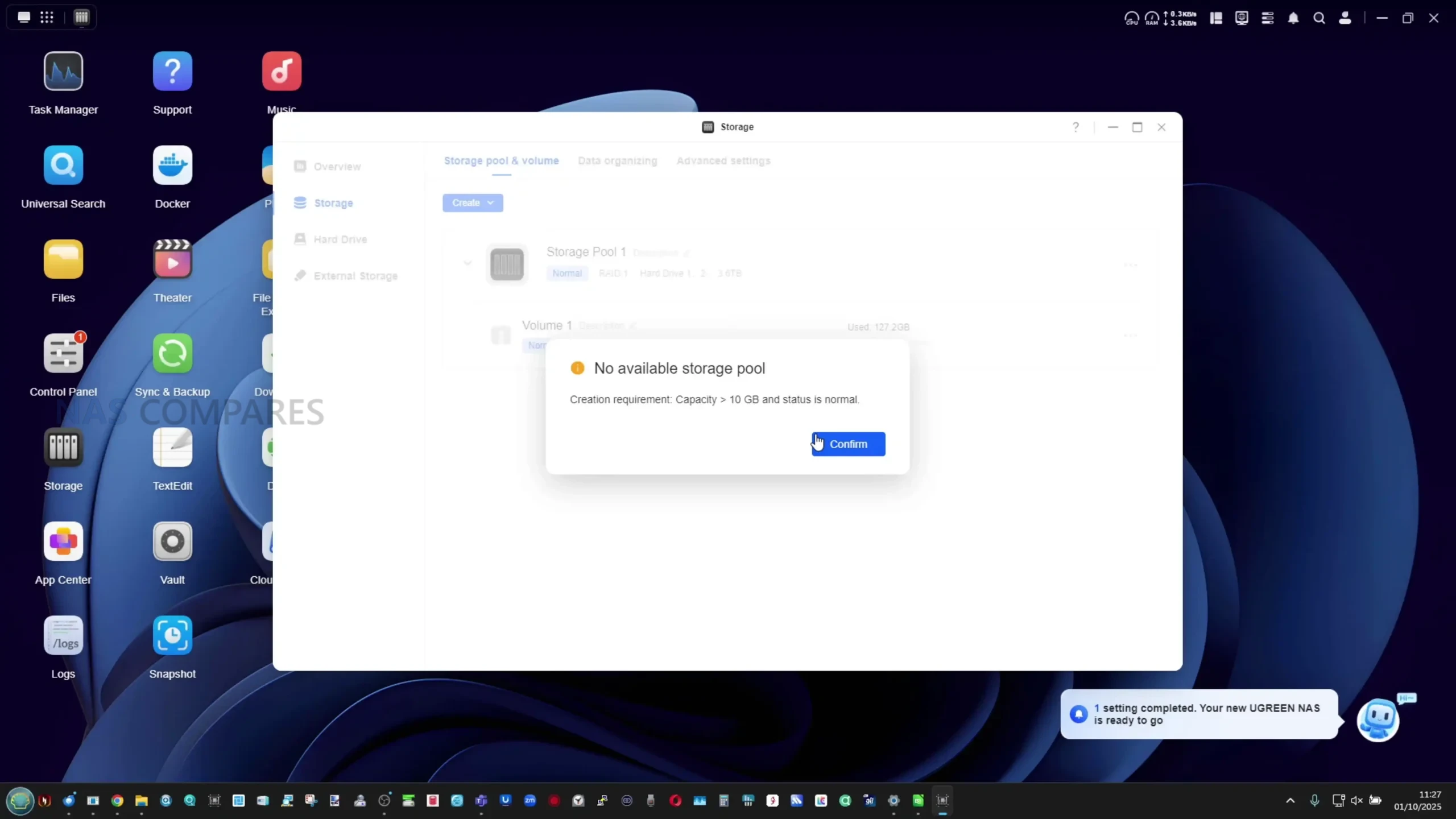 Internally, the DH2300 supports two 3.5-inch or 2.5-inch SATA drives, each connecting directly to fixed SATA connectors mounted on the board. The drive trays are basic but functional, requiring manual screw installation rather than tool-less mechanisms. Although UGREEN has not explicitly advertised hot-swapping as an official feature, testing showed that it is technically possible to replace drives without powering down, though such actions are not recommended without confirmation from official documentation. The NAS supports standard RAID configurations, including JBOD, RAID 0, and RAID 1, as well as individual drive modes, providing adequate flexibility for redundancy or performance-based setups. Storage initialization is straightforward within UGOS, with pool creation and volume setup guided by a wizard interface that fits the product’s “set-and-forget” philosophy.
