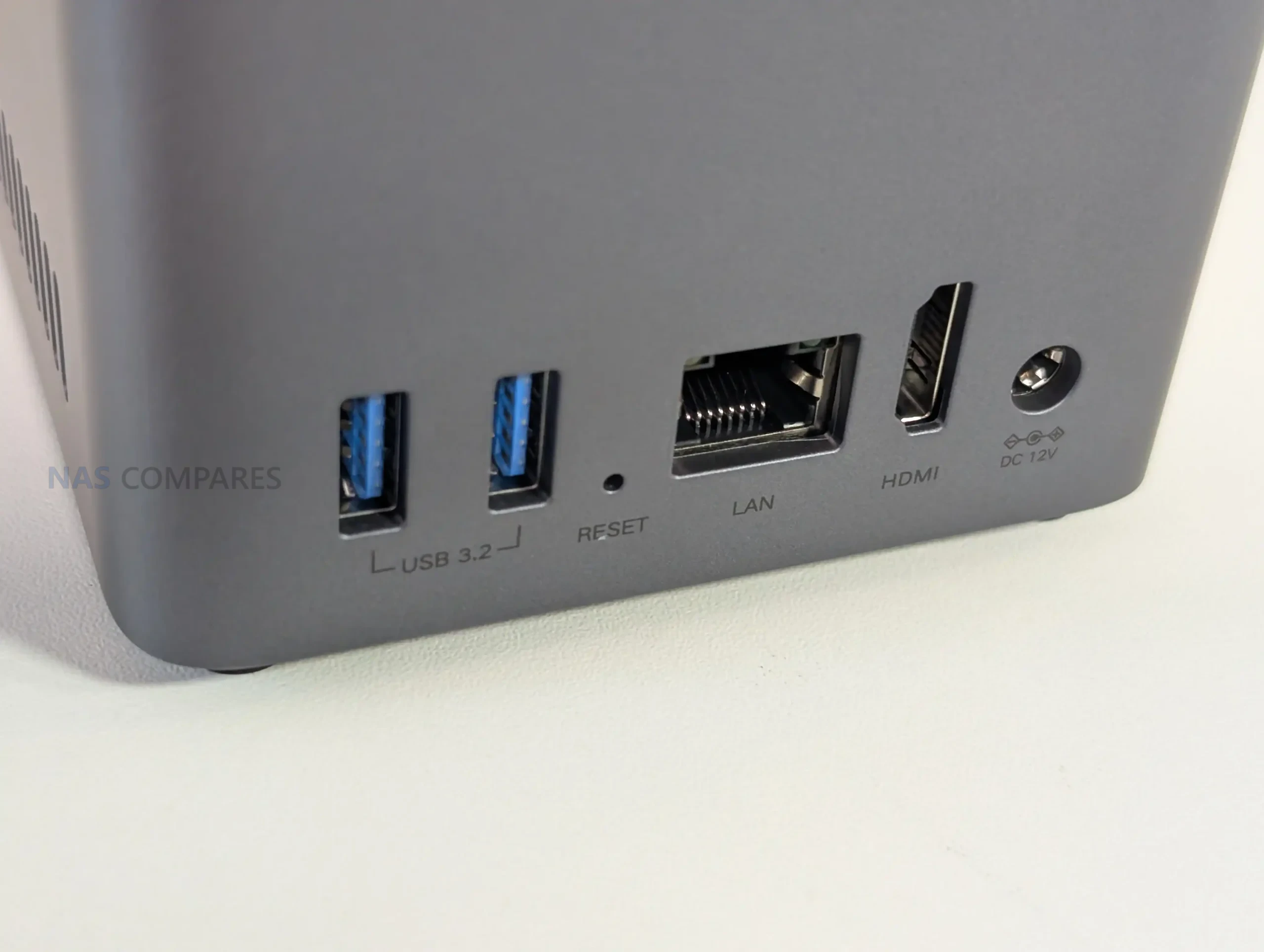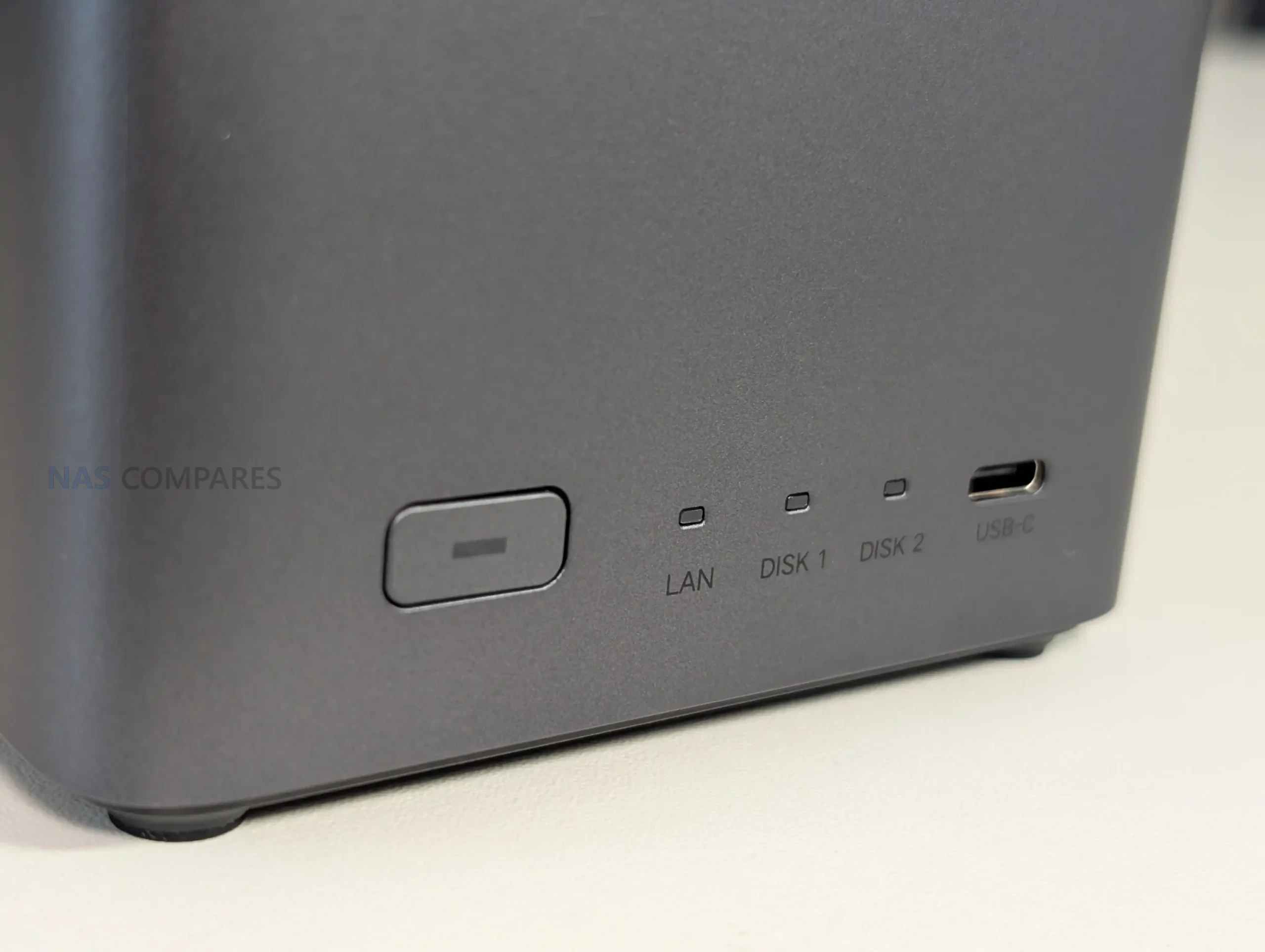 Externally, the NAS presents a modest selection of connectivity options suitable for its market position. The rear hosts a single 1GbE LAN port—adequate for most home users but a notable downgrade from the 2.5GbE interface found on UGREEN’s larger models like the DH4300. File transfers, backups, and streaming functions remain well within the limits of 1GbE for single-user environments, though network saturation can occur during multi-user access. Peripheral connectivity is handled by two USB-A 3.2 Gen 1 ports and one USB-C 3.2 Gen 1 port, all operating at 5Gbps, supporting external drives, UPS communication, or backup targets. An HDMI 2.0 port on the rear supports 4K60 output for local playback or display configuration, while system LEDs provide visual feedback for drive activity, system status, and network connection. Power is supplied by a 50W external adapter that connects via a barrel plug, keeping internal temperatures and noise low by externalizing the PSU.