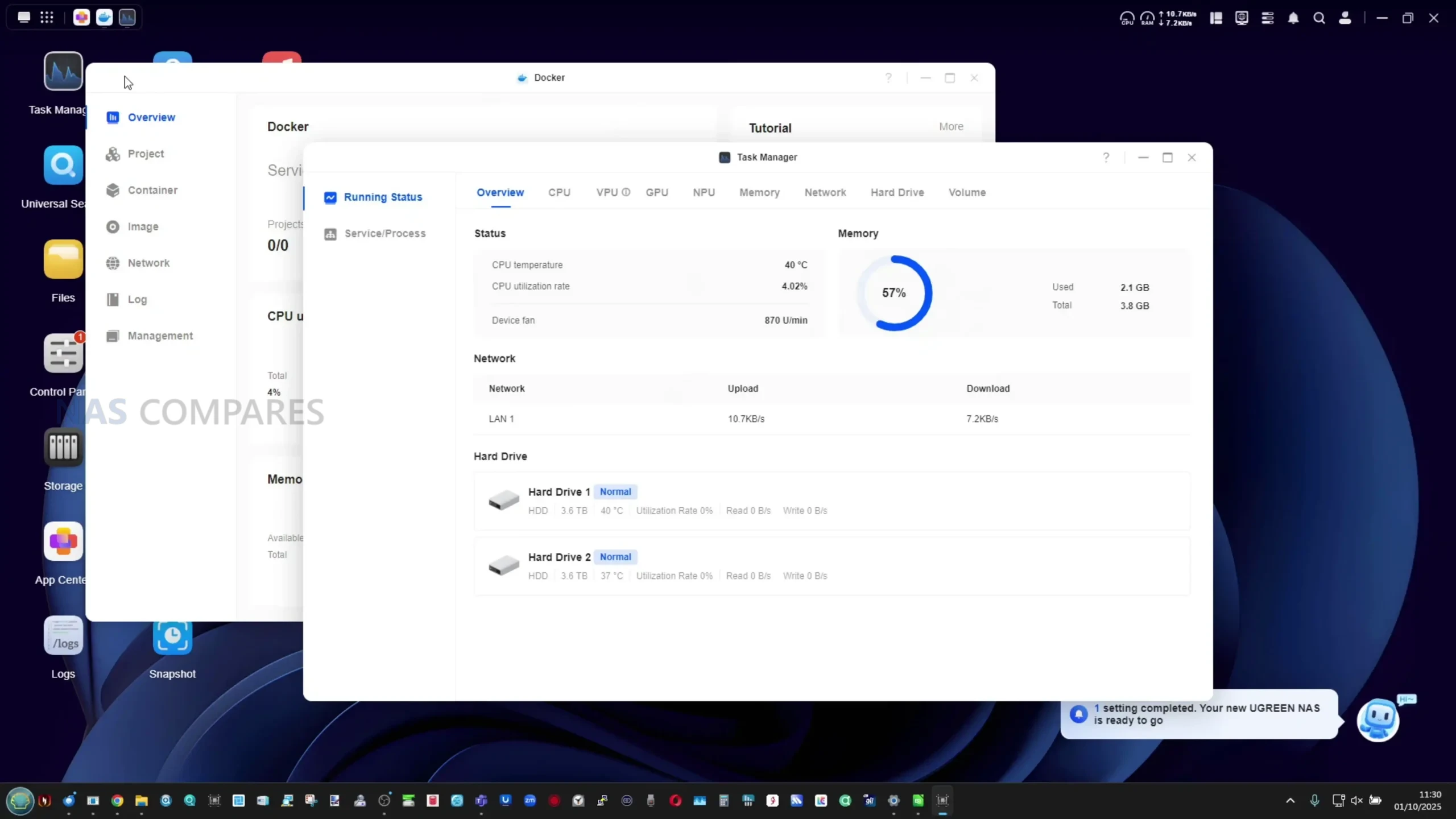 UGREEN’s DH2300 runs the company’s proprietary UGOS Pro, a Linux-based operating system tailored for simplicity and everyday use. The interface mirrors the design language of mainstream consumer cloud platforms, featuring a desktop-style environment with drag-and-drop file management, live system monitoring, and user account controls. Although UGOS Pro shares much of its design and functionality with that found on UGREEN’s larger DH4300 model, a few service limitations appear due to the ARM-based architecture of the DH2300. These include the absence of virtual machine support and limited resource capacity for multiple Docker containers, stemming from the 4GB of fixed memory. Nonetheless, the software remains fully featured for file storage, synchronization, multimedia management, and light AI applications, and receives regular over-the-air updates that refine usability and security. The desktop and mobile clients also synchronize settings seamlessly, allowing users to manage their NAS both locally and remotely.
