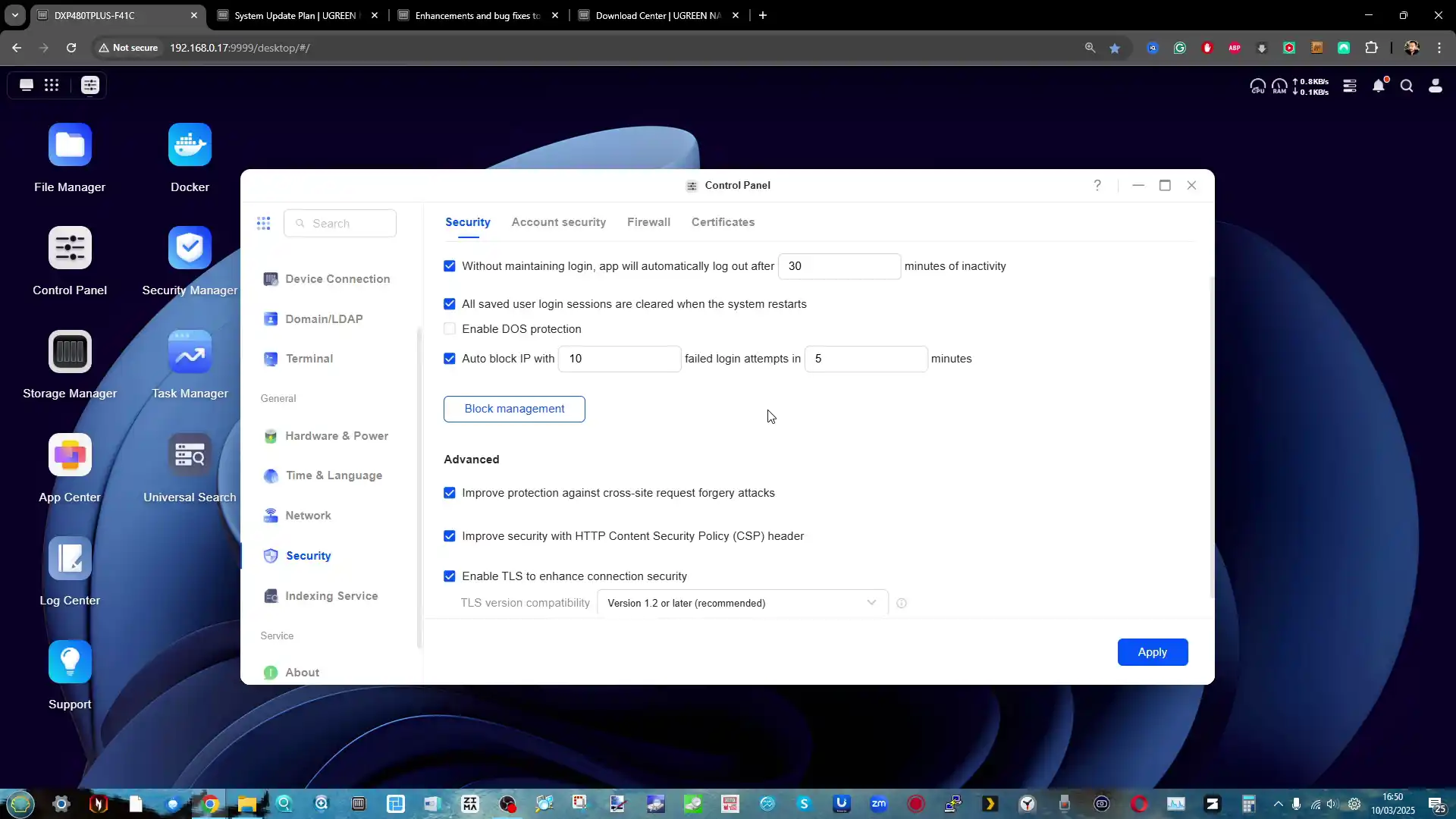 Where UGOS Pro still shows gaps is less about missing basic NAS features and more about the absence of certain mature ecosystem level tools that established competitors provide. There is no ZFS option in the platform’s storage stack, which will matter to users who specifically want ZFS features and workflows, and the application ecosystem still lacks certain expected first party packages, with Plex media server being the most obvious omission in your evaluation despite alternatives like Jellyfin being possible. Security tooling is also mixed, with useful features such as 2FA, firewall controls, and automatic blocking, but without a comprehensive security posture scanner that audits weak passwords, exposed services, open ports, and other common misconfigurations in a way that guides less technical owners. The end result is a software platform that can cover the core NAS job for many users, but may still push power users toward third party operating systems or additional manual administration depending on priorities.