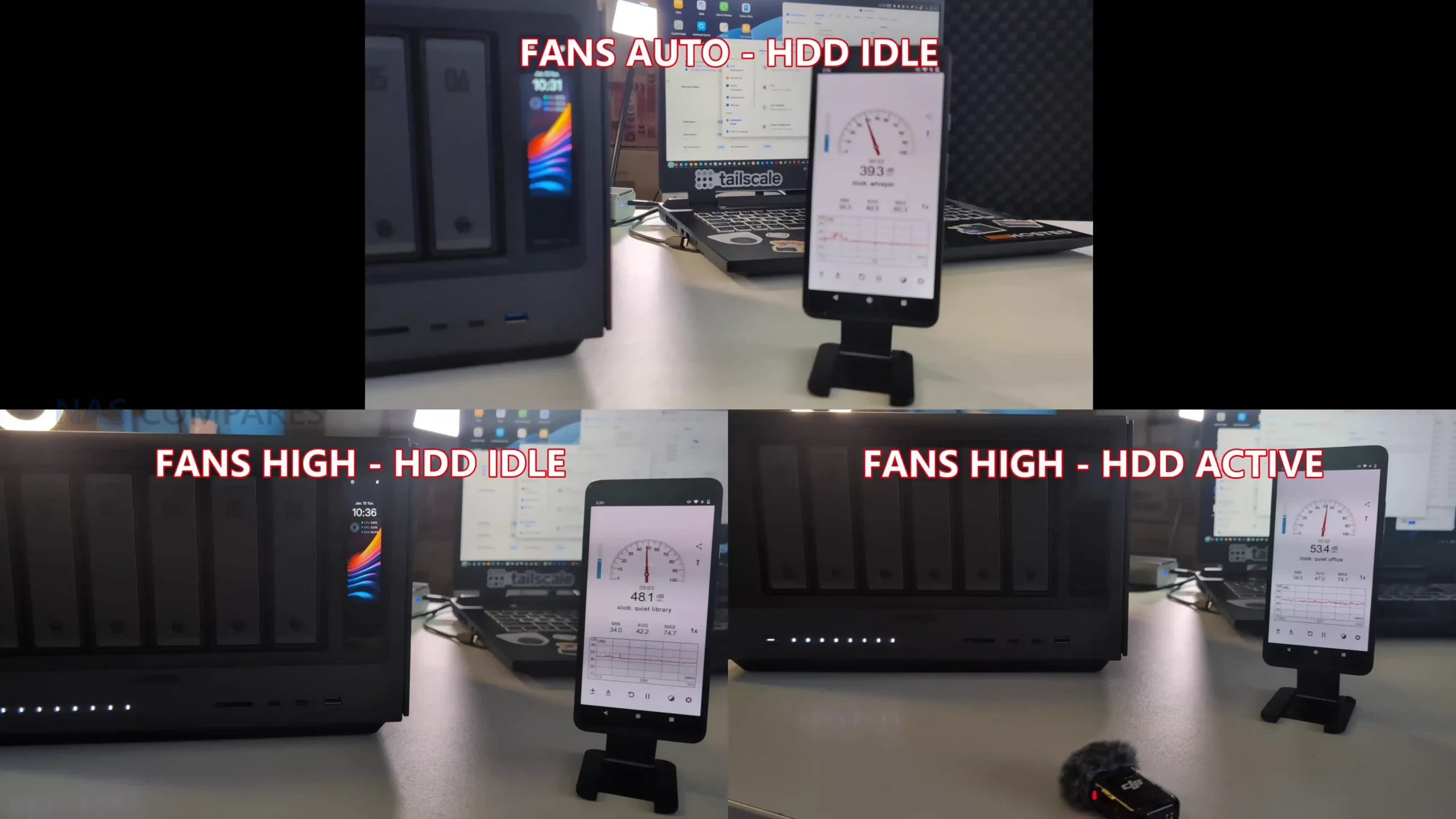 Noise and power draw reflect the fact that this is a higher performance NAS platform with 6 drive density and a stronger CPU class than low power appliances. With fans set to the lowest mode and drives idling after RAID setup and synchronisation, noise landed around 39 to 40 dBA, rising to around 40 to 43 dBA on automatic fan mode. With fans set to maximum, idle noise increased to around 48 dBA, and with active drive access plus high fan mode, measurements were around 50 to 51 dBA using 64TB NAS class HDDs, with the reminder that a metal chassis can transmit drive vibration and seek noise more readily than plastic enclosures. Power draw in a heavily populated configuration with 6 x 64TB drives, 2 x 1TB NVMe, and both 10GbE links active was around 67 to 68W at idle, rising to around 93 to 100W plus under active access, with the expectation that sustained CPU intensive AI tasks and any external GPU usage could push consumption substantially higher than typical home NAS patterns.
