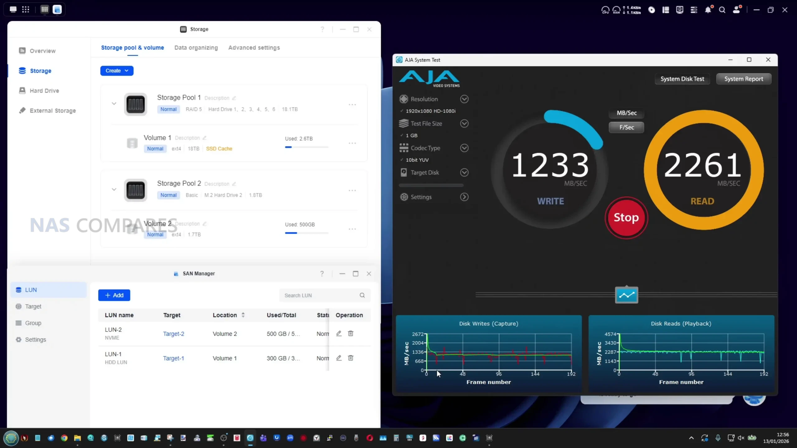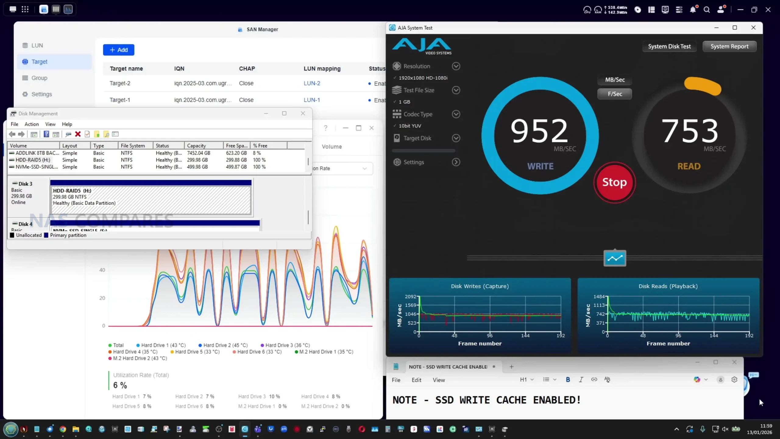 • RAID and cache test: 6 HDDs in RAID 5, SSD read/write cache enabled