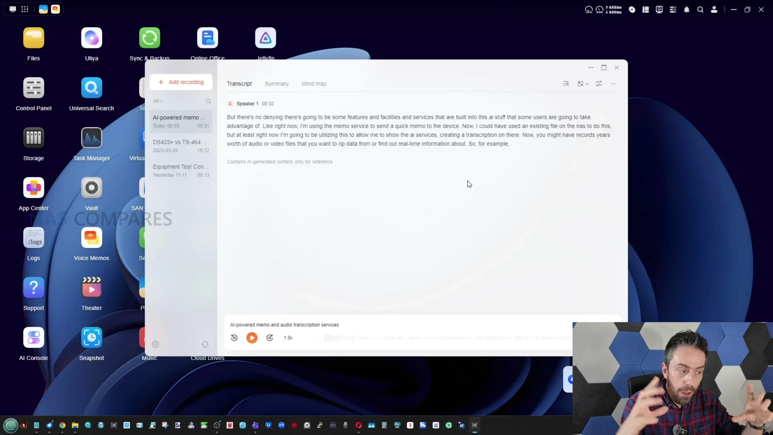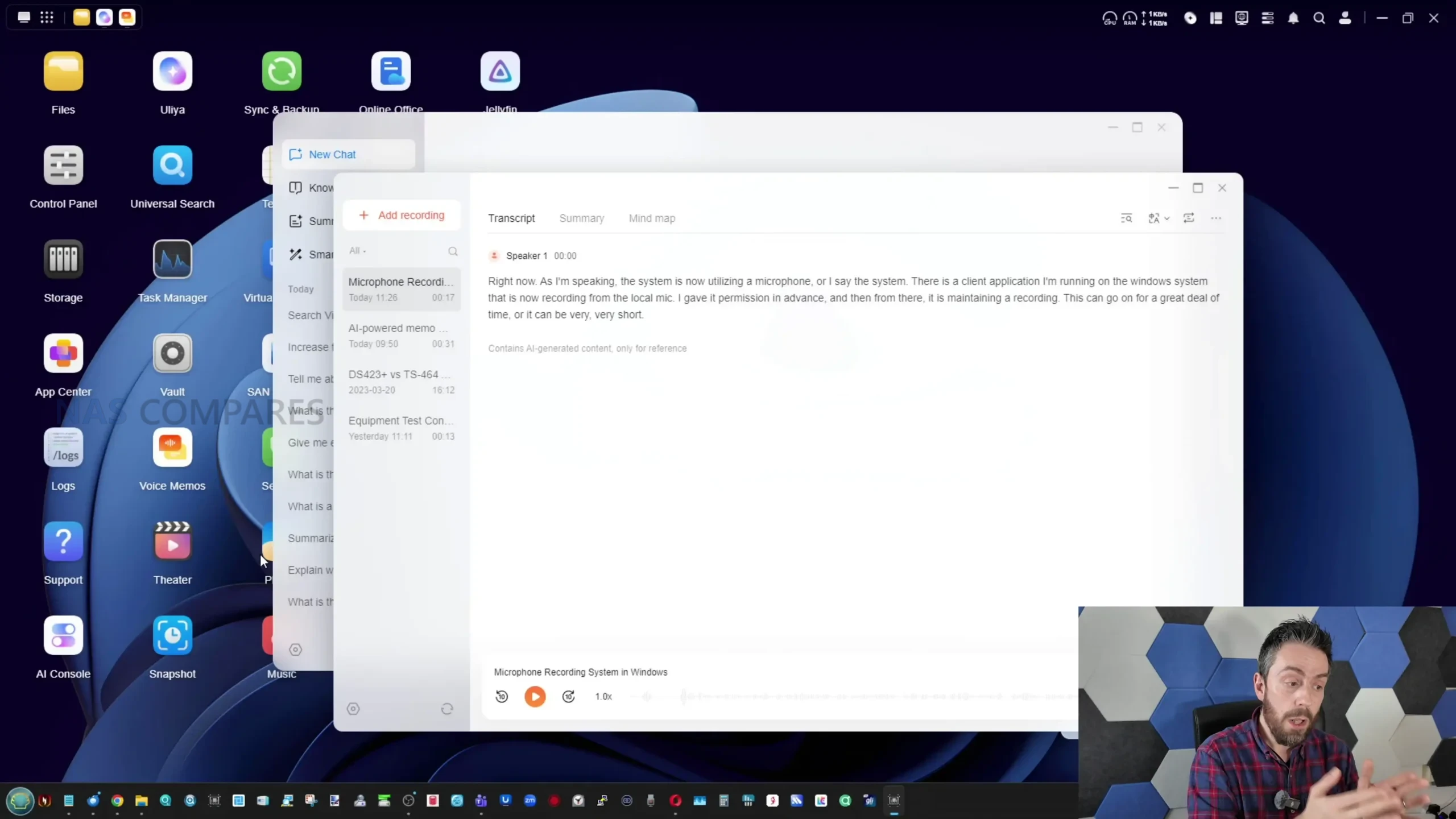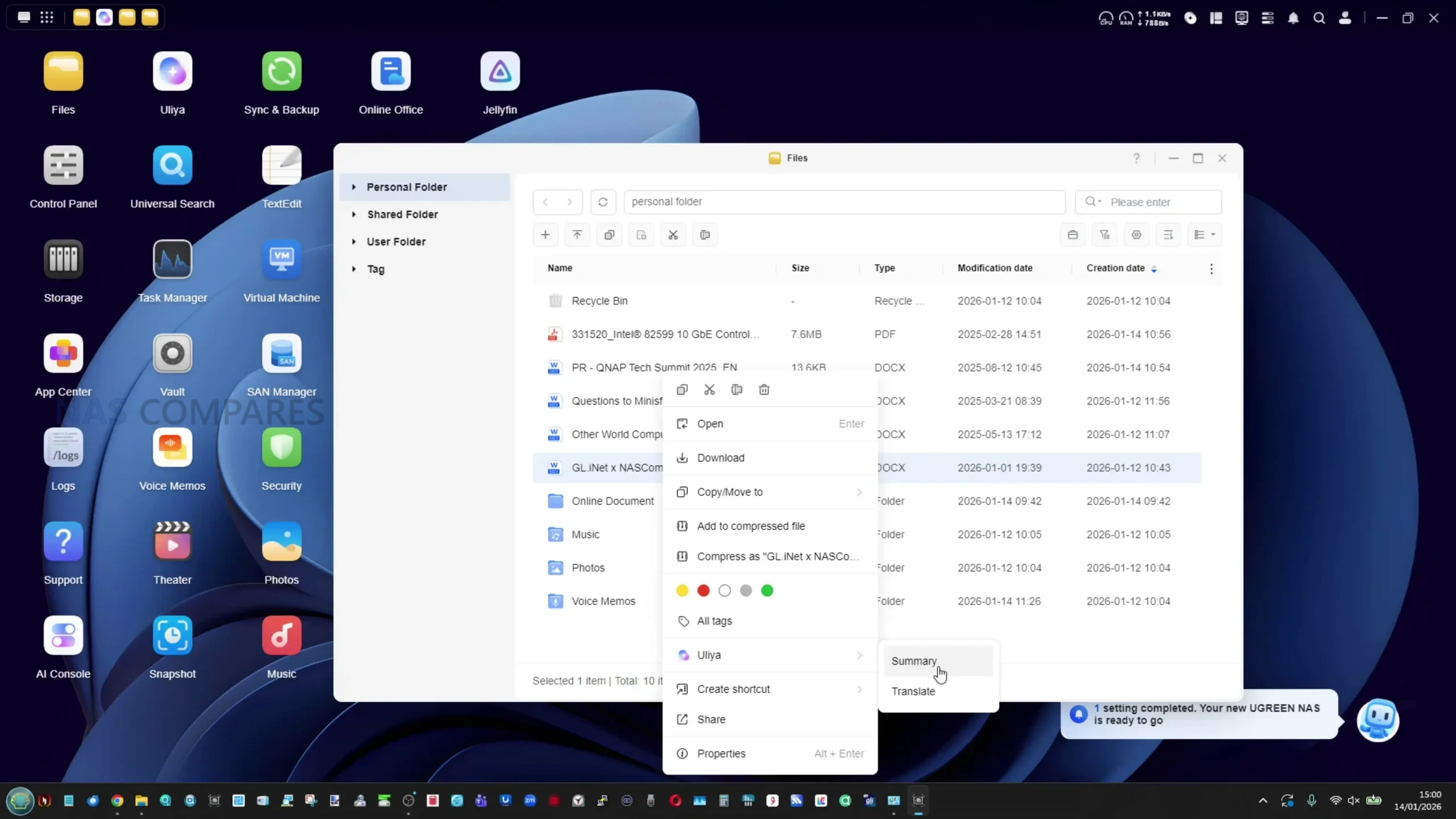 What it can do in its current form is focused on analysis, summarisation, and retrieval rather than creation. Uliya supports conversational queries that can operate offline using local resources, with optional online search when enabled, and it can accept uploaded files for analysis, including images that it can describe at a basic content level. Document handling is one of the more practically useful parts, because the system can summarise documents and PDFs and then allow follow up questions based on that output, and this capability is integrated into the file manager via right click actions for supported file types. The voice memo tool extends this into audio, allowing recordings or imported audio files to be transcribed, summarised, and represented as a basic topic map, with export and translation options available using local processing for supported languages. Separately, UGREEN’s existing photo management features include recognition and categorisation that can identify people and other elements in photo libraries, and this part of the platform appears more mature than the newer assistant workflows.