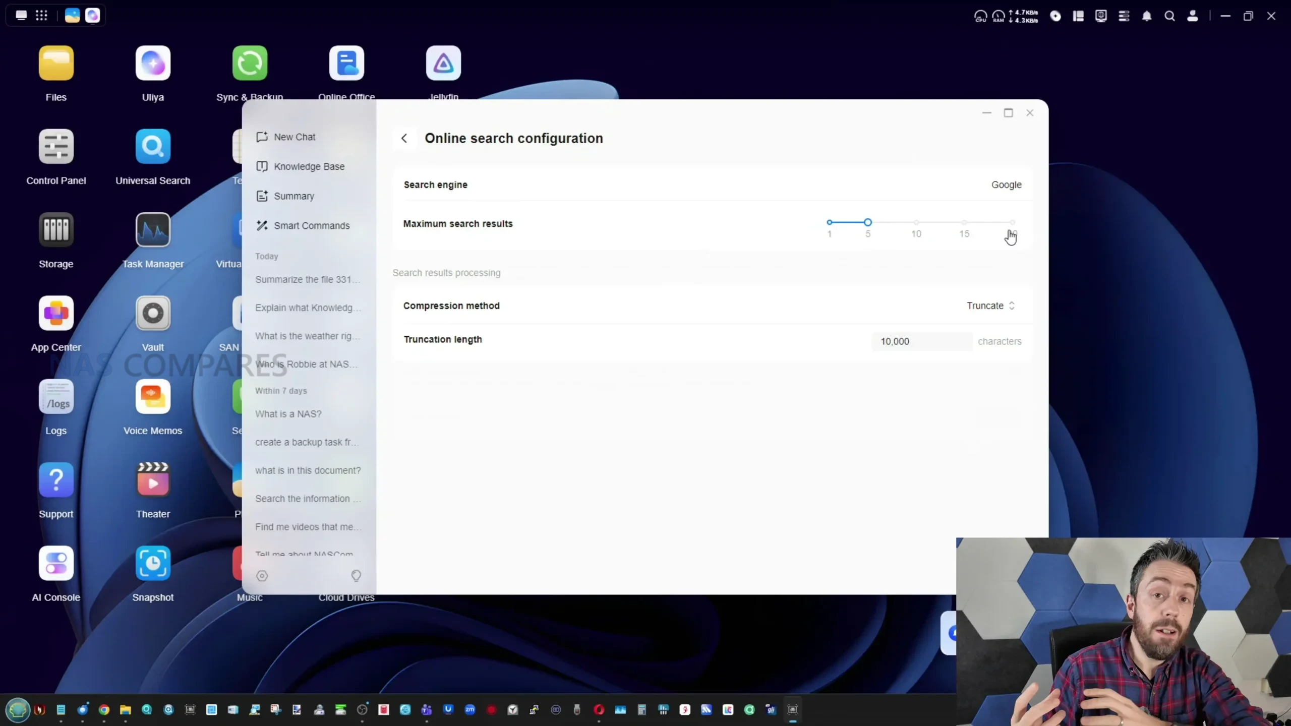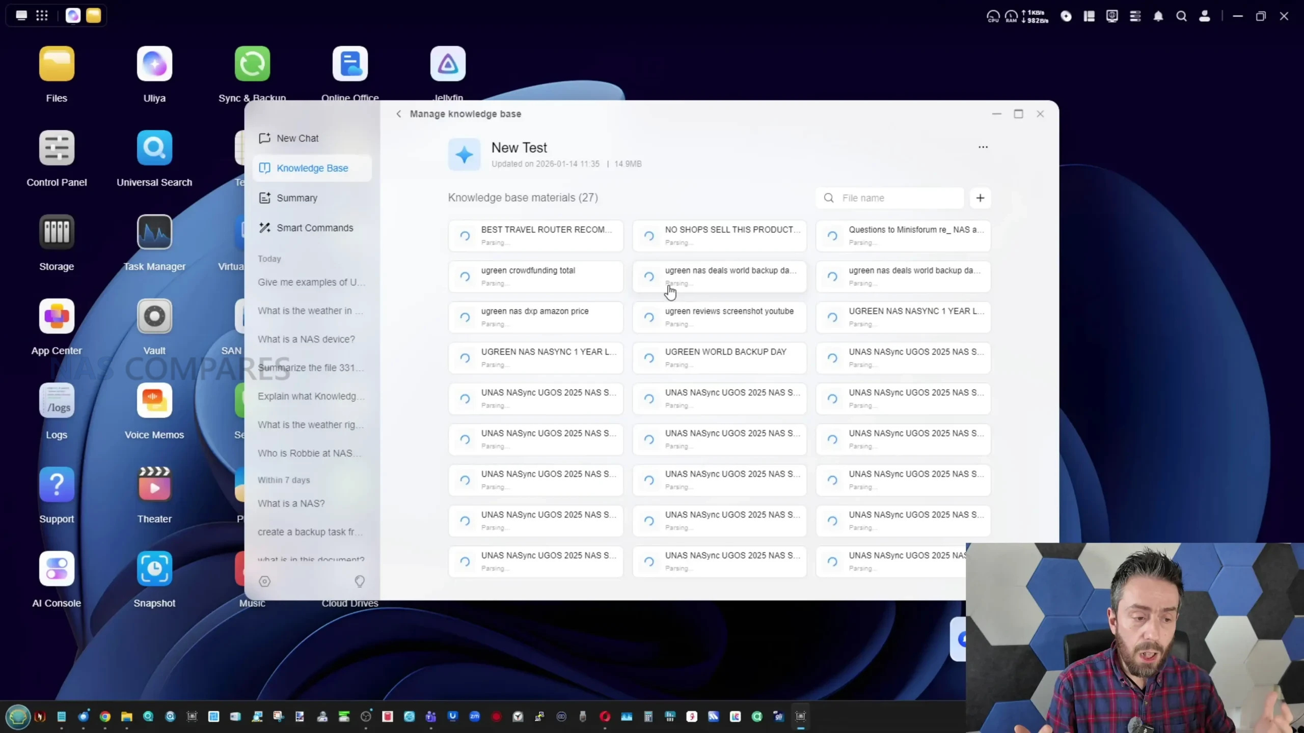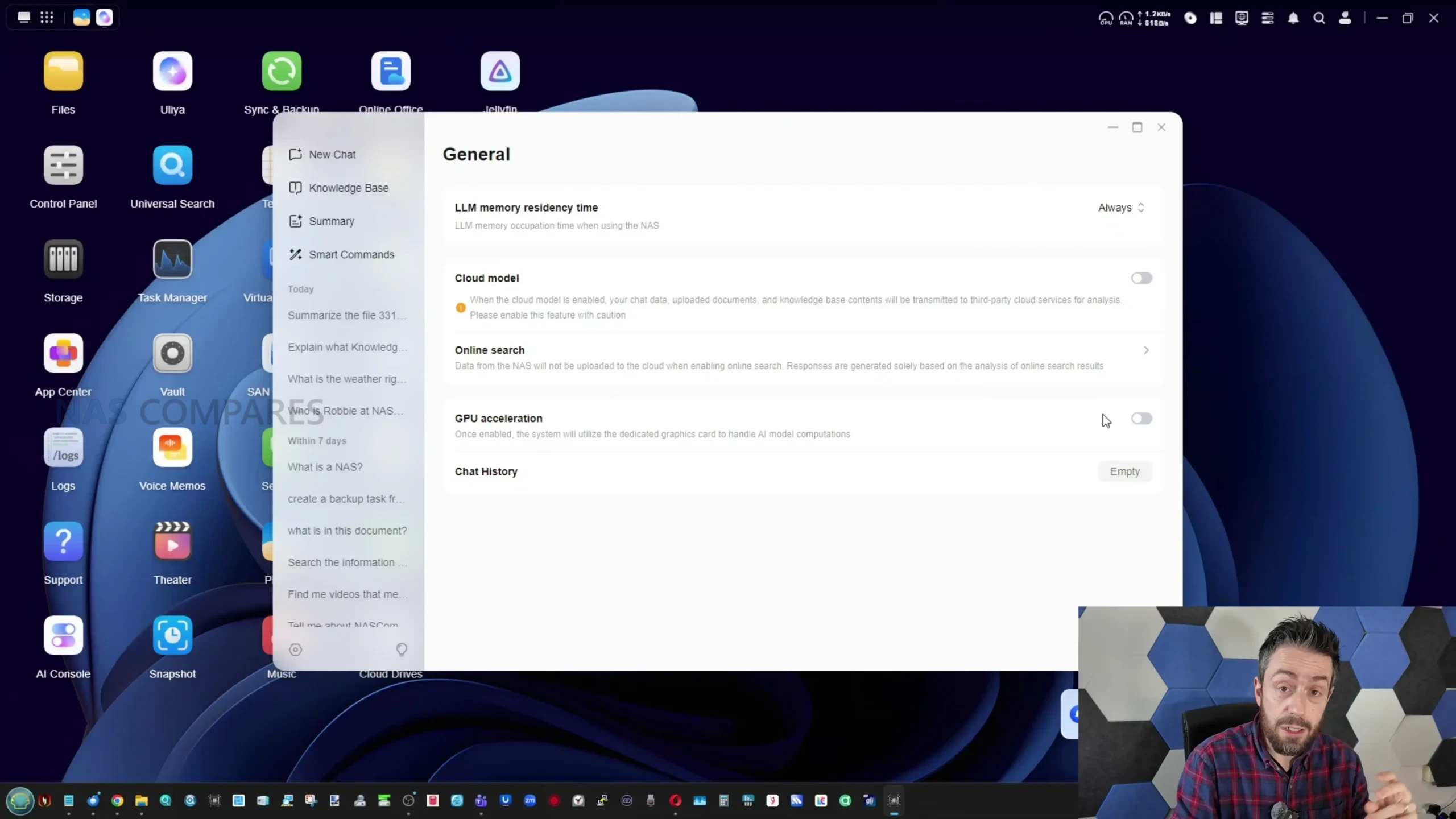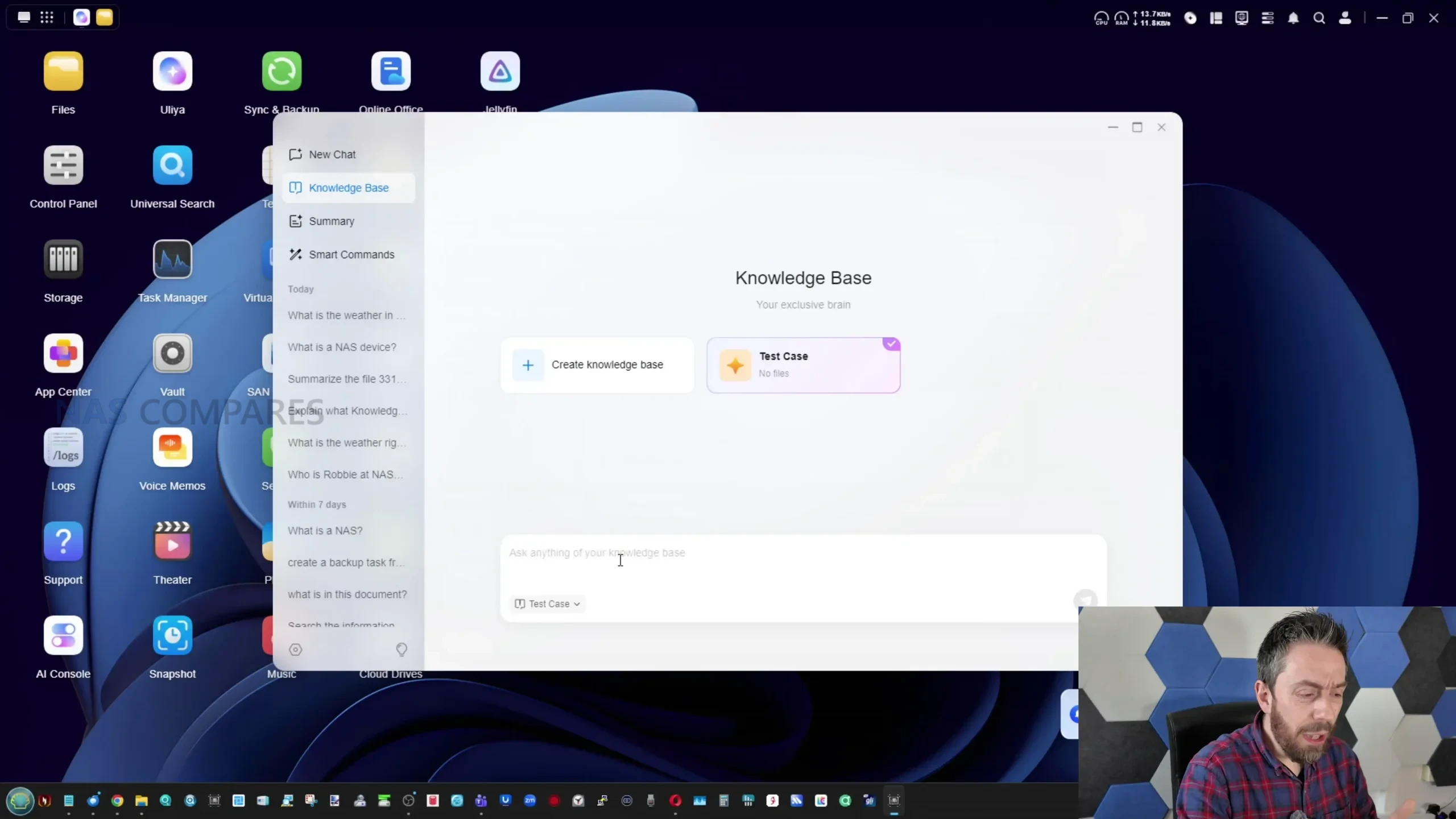 What it cannot do is equally important, because some of the expected behaviours associated with “AI NAS” marketing are either absent or only partially implemented. There is no generative photo or video creation feature set, so the AI functionality is limited to text generation, transcription, and content analysis rather than producing new media. The system also does not currently provide broad pre scraping of user libraries in the way some users might expect, where a chosen directory is crawled in the background so that later conversational queries can pull from an already indexed knowledge store. Instead, several workflows rely on manual file uploads into a knowledge base, and the knowledge base itself feels under explained and inconsistent, sometimes returning incomplete or incorrect results when it cannot find enough relevant material within the data it is allowed to access. There is also limited visibility into how responses are formed, and no clear built in way to observe what portion of an answer is derived from local data versus general model knowledge when online search is disabled.