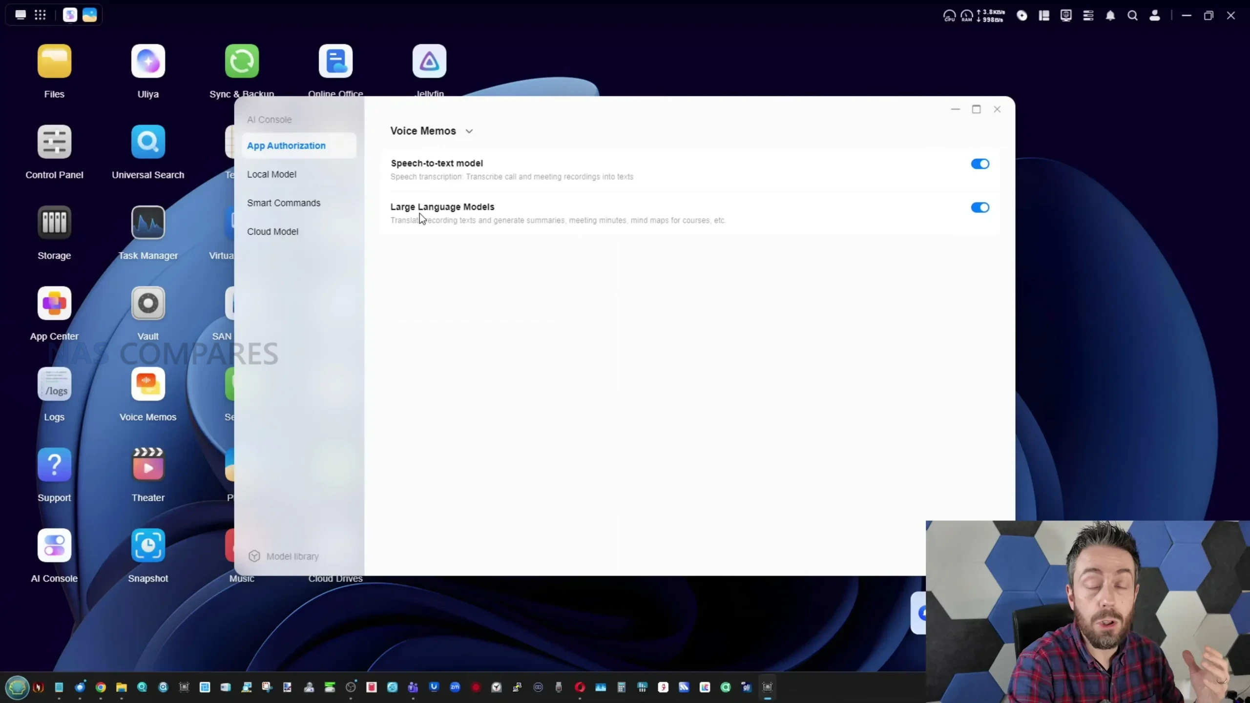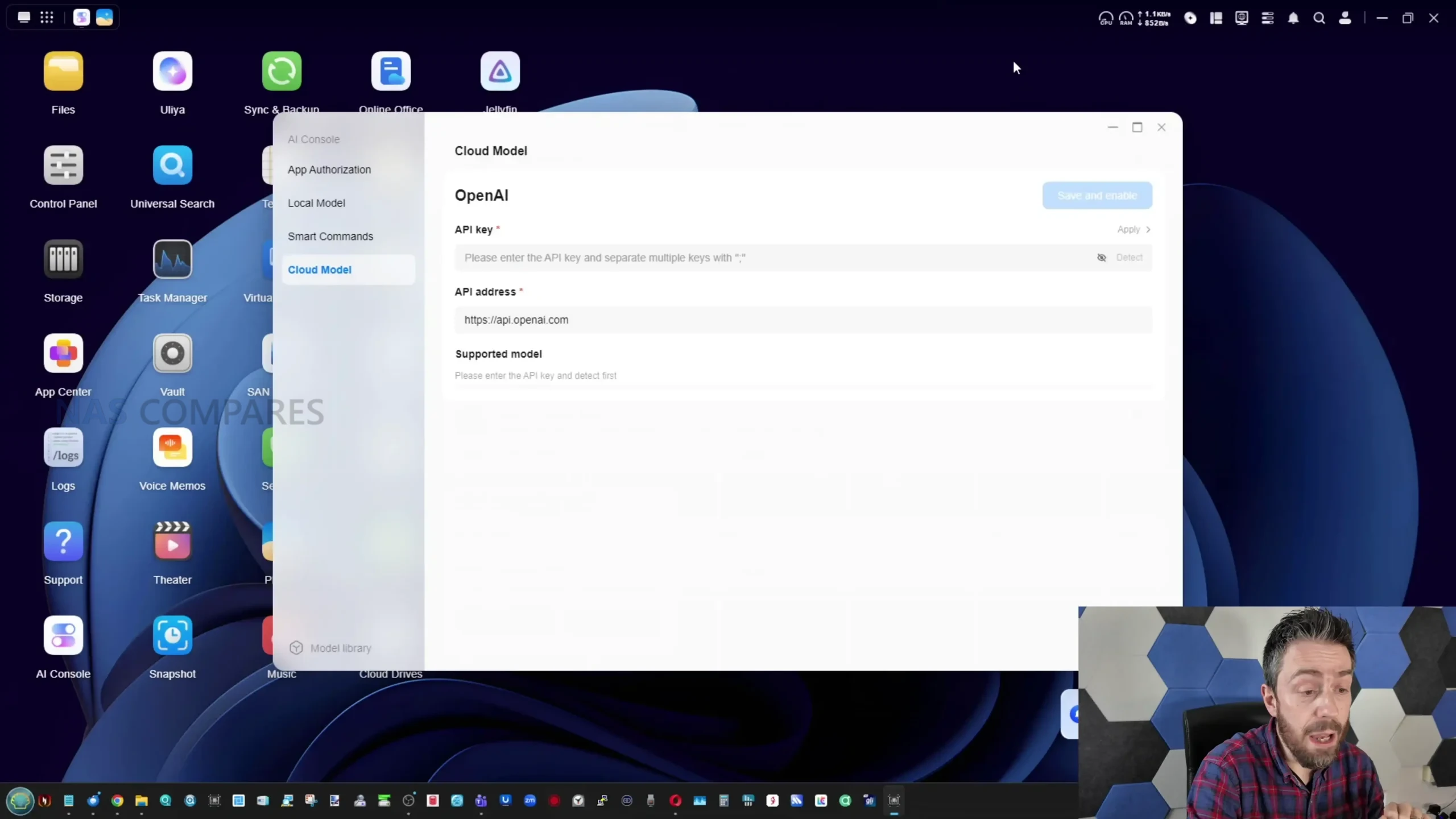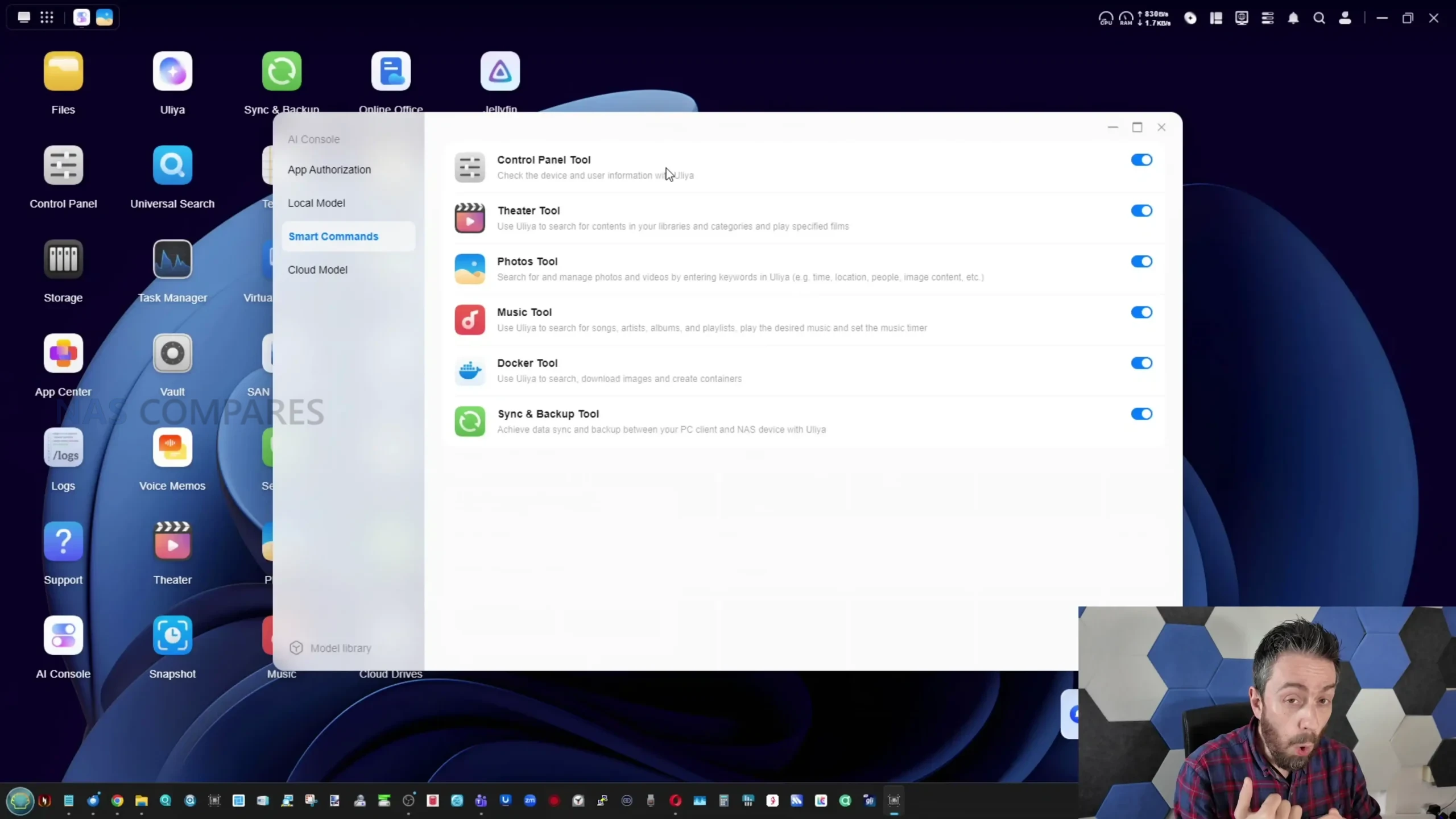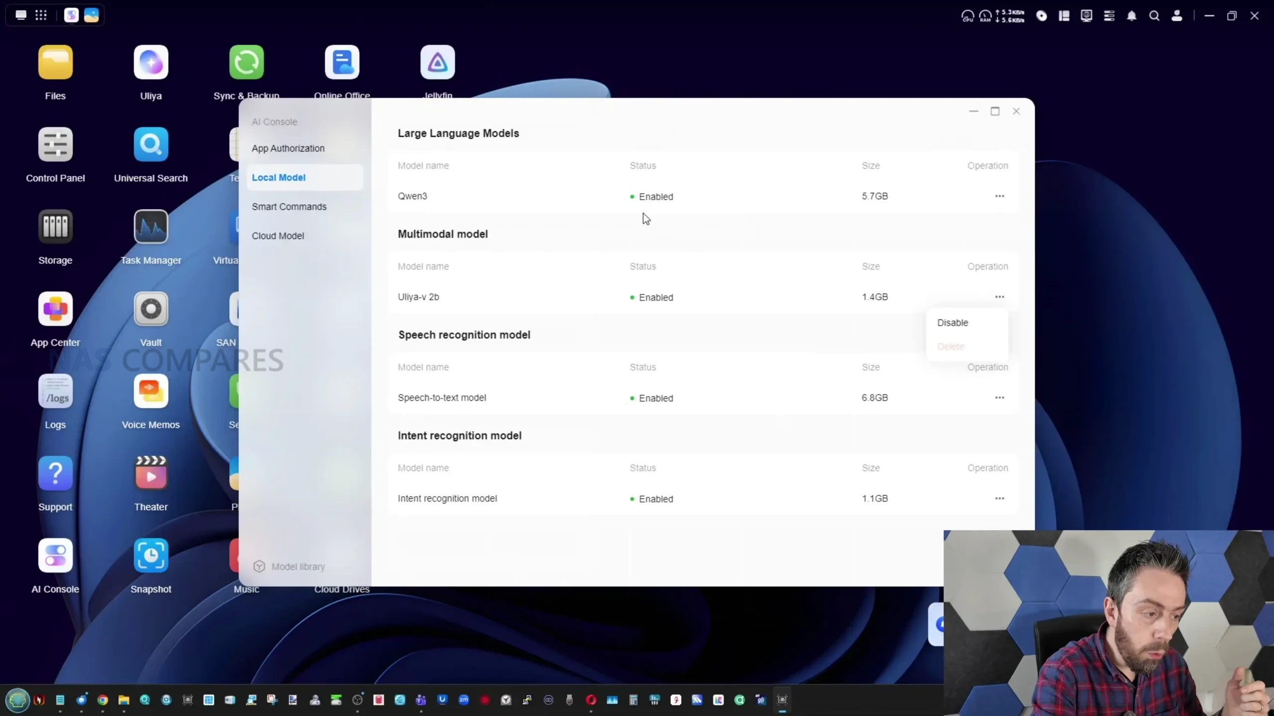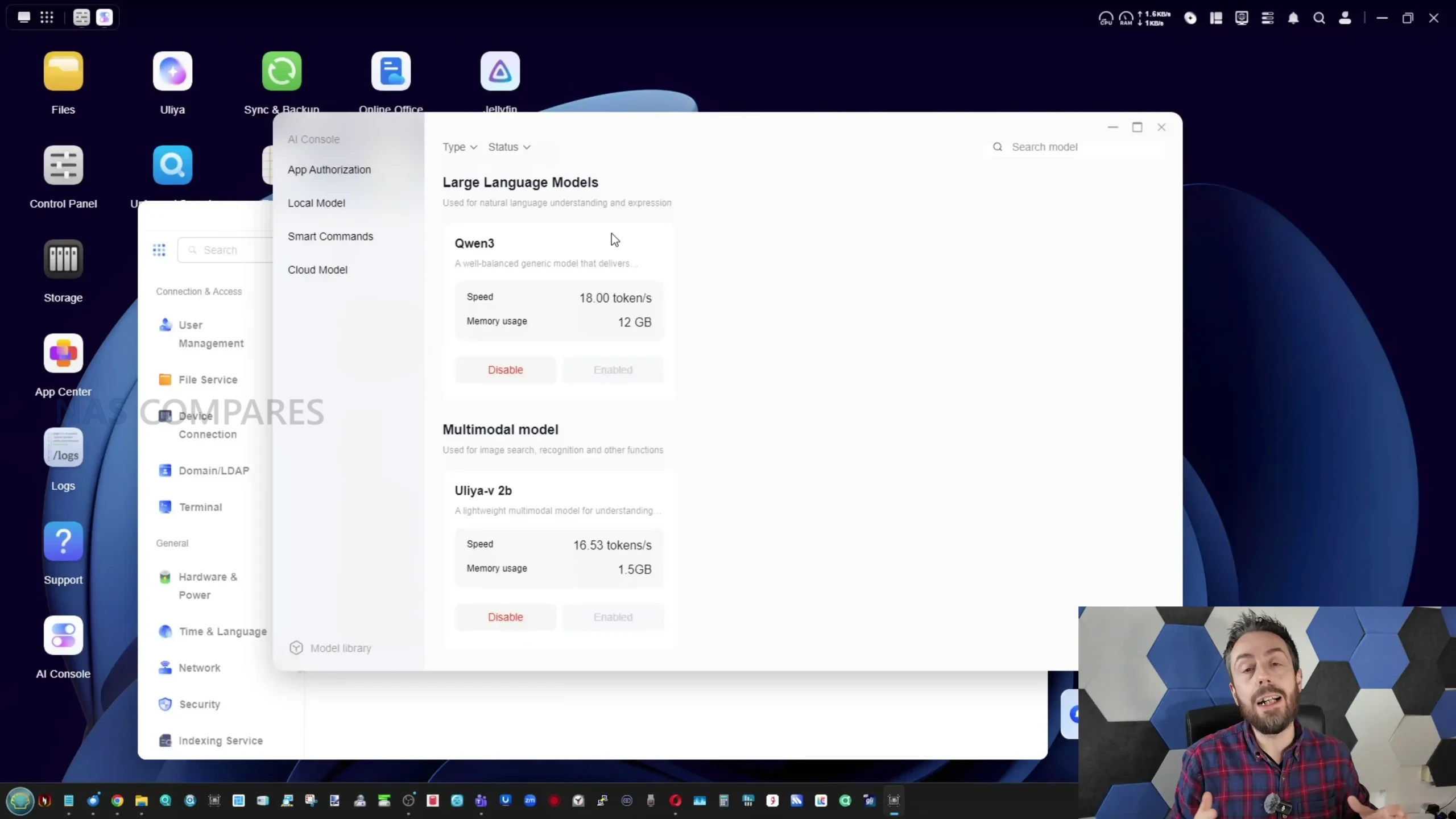 The AI layer on the iDX6011 Pro is built around Uliya, which functions as the interface for local model use and a set of assistant driven tools that sit alongside the normal UGOS experience. AI features are disabled by default on first use, and the local models are not pre installed, which means users must actively opt in and download what they want, rather than having the system continuously analyse data out of the box. Once enabled, the AI console exposes model choices and basic operational details such as estimated resource requirements, and it also includes permission style controls that determine which AI services are active, for example speech to text or large language model usage. There is also an option to connect cloud based AI providers via API key, and a separate option to allow online search as a supplement to responses, but the platform’s primary selling point is that most of its AI functions can run locally without transmitting content to a third party service.