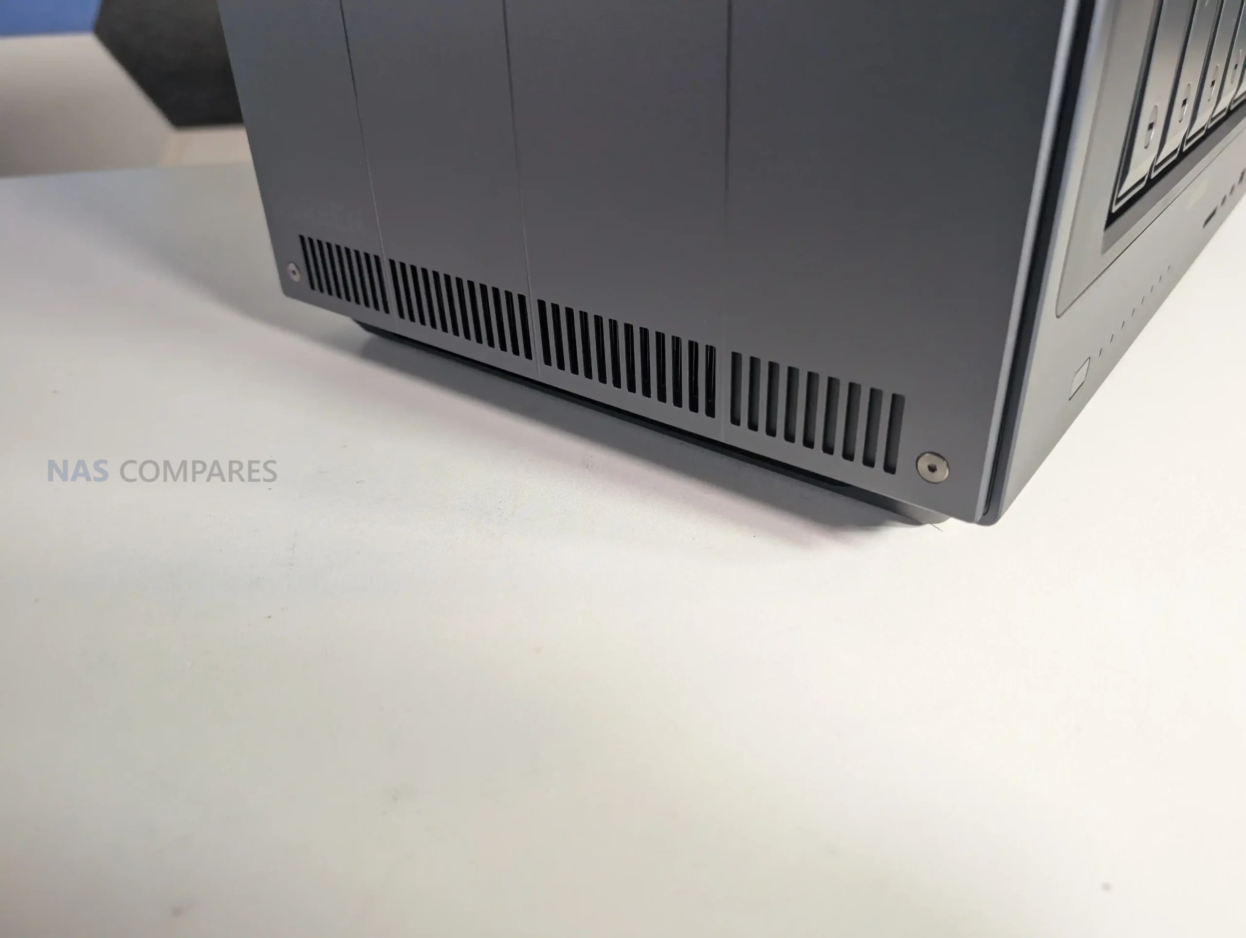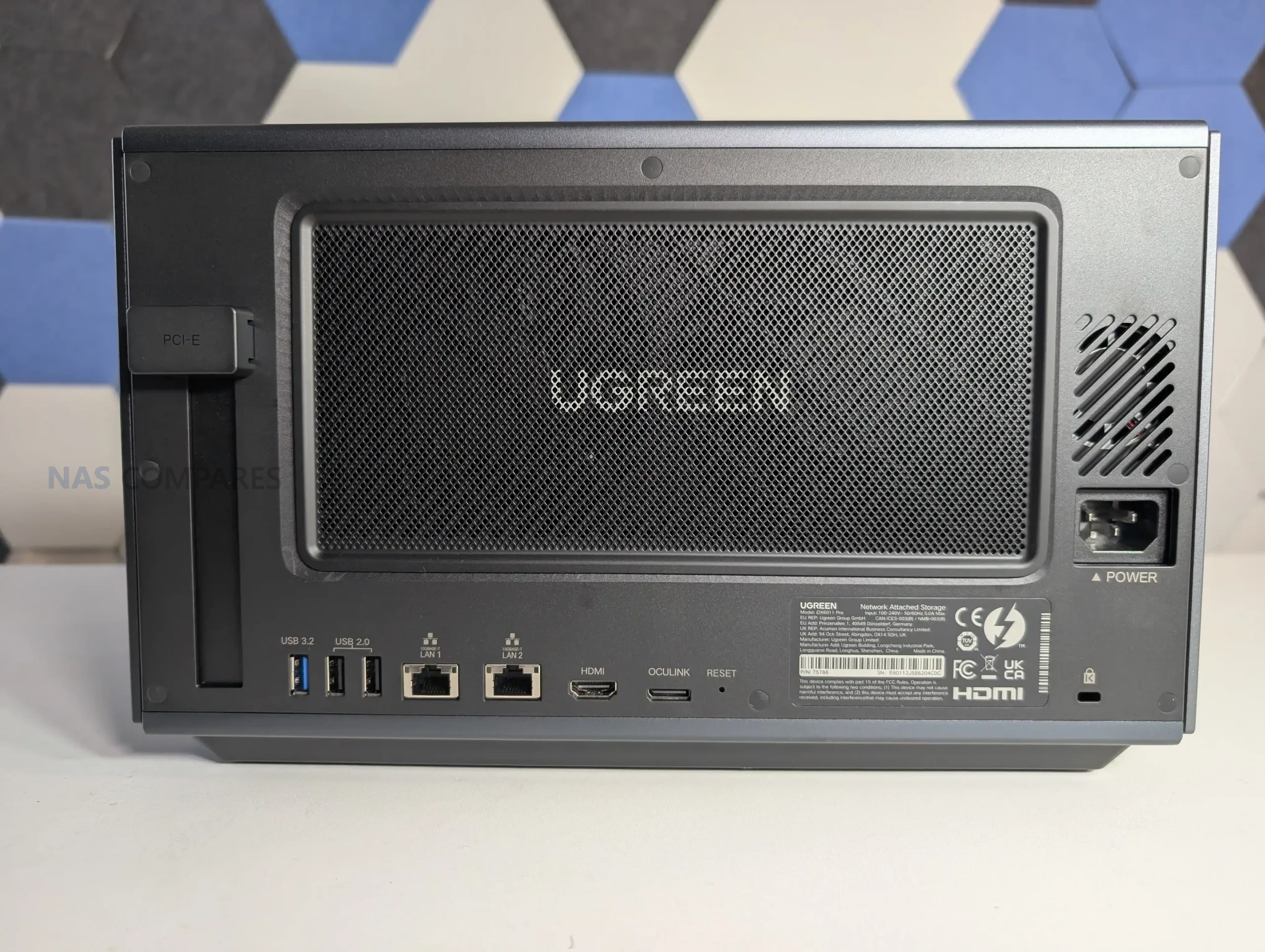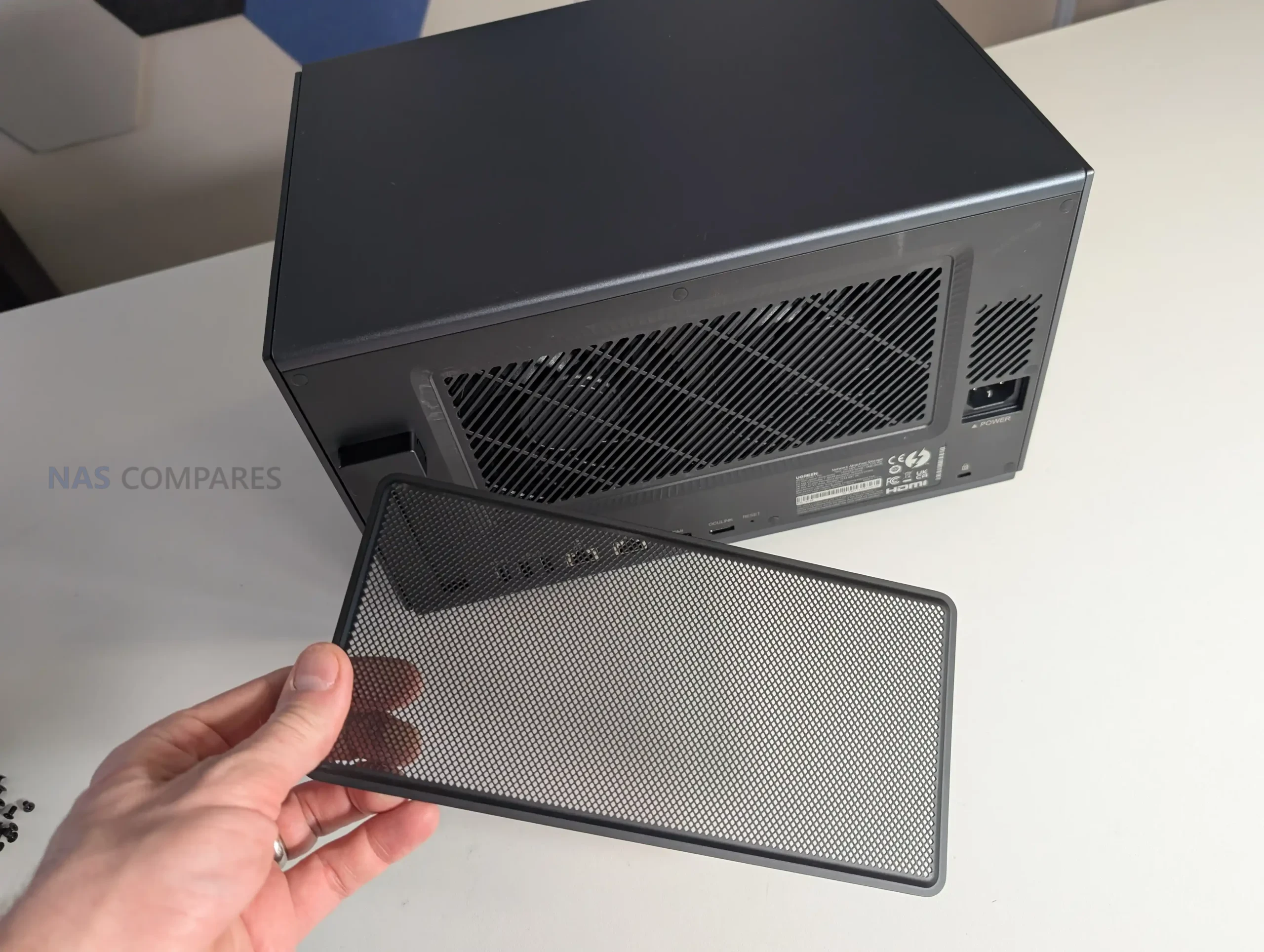 The iDX6011 Pro is physically a more industrial looking unit than UGREEN’s earlier NAS designs, with a full metal outer chassis that feels closer to workstation gear than living room appliance styling. It is not a sealed box either, as the side panels are removable and intended to give access to internal expansion areas, though the process uses a hex key rather than a simple tool free latch. That approach is functional and keeps the exterior clean, but it also makes routine access slightly slower if you expect to swap SSDs or a PCIe card regularly. Ventilation is distributed around the sides rather than concentrated in a single grille, and the chassis is raised off the surface to allow airflow beneath, which matters in a system designed to host 6 hard drives plus NVMe storage and a higher performance CPU class than entry NAS models.