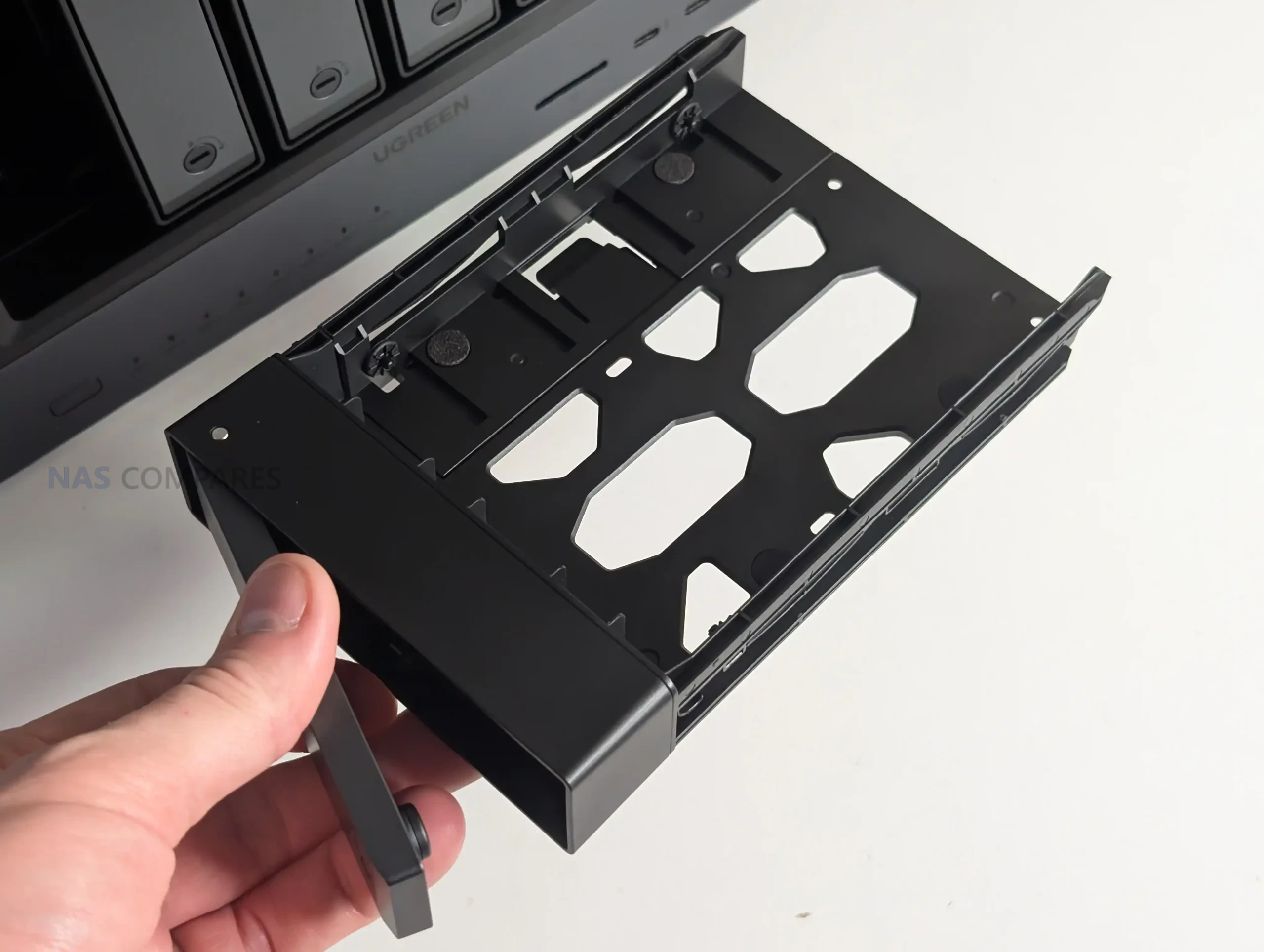 Storage capacity is built around 6 front loading SATA bays, with UGREEN quoting 196TB maximum raw capacity for the platform. Drive insertion uses the same general tray approach seen on the company’s recent NAS units, including lockable bay fronts and a plastic click and load mechanism intended to speed up installation without tools. It is a conventional arrangement for a 6 bay desktop NAS, but the metal enclosure can make drive acoustics more noticeable depending on the HDD model and rotational behaviour, which becomes relevant when users populate the unit with larger capacity drives that often have more platters and more audible seek patterns. The front bay layout is straightforward, prioritising density and serviceability, with the expectation that this is a system meant to hold a large primary library rather than act as a small secondary backup target.