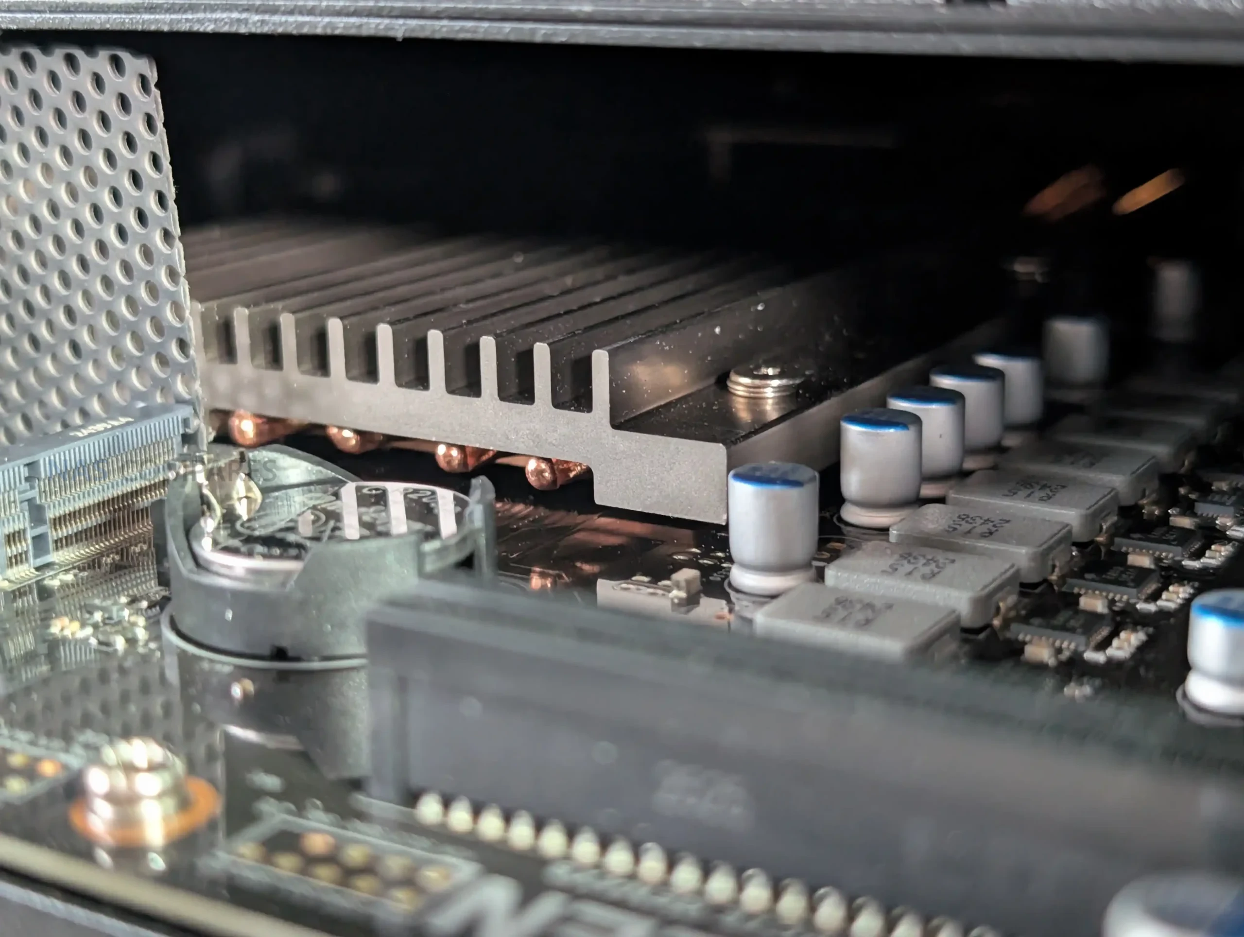 From an internal power and cooling perspective, the unit uses an internal PSU and a cooling layout that separates general chassis airflow from CPU cooling, with software fan control focused on the rear fans rather than the CPU fan assembly. That matters because the system’s CPU class, NVMe support, and expansion options can create load scenarios that are closer to small server behaviour than basic home NAS idle patterns, particularly during sustained indexing, RAID rebuilds, or heavy file operations across fast links like 10GbE and Thunderbolt.